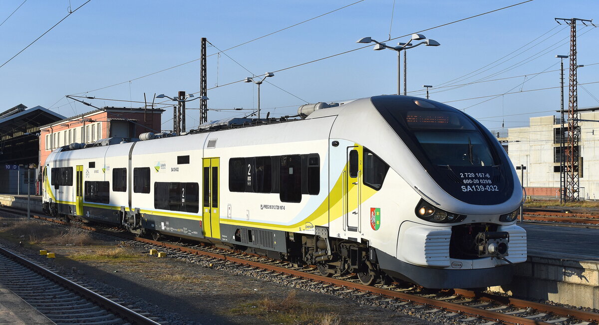 Polregio sp. z o.o. mit ihrem Pesa Link "SA139-032 / 600-20 029B " (NVR: "PL-PREG 95 51 2 720 167-6") als RB91 nach Zielona Gora Gl. in Polen am 04.03.25 Abfahrt Bahnhof Frankfurt (Oder). Lothar Stöckmann