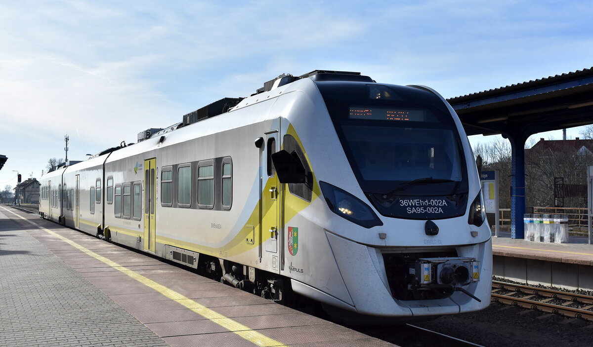 Polregio sp. z o.o. mit ihrem Zweikrafthybridtriebzug "SA95-002A / 36WEhd-002A" (NVR: "95 51 2 620 004-2 PL-PREG") als Regionalzug abfahrbereit im Bahnhof Szczecin (Polen) am 05.03.25 Lothar Stöckmann