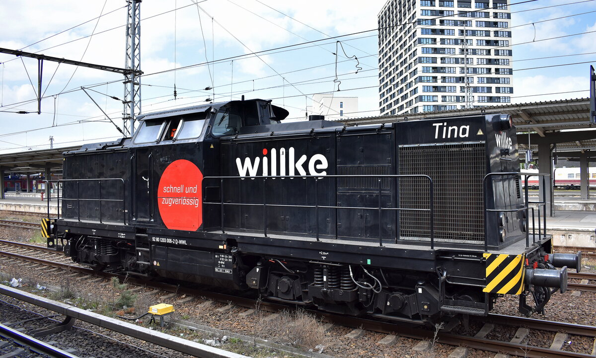 BUG Verkehrsbau AG mit der von Willke Logistics GmbH schon seit längerem angemieteten "203 006-2", Name: "Tina" [NVR-Nummer: 92 80 1203 006-2 D-WWL] am 14.04.25 Durchfahrtgleis Bahnhof Berlin Lichtenberg. Lothar Stöckmann