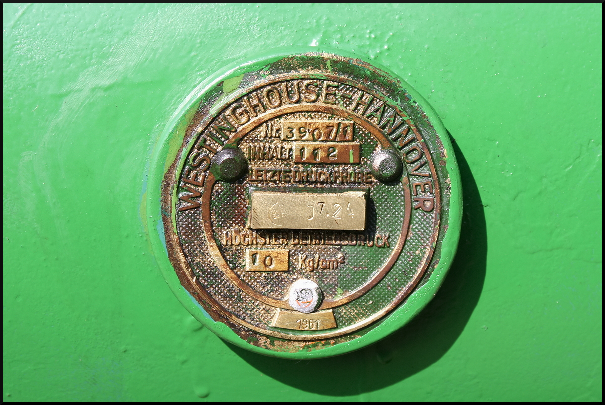 Als Detail wurde das Herstellerschild des Druckbehälters an der Seite der Windhoff LN 25 II entdeckt. Er wurde von Westinghouse-Hannover im Jahr 1961 mit der Nummer 3907/1 gebaut. Er hat ein Fassungsvolumen von 112 Liter bei einem Betriebsdruck von 10 Kg/cm2. Die letzte Prüfung erfolgte 07.2024. Frank Paukstat