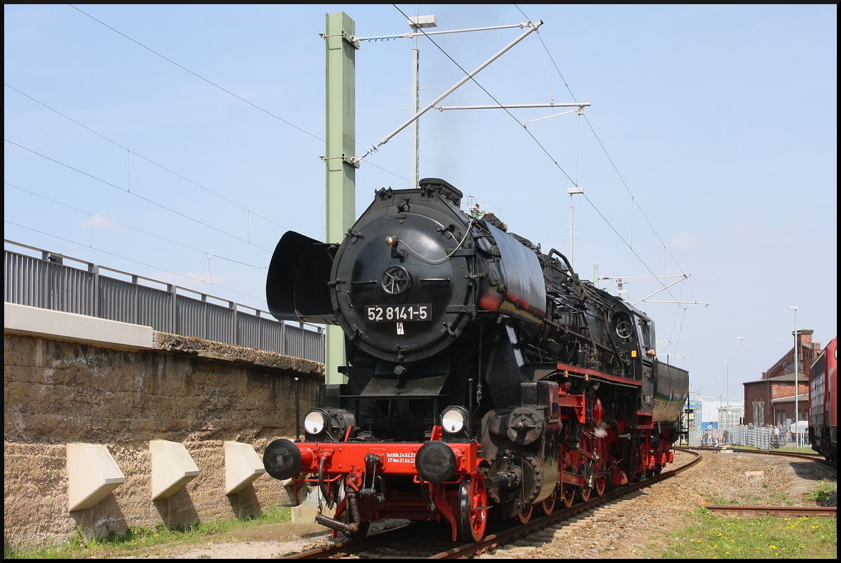 Die aus Löbau angereiste 52 8141-5, vom Typ KDL 1, stand während des 17. Dresdner Dampfloktreffen für Führerstandsmitfahrten zur Verfügung. Besonders die Kinder nutzten das am 12.04.2025 rege. Hier ist die Dampflok gerade auf Höhe der Schiebebühne.