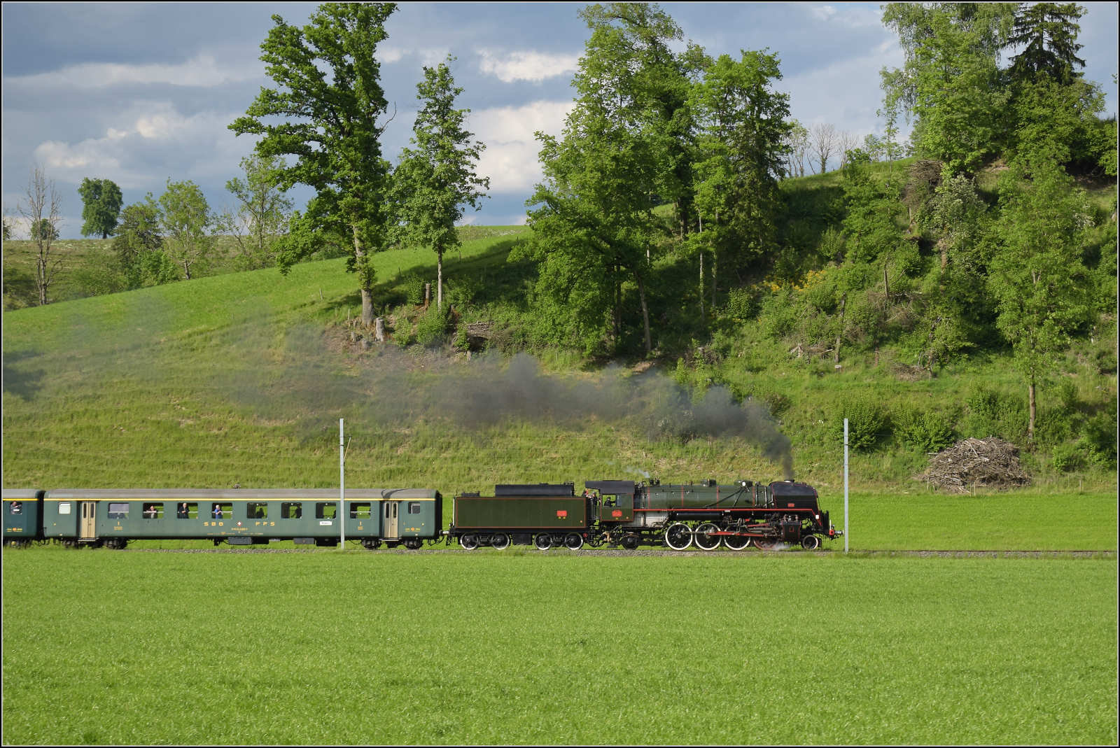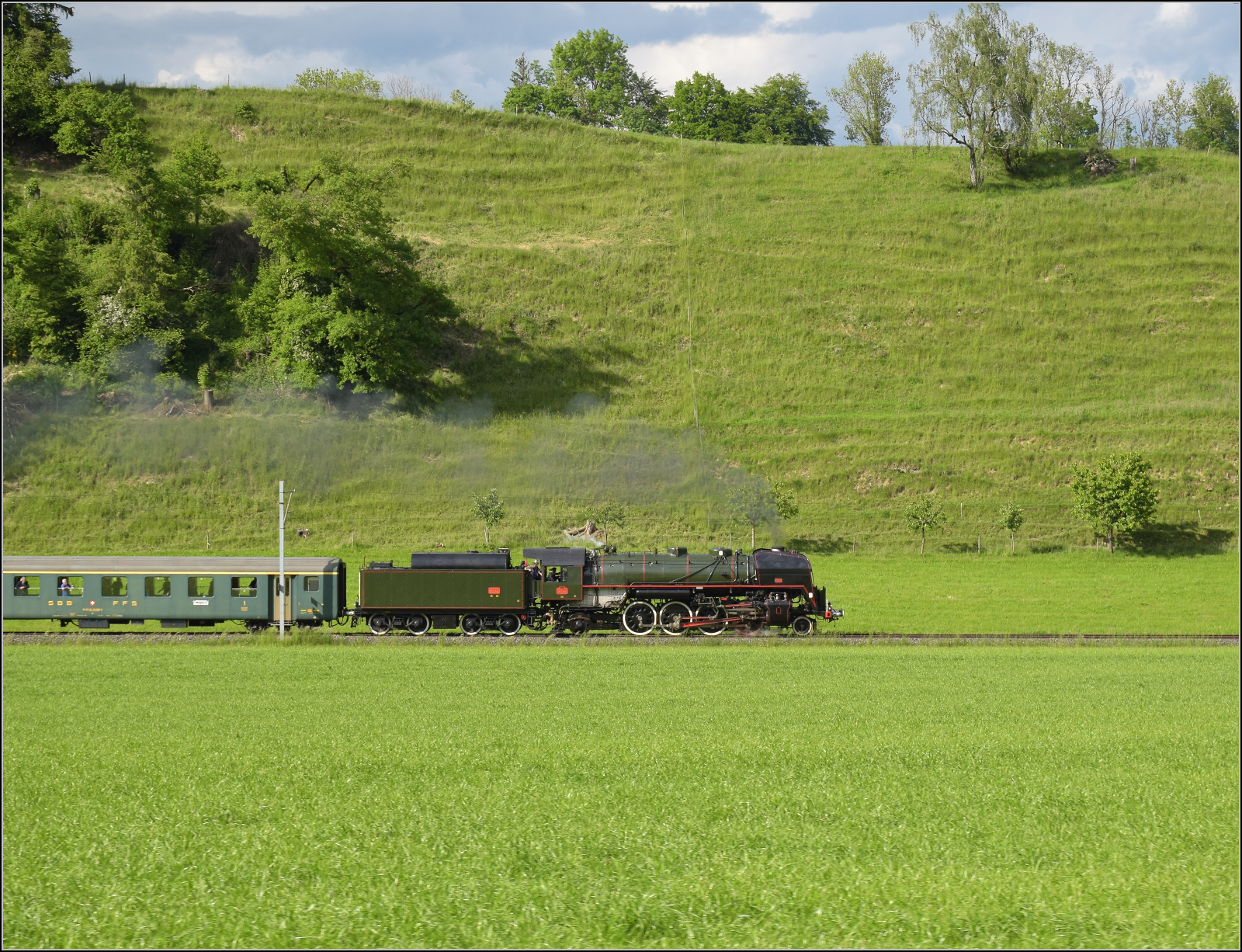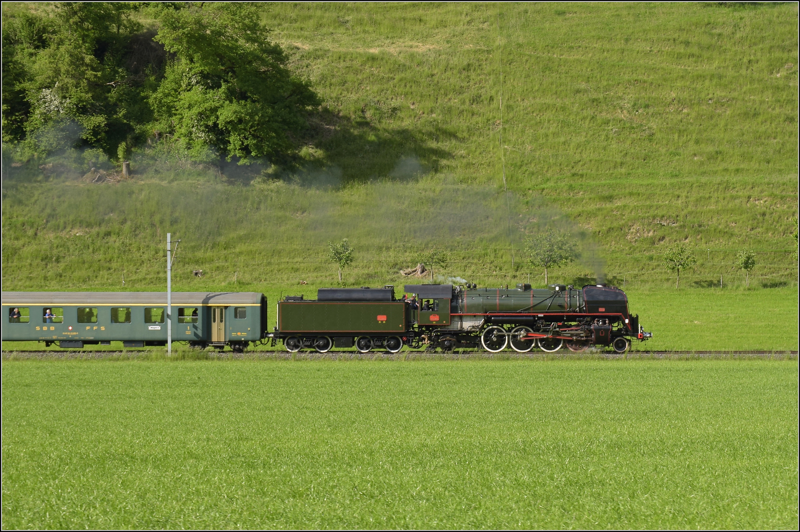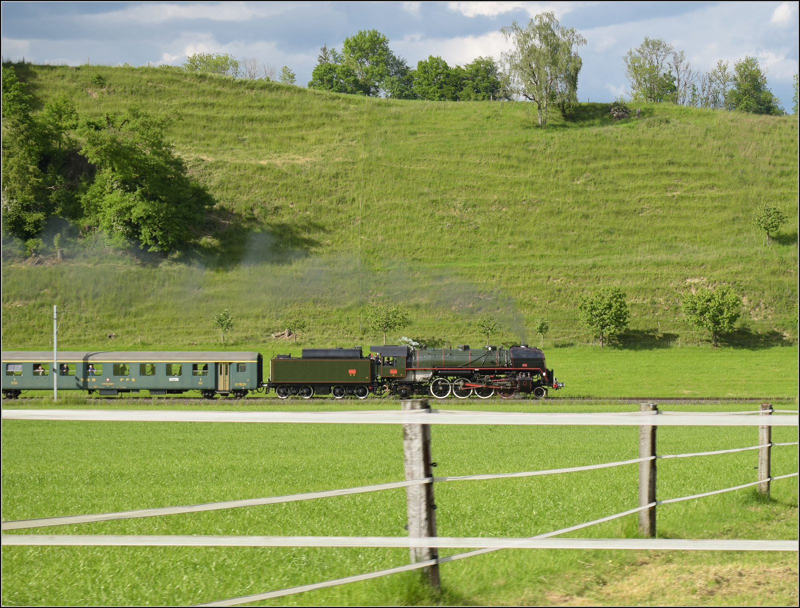 141-R-1244 auf dem Rückweg von der grossen Emmentalrundfahrt anlässlich des Jubiläums. In Menznau ist eine Zugkreuzung angesagt, Zeit zum Aufholen und Mitfahren. Wie sich kurz drauf zeigte, die genau passende Unterbrechung. Mai 2025. km0