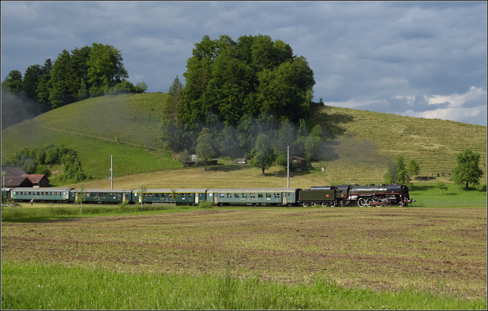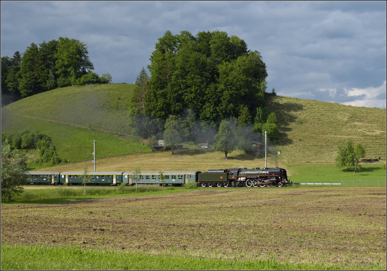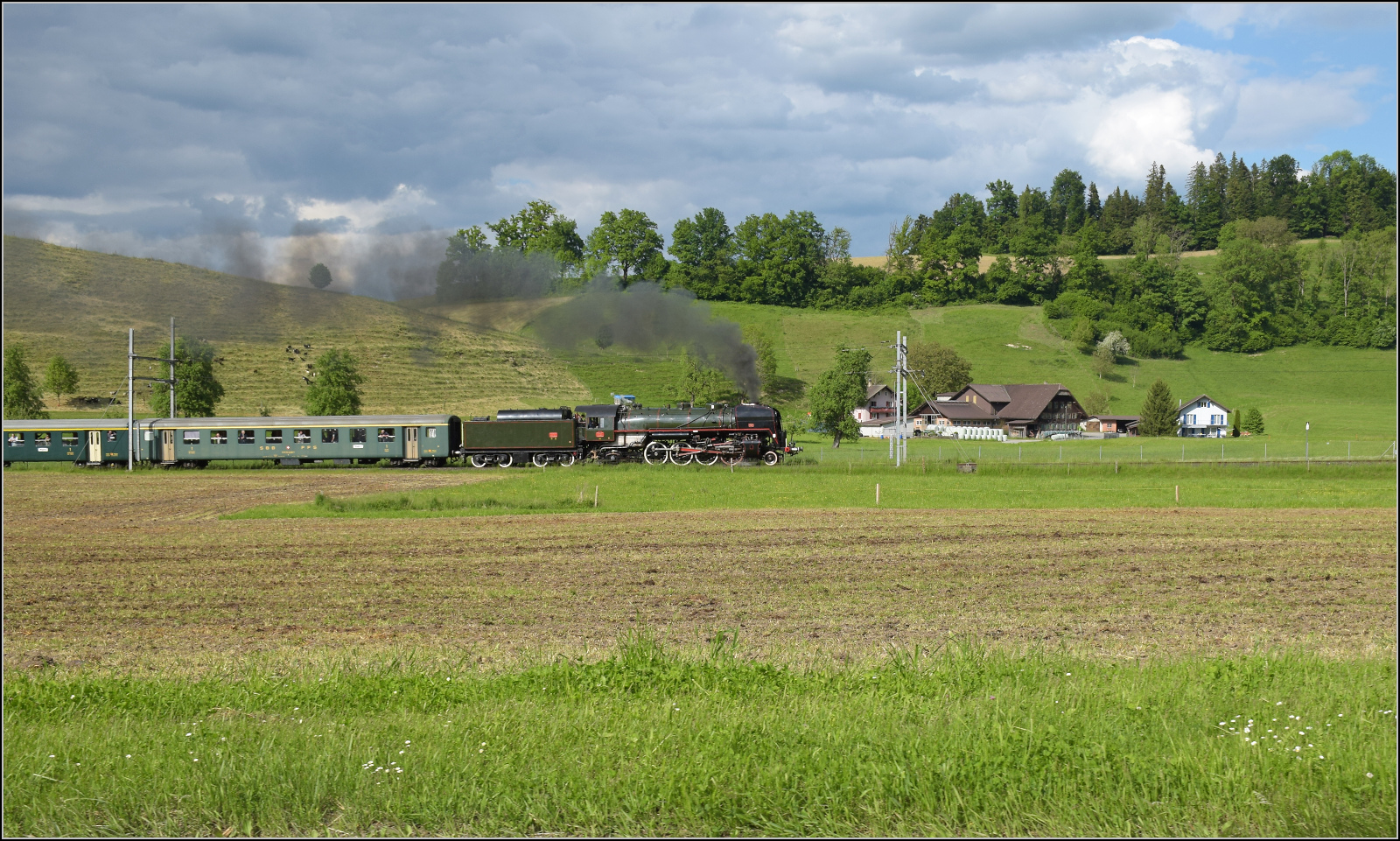 141-R-1244 auf dem Rückweg von der grossen Emmentalrundfahrt anlässlich des Jubiläums. In Menznau ist eine Zugkreuzung angesagt, Zeit zum Aufholen und Mitfahren. Wie sich kurz drauf zeigte, die genau passende Unterbrechung. Mai 2025. km0