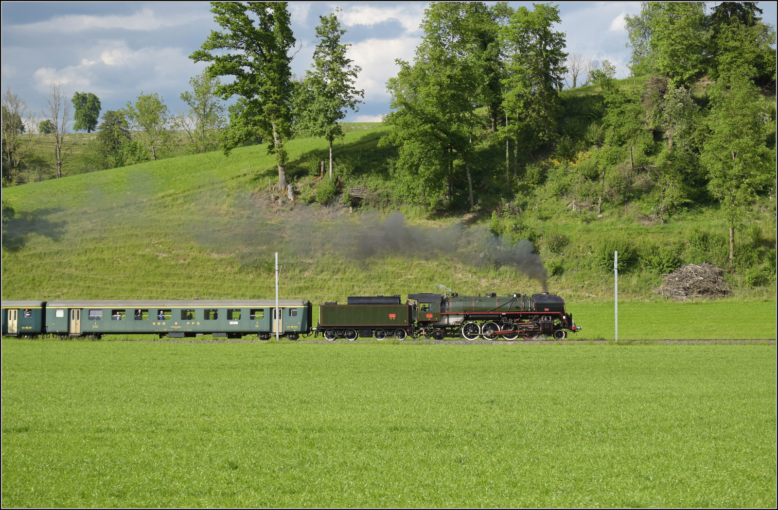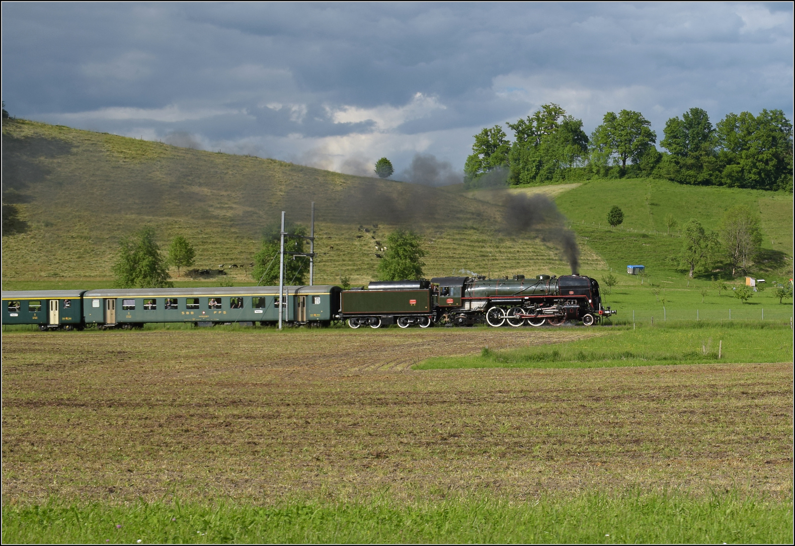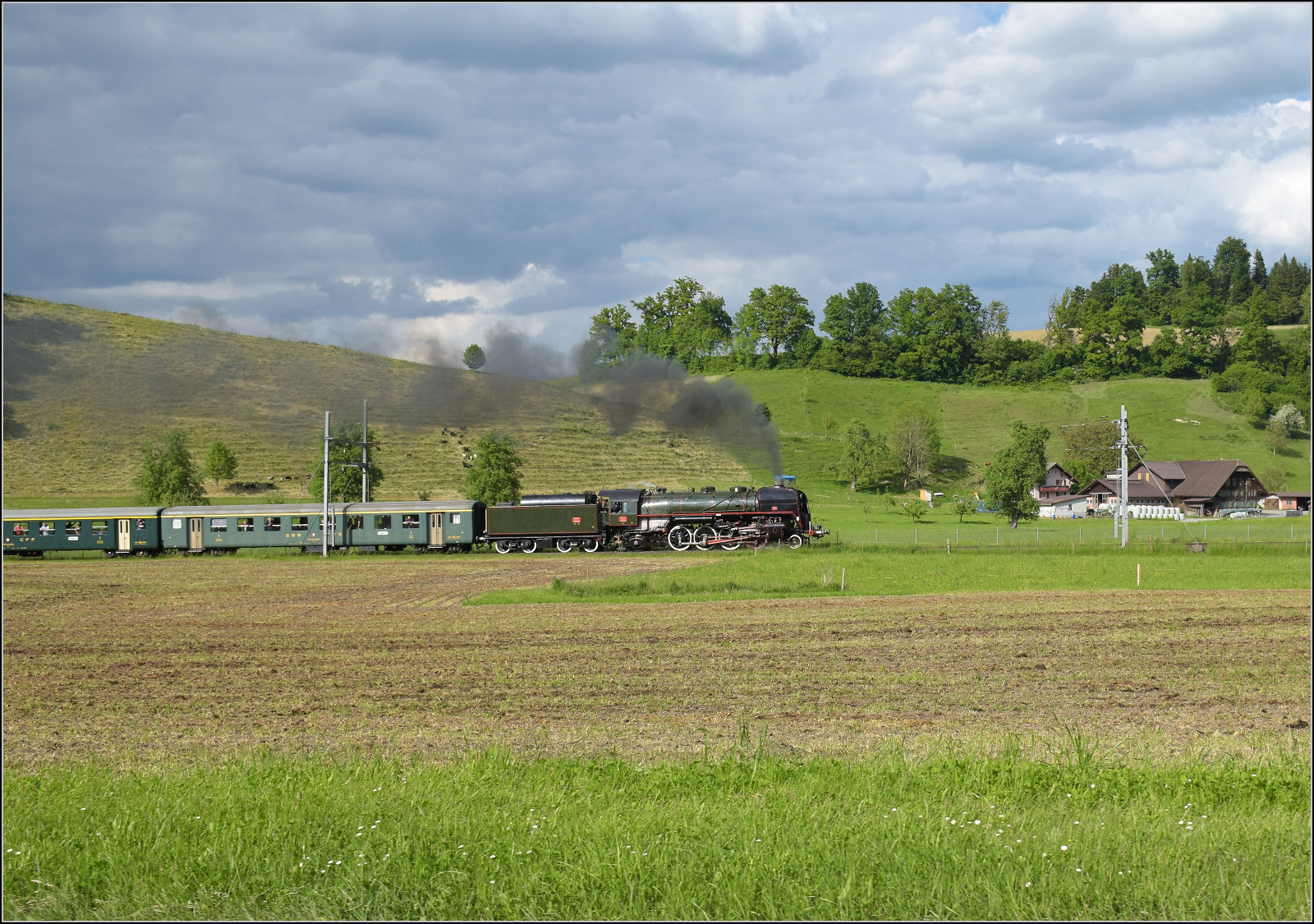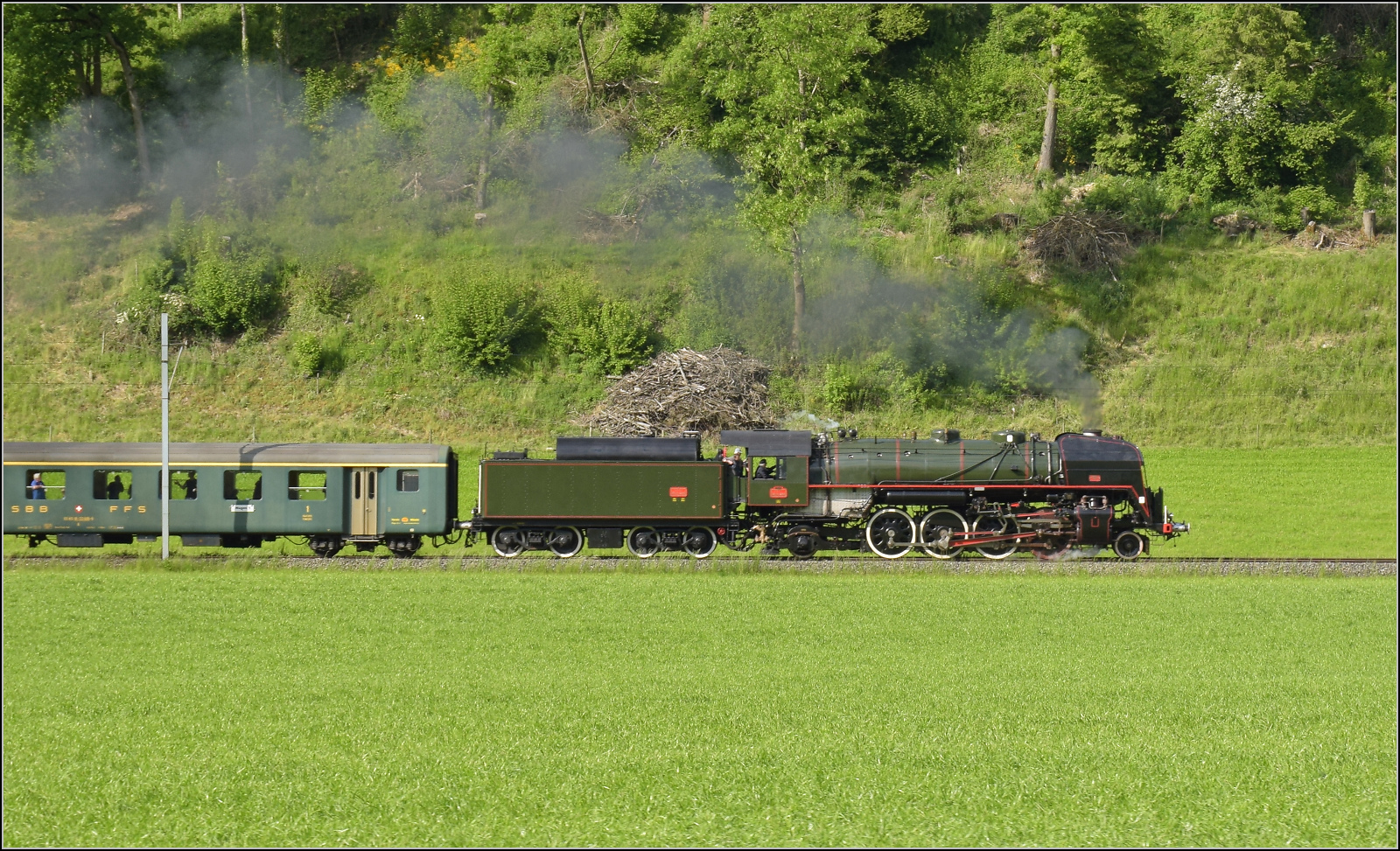 141-R-1244 auf dem Rückweg von der grossen Emmentalrundfahrt anlässlich des Jubiläums. In Menznau ist eine Zugkreuzung angesagt, Zeit zum Aufholen und Mitfahren. Wie sich kurz drauf zeigte, die genau passende Unterbrechung. Mai 2025. km0