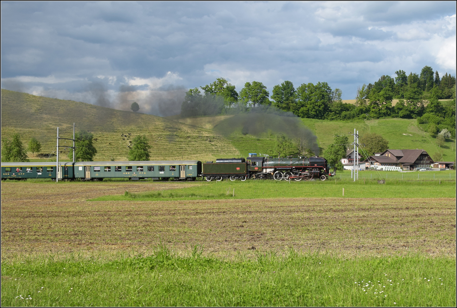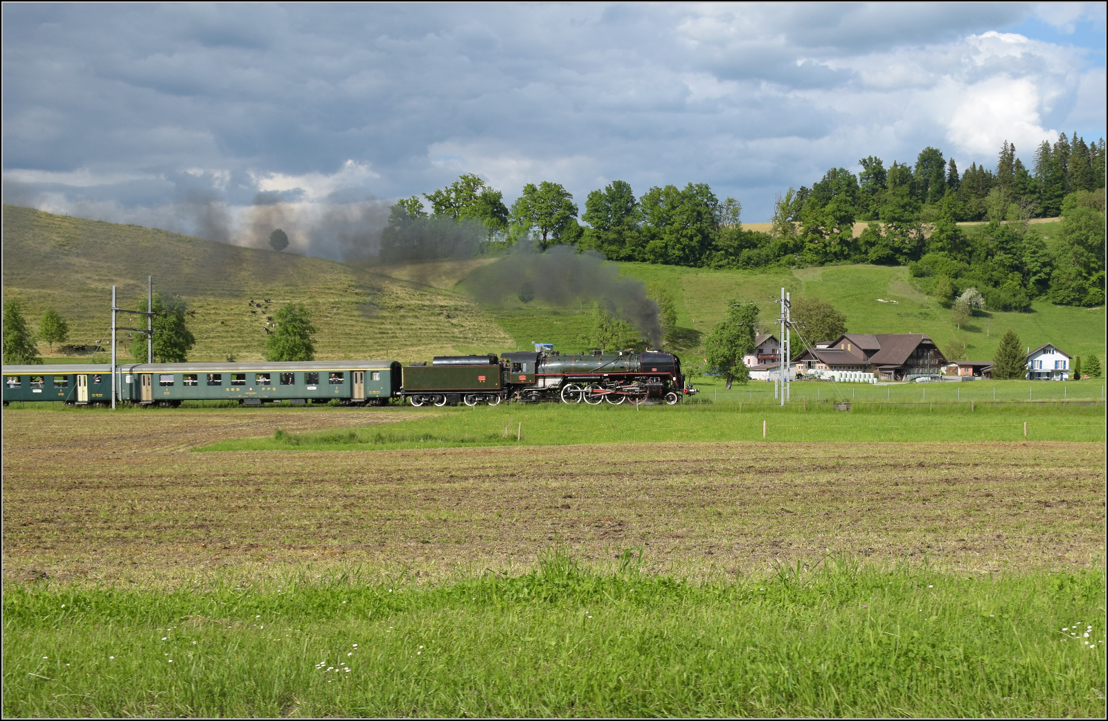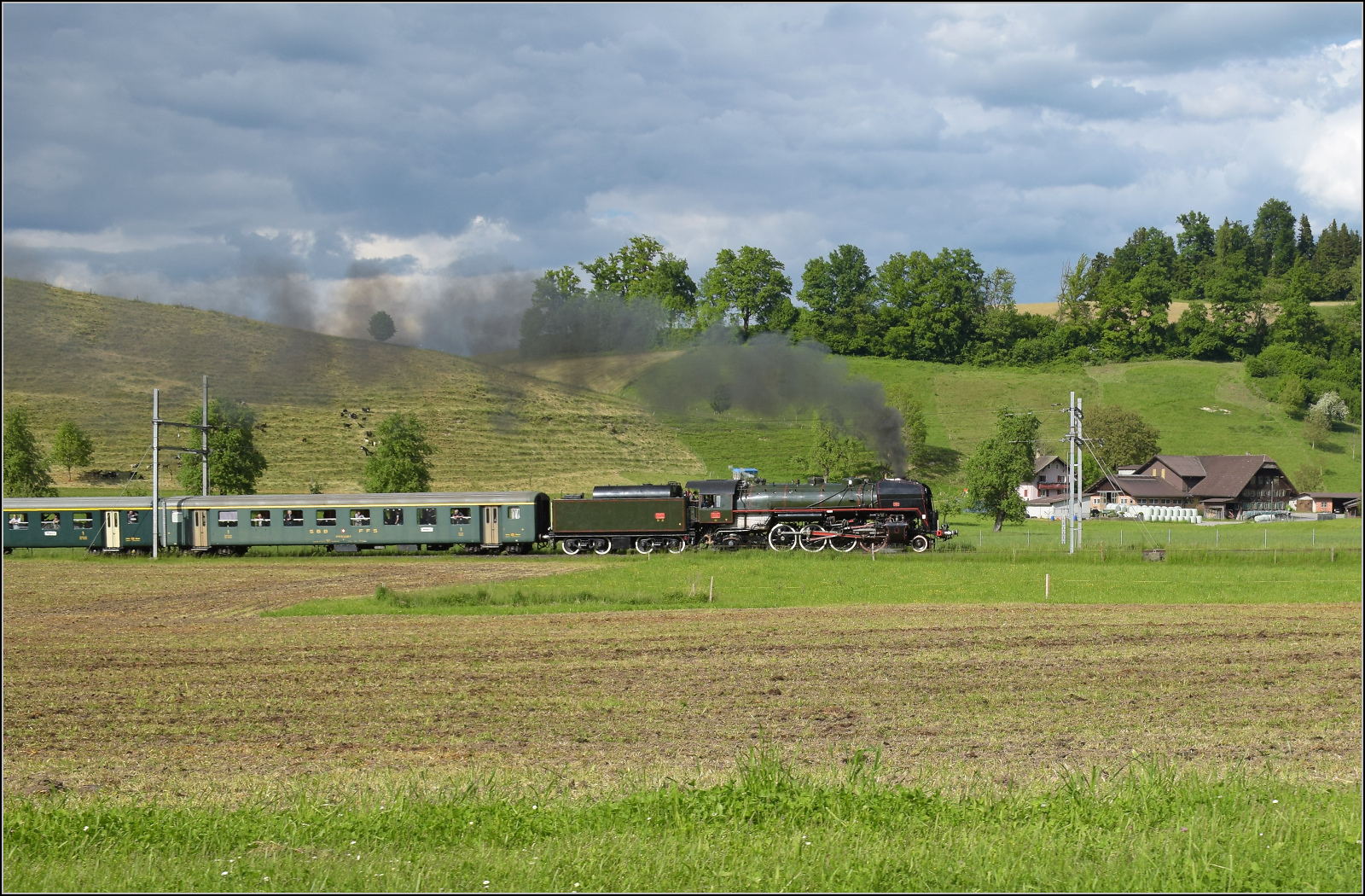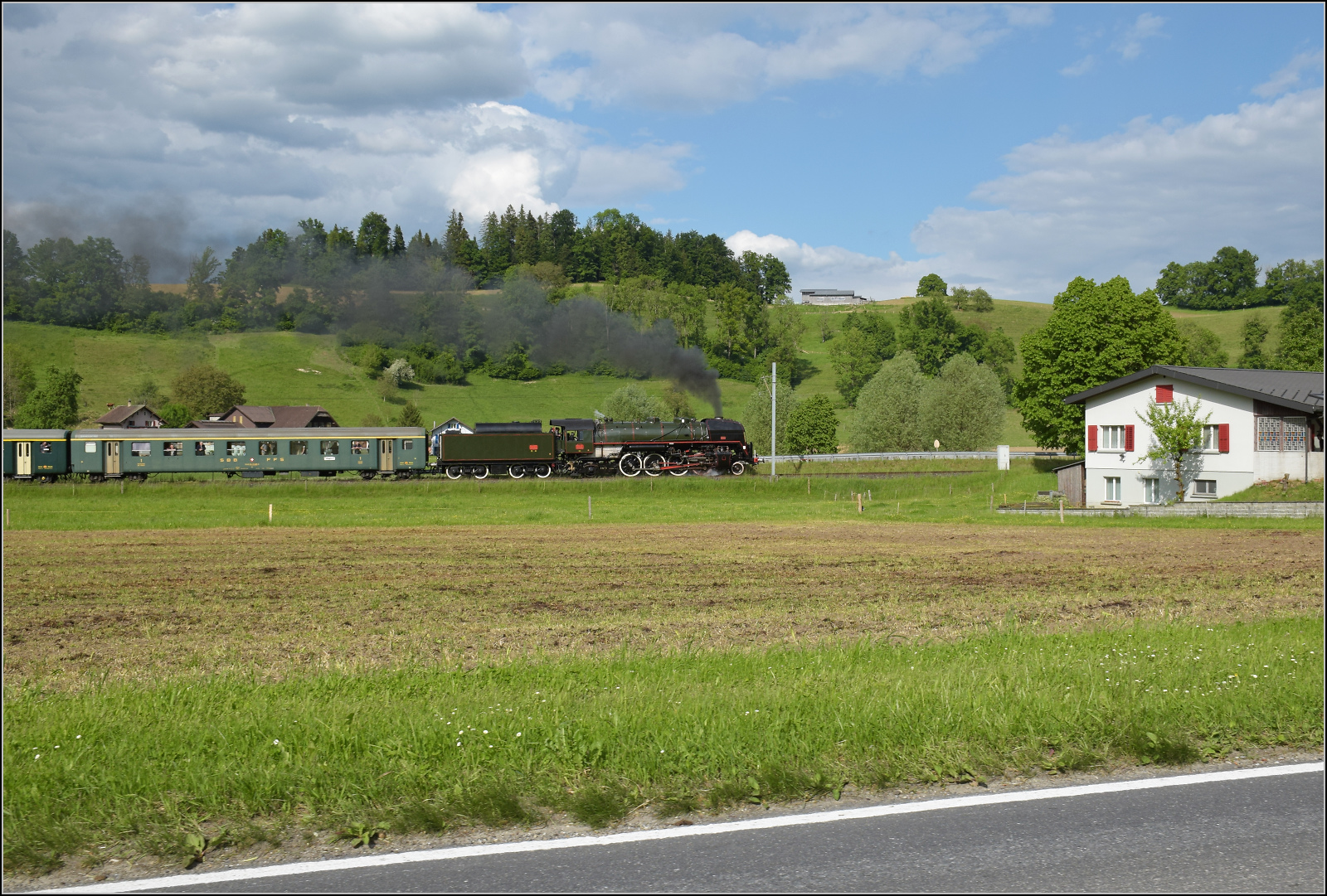 141-R-1244 auf dem Rückweg von der grossen Emmentalrundfahrt anlässlich des Jubiläums. Am Ortsausgang Menznau findet die Sonne ein Wolkenloch, freie Sicht auf die Strecke und die Strasse ist ohne Verkehr. Menznau Laui, Mai 2025. km0