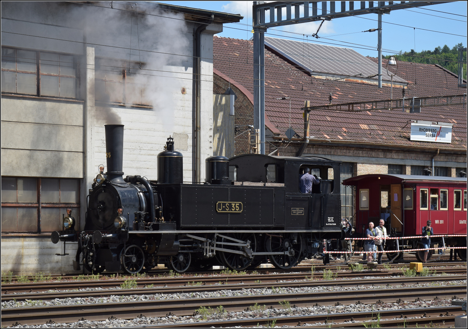 La DER de la Saison! (Saisonabschlussfeier der Blonay-Chamby Bahn 2024) - der nun mechanisch und auch optisch wieder perfekt hergereichte RhB Bernina Bahn ABe 4/4 I N° 35 der Blonay Chamby Bahn rangiert in Blonay, bei B-C Ausfahrsignal.