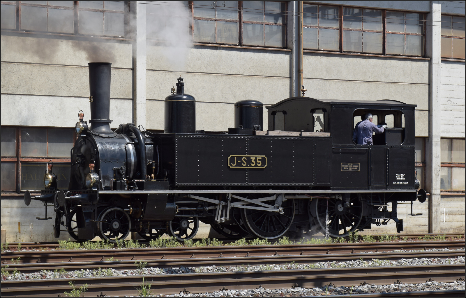 Die (ex) SNCF 141 R 568 der L'Association 141 R 568 mit dem Train Chasse beim Halt in Lausanne; leider ausgerechte vor dem "Gleise ¨überschreiten verboten - Schild.