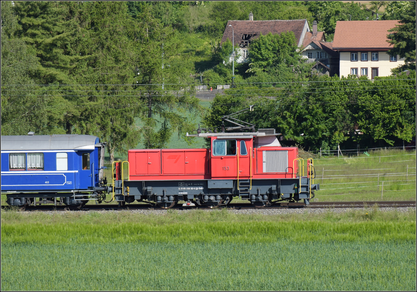 Eb 2/4 35 der Jura-Simplon fährt zum Jubiläumsfest. Schubhilfe leistet ungewöhnlicherweise Ee 3/3 153. Balsthal, Mai 2025. km0