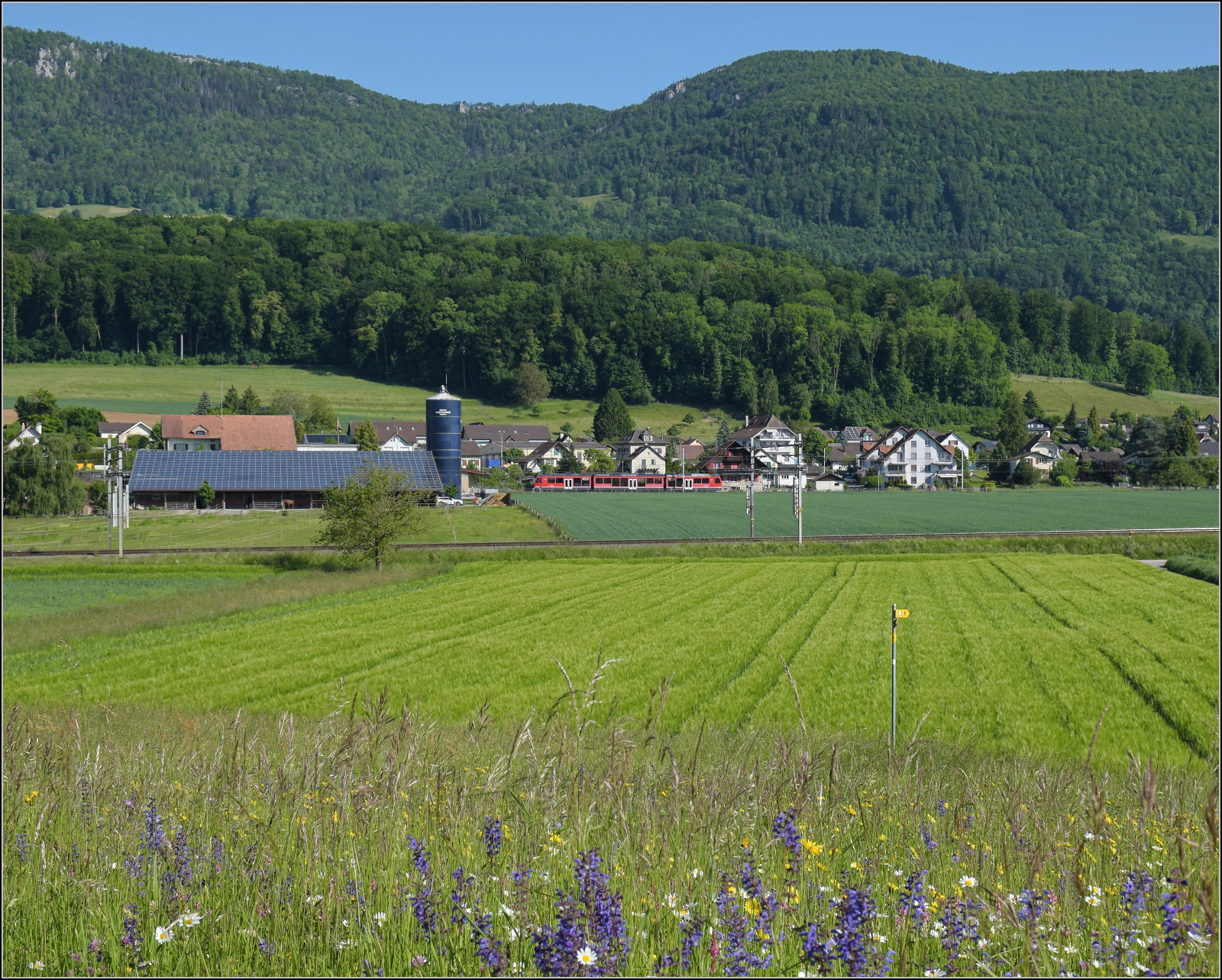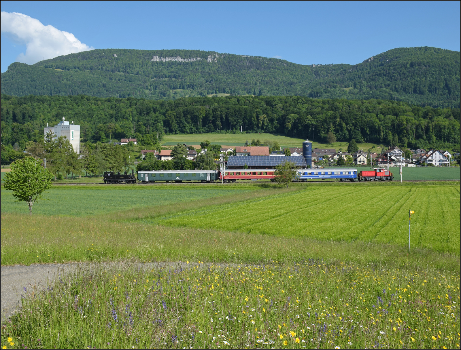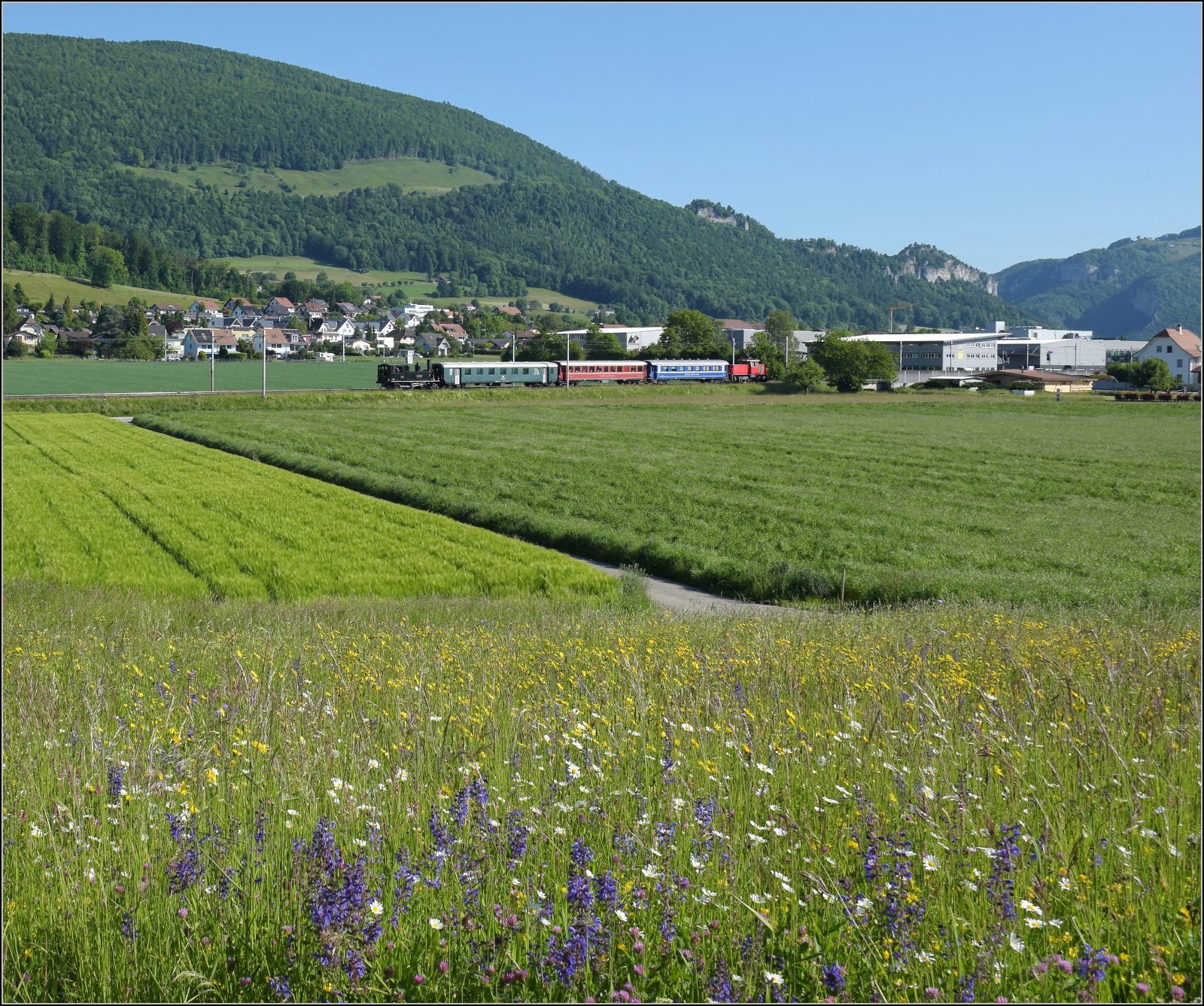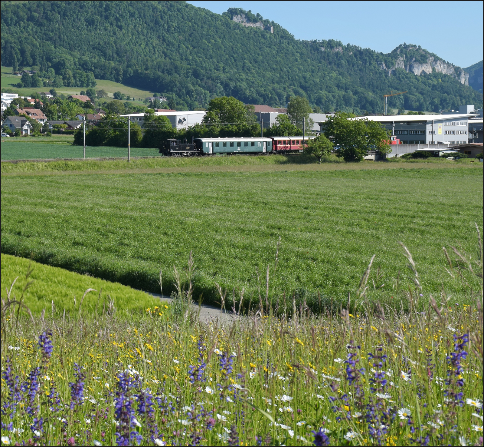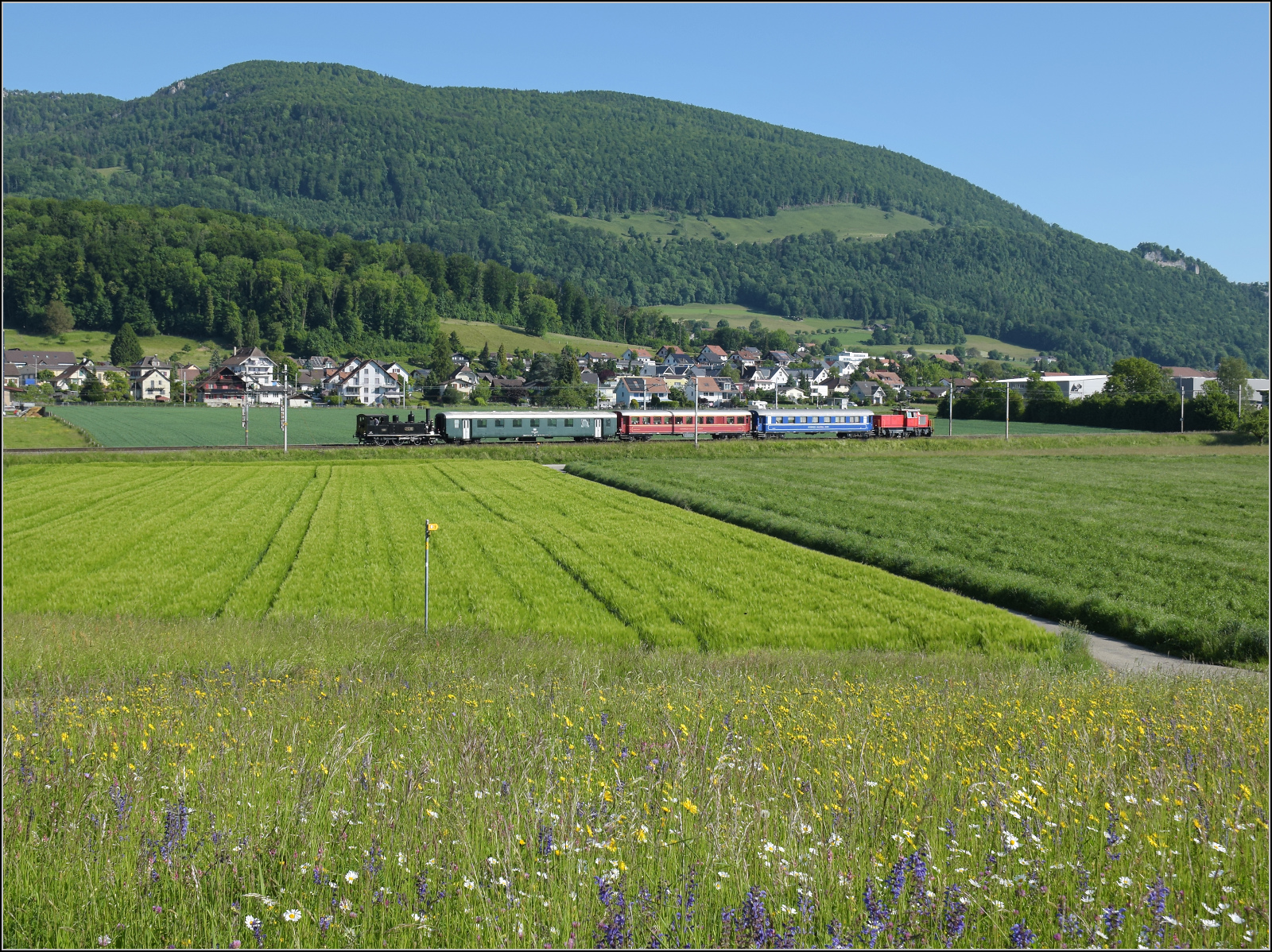 Eb 2/4 35 der Jura-Simplon fährt zum Jubiläumsfest. Bei Niederbipp geht es durch bunte Blumenwiesen. Schubhilfe leistet ungewöhnlicherweise Ee 3/3 153. Mai 2025. km0