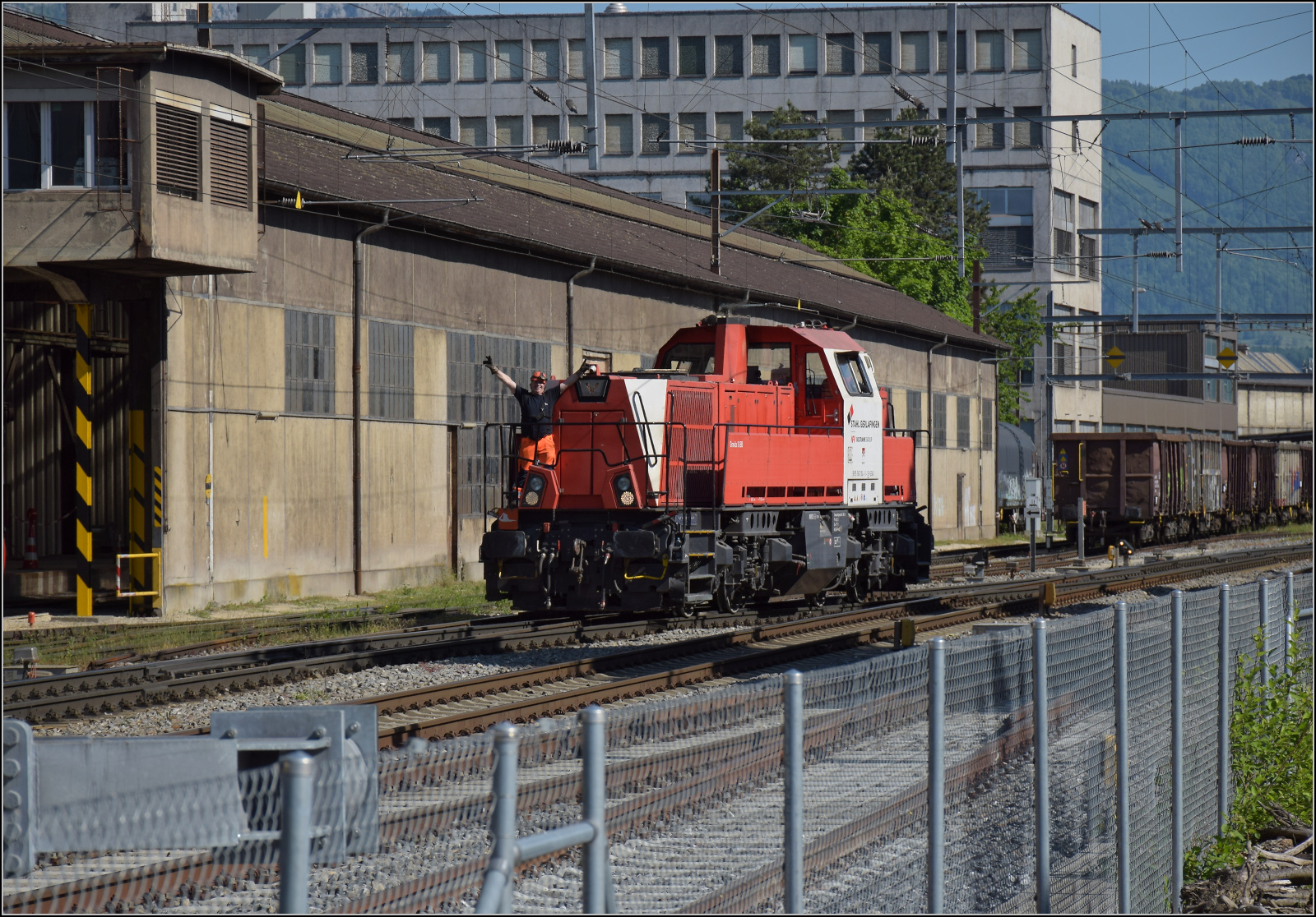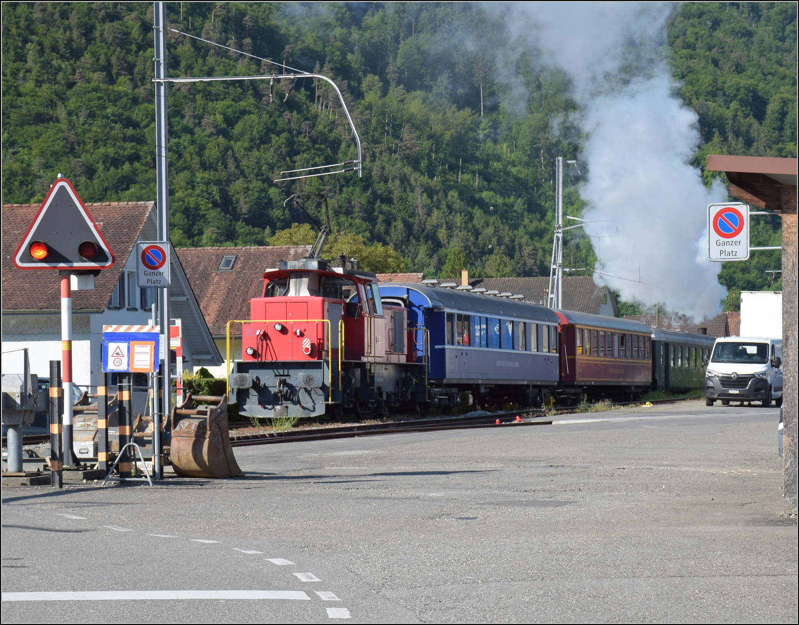 Eb 2/4 35 der Jura-Simplon fährt zum Jubiläumsfest. Der Einstieg mit einem misslungenen Notschuss bei Abfahrt in Balsthal. Mai 2025. km0