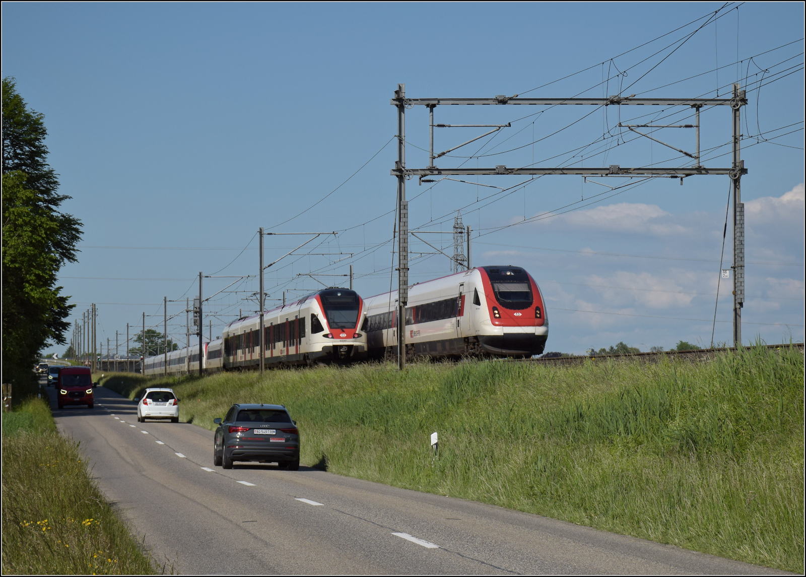 Holprig geht der Museumstag los, zwischen Deitingen und Wangen an der Aare gibt es mit den ICN RABDe 500 011 'Blaise Cendrars' (im bild) plus RABDe 500 029 'Eduard Spelterini' nur Regelverkehr zu sehen. Mai 2025,. km0