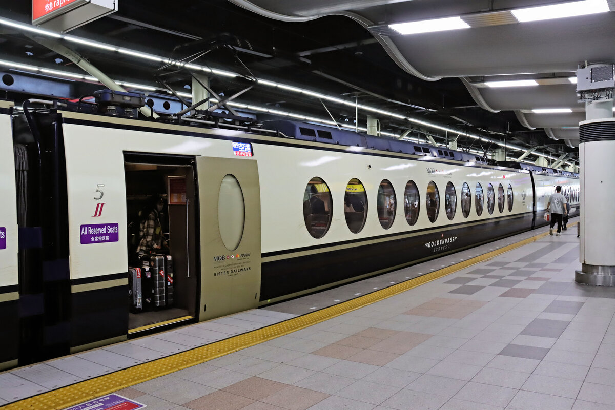 Der Nankai-Privatkonzern, die japanische Partnerbahn der MOB - Der Goldenpass Express, Zug 50504: Wagen 5, bereit zur Fahrt zum Internationalen Flughafen Kansai. 7.Mai 2025 Peter Ackermann