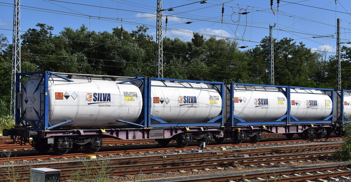 Drehgestell-Gelenkcontainertragwageneinheit vom österreichischen Einsteller Innofreight Solutions GmbH mit der Nr. 35 TEN 81 A-IF 4854 574-4 Sggrrs (GE) mit ausschließlich Tankcontainern der polnischen SILVA Logistc System beladen lt. UN-Nr.: 80/2209 für die Befüllung mit Formaldehydlösung mit mindestens 25 % Formaldehyd in einer Abstellgruppe Höhe Bahnhof Ruhland am 19.06.25 Lothar Stöckmann