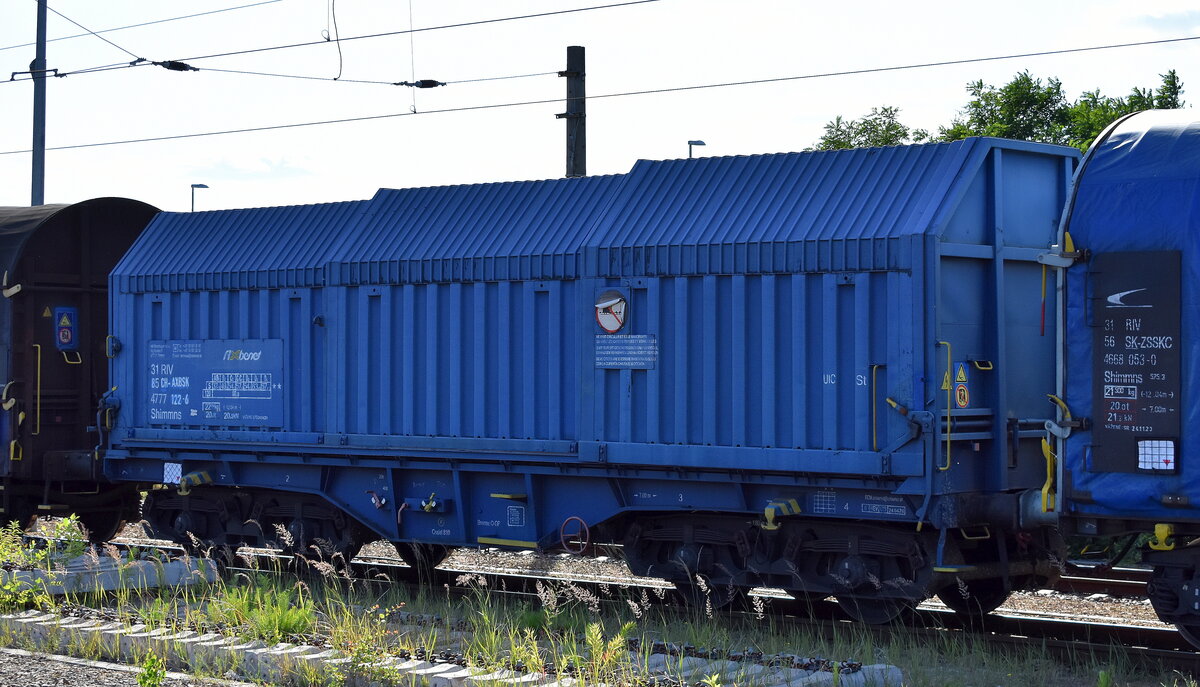 Drehgestell-Teleskophaubenwagen für Coiltransporte vom slowakischen Einsteller AXBENET s.ro. mit REgistrierung in der Schweiz mit der Nr. 31 RIV 85 CH-AXBSK 4777 122-6 Shimmns in einem gemischten Güterzug am 19.06.25 Höhe Bahnhof Ruhland. Lothar Stöckmann