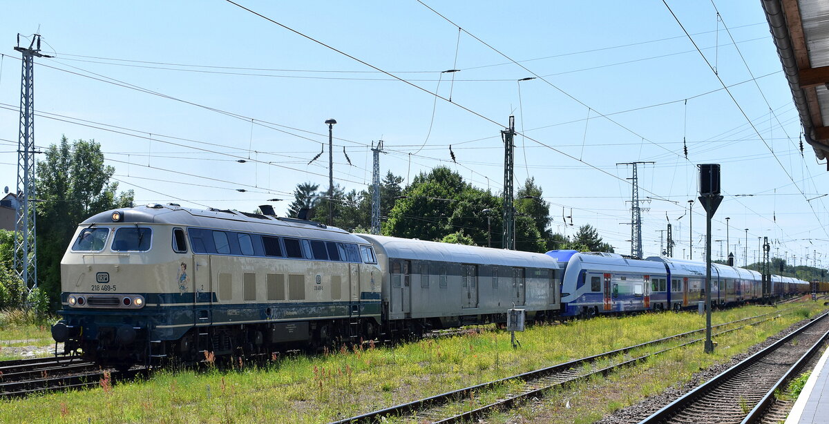 RailAdventure GmbH, München mit der angemieteten Railsystems RP Lok,Name: "Betty Boom" "218 469-5" (NVR: "92 80 1218 469-5 D-RPRS") und zwei fabrikneuen sechsteiligen Desiro HC für die israelische Israel Railways am Haken am 20.06.25 Höhe Bahnhof Stendal Hbf. Lothar Stöckmann