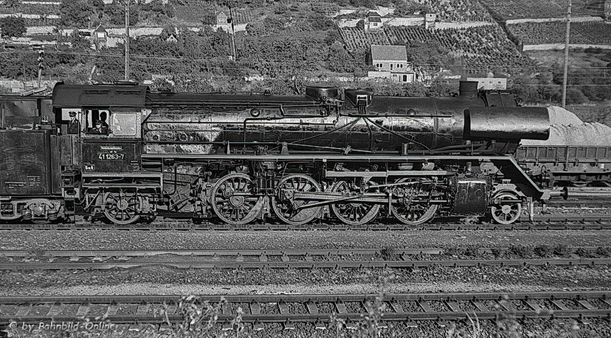 Am 30.09.1978 fand eine Abschiedsfahrt für die Baureihe 41 in der RBD Erfurt statt. DR 41 1263-7 hatte die Aufgabe den Zug von Erfurt über Reinsdorf (b Artern) - Laucha (U) und Naumburg (S) Hbf zurück nach Erfurt zu befördern. Im Bahnhof Freyburg (U) entstand bei tiefstehender Sonne diese Aufnahme bei einer Scheinanfahrt. (Foto: Henning Gothe) Frank Thomas