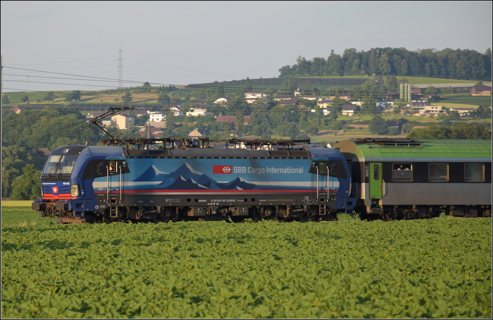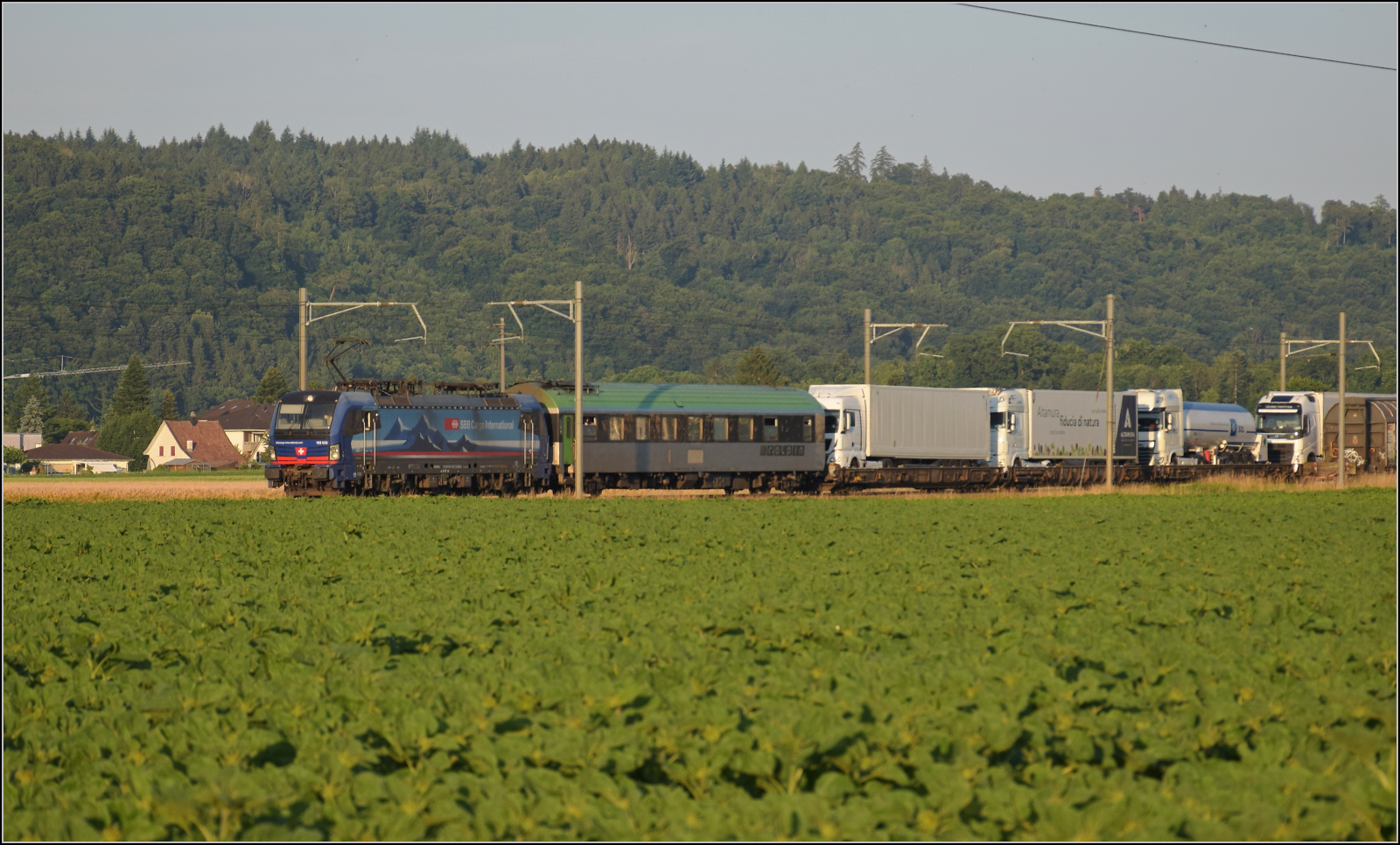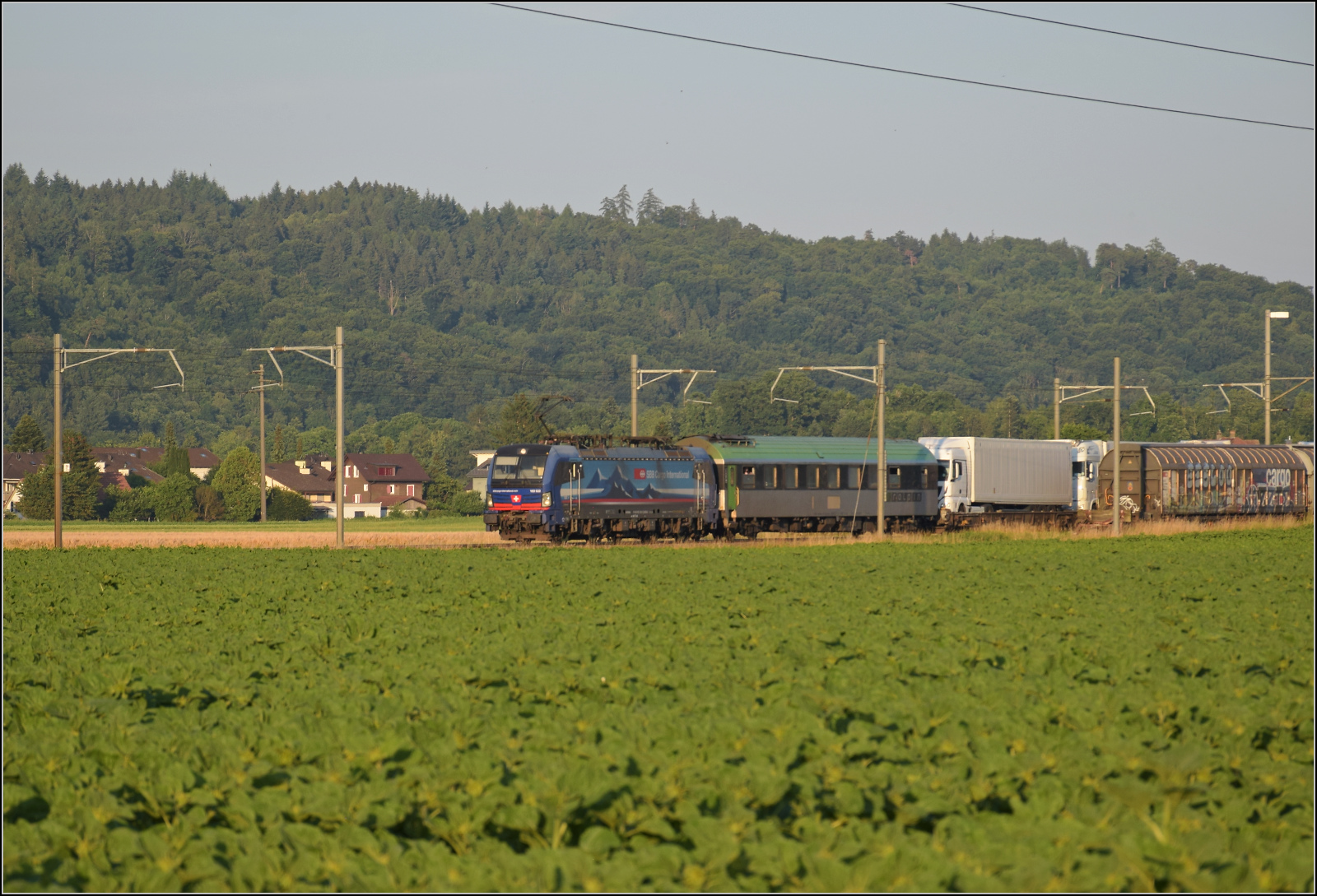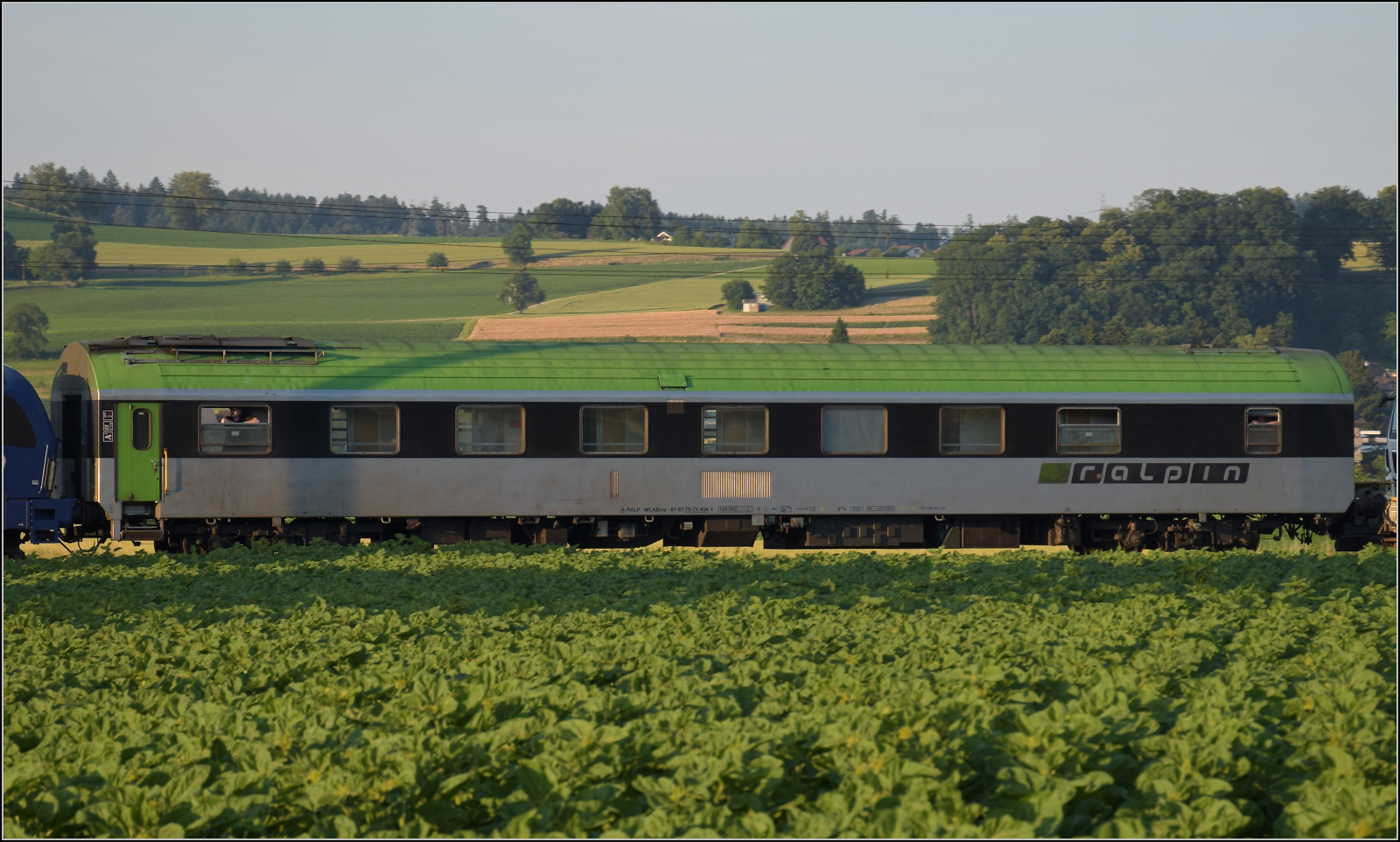 Blick auf den vermutlich ehemaligen Eurofimawagen A-RALP WLABmz 61 81 75-71 454-1 in der Rola mit 193 533 'Rhone der SBBCI bei Henschiken. Juni 2025.