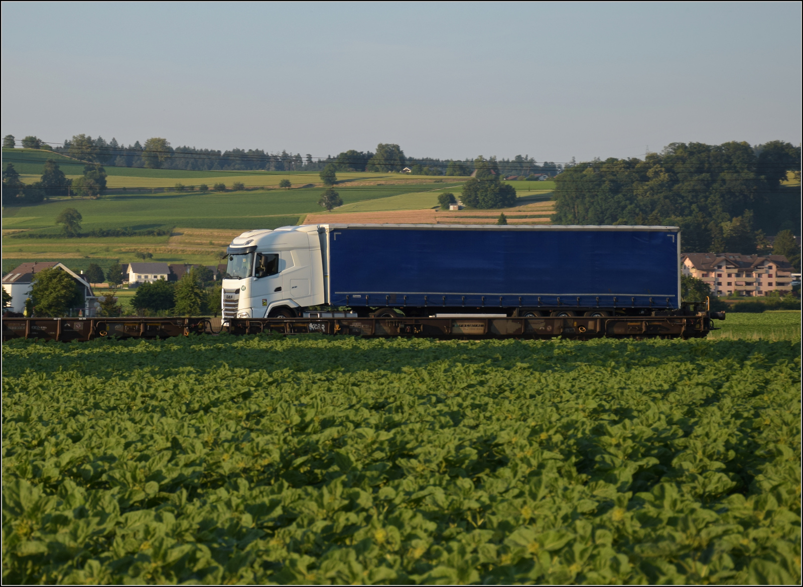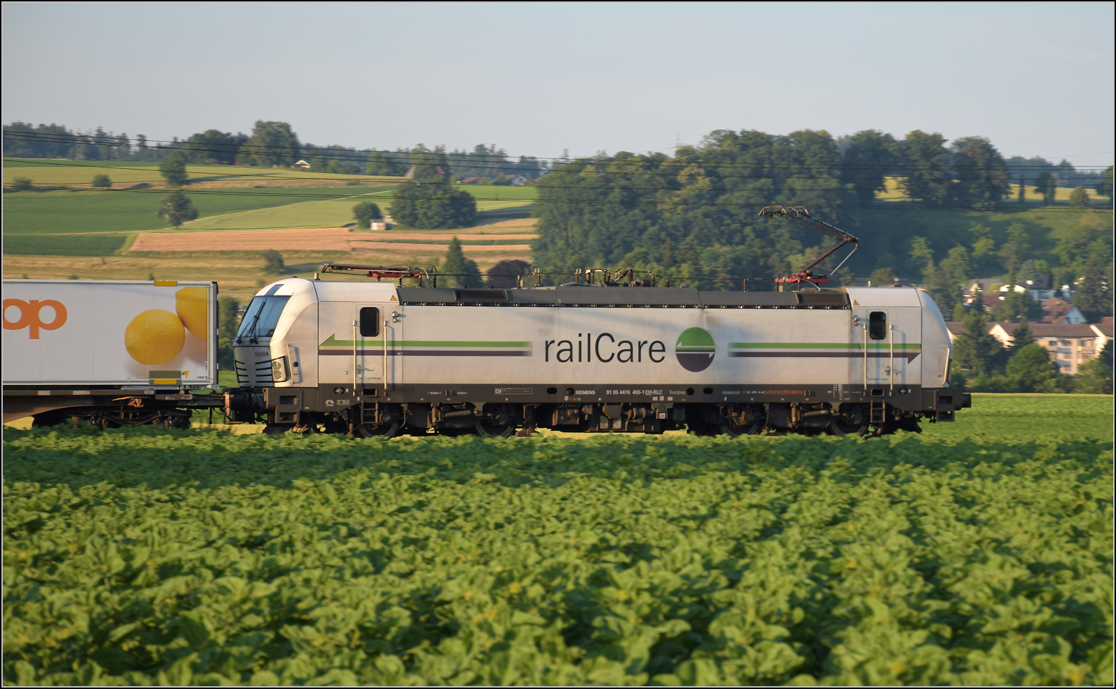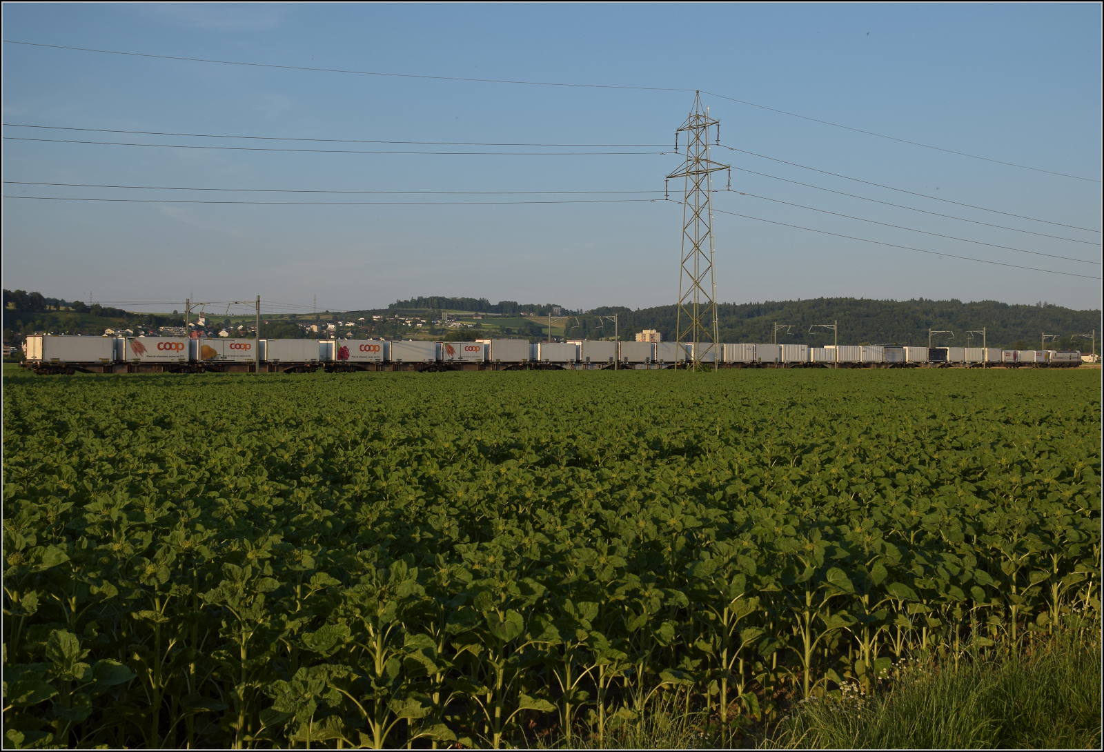 Blick auf den vermutlich ehemaligen Eurofimawagen A-RALP WLABmz 61 81 75-71 454-1 in der Rola mit 193 533 'Rhone der SBBCI bei Henschiken. Juni 2025.