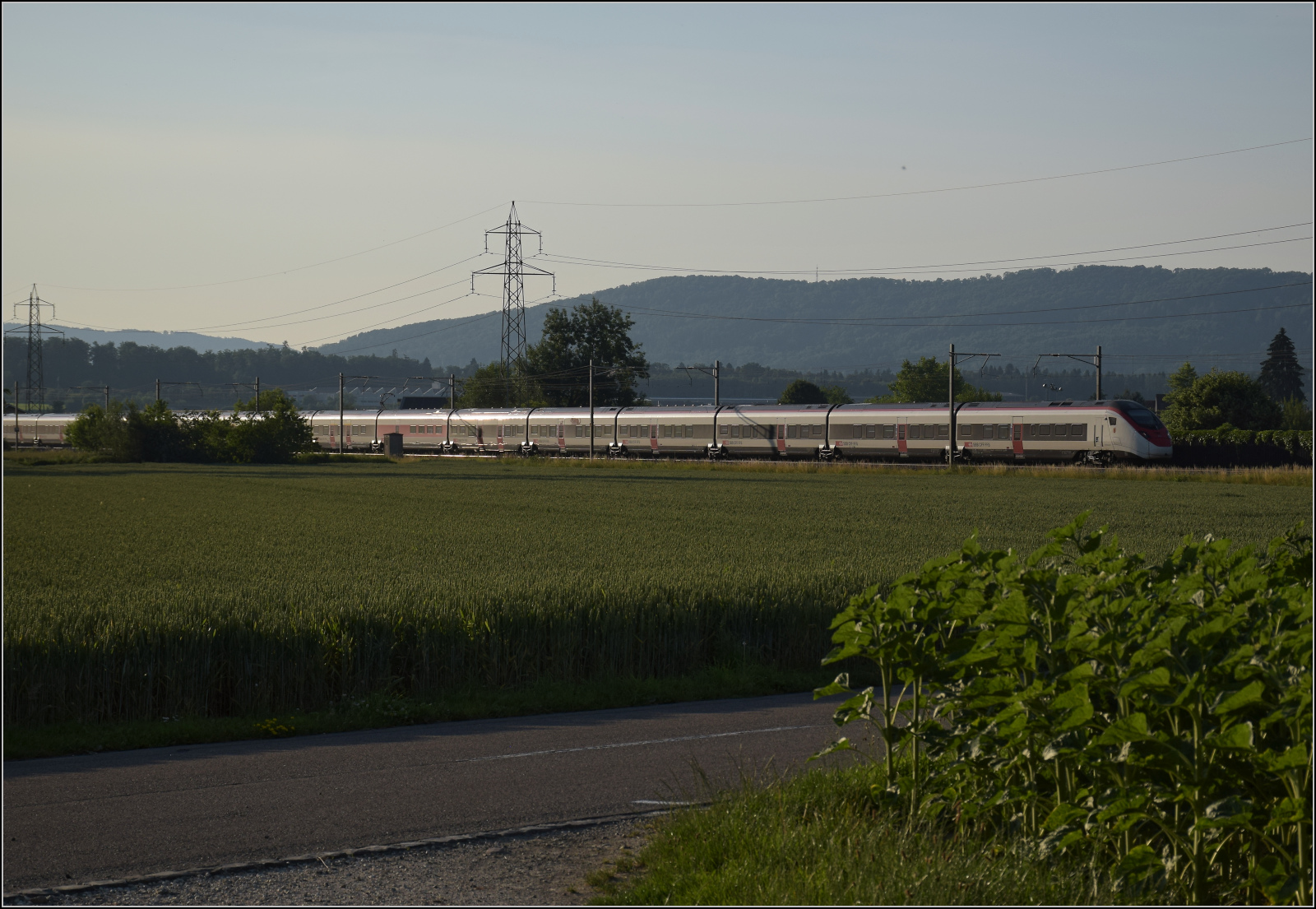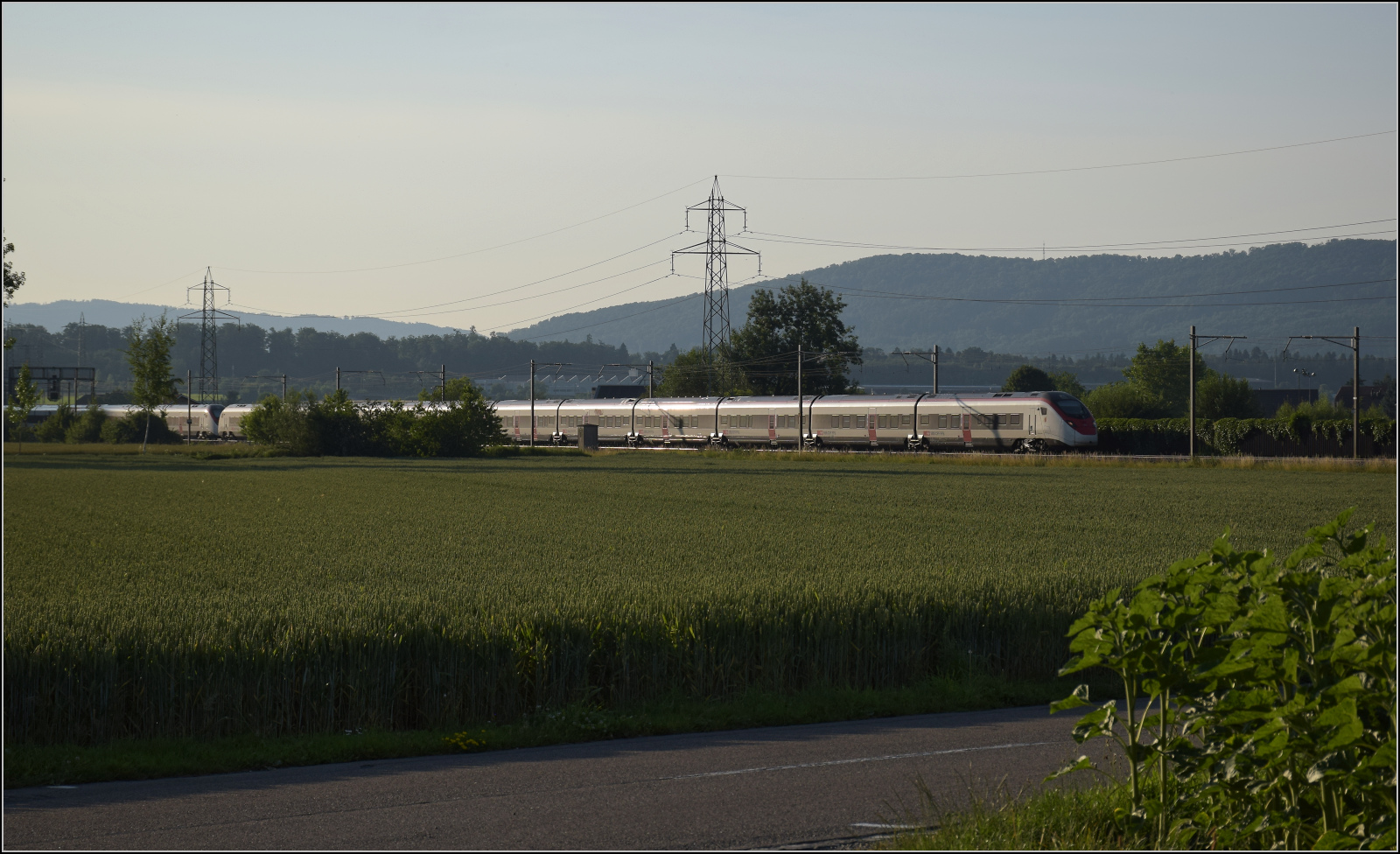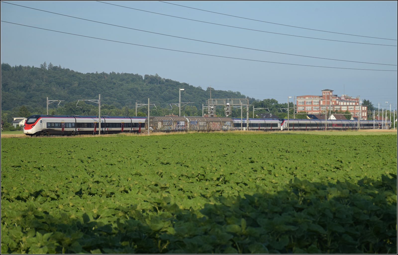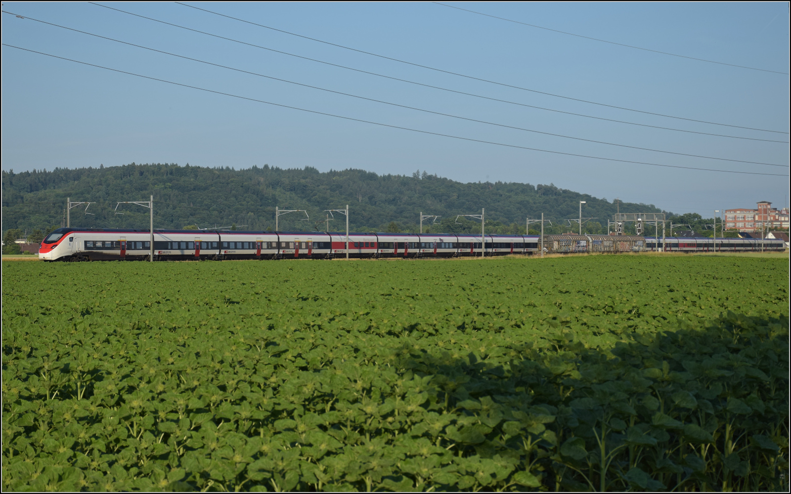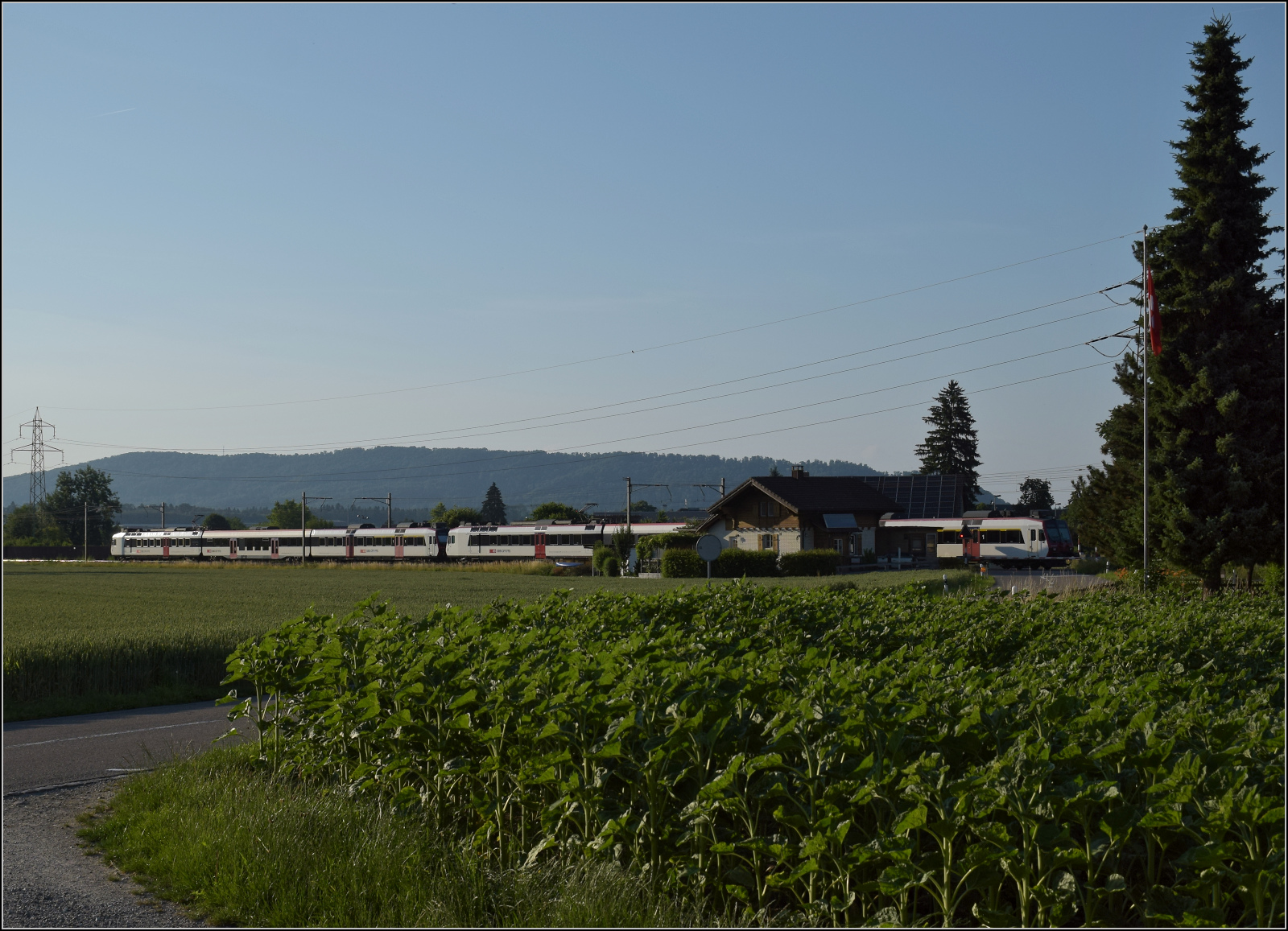 Für Abwechslung bei Hendschiken sorgt ein umgeleiteter Fernverkehrszug mit RABe 501 025 'Geneve' und RABe 501 020 'Luzern'. Juni 2025