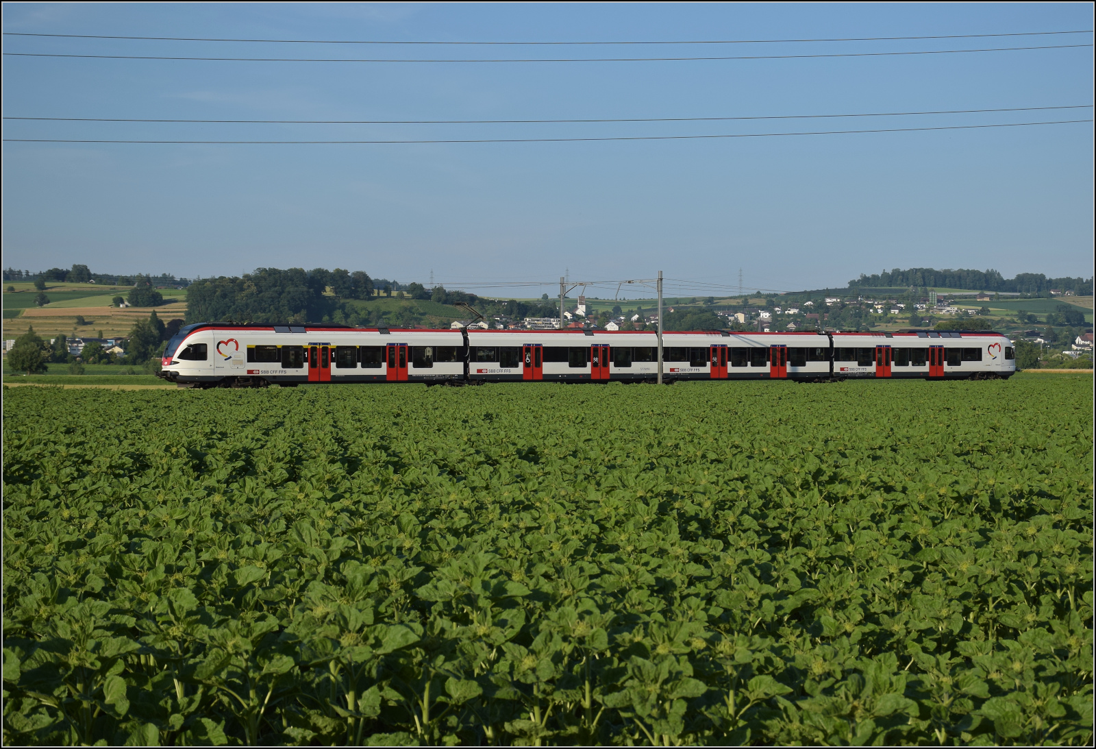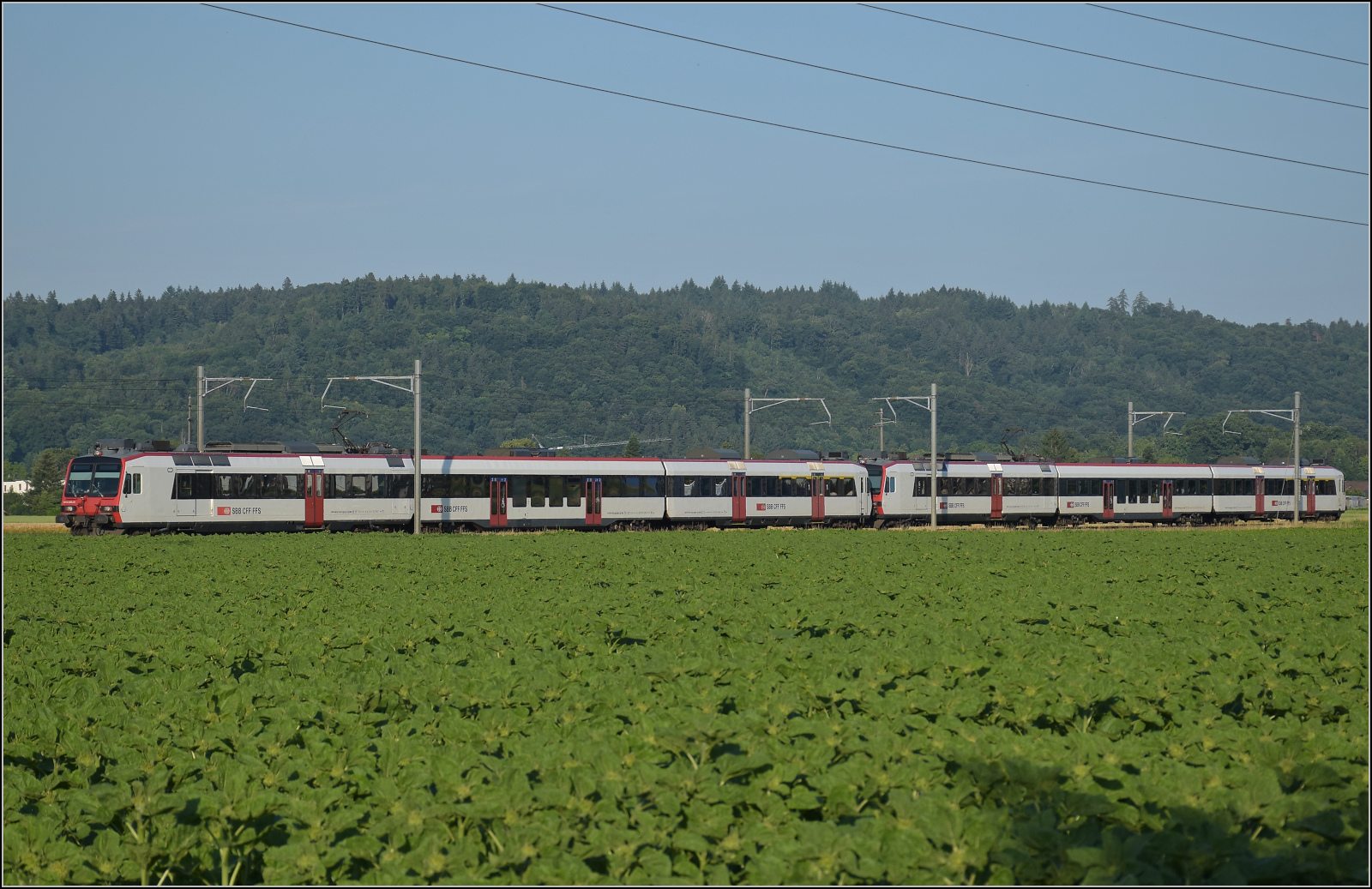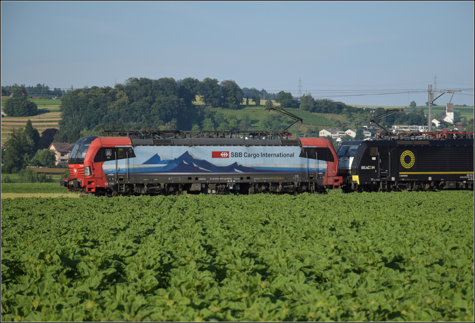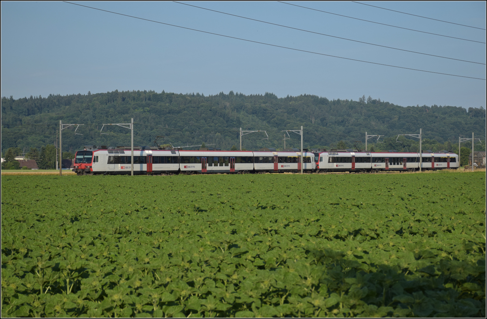 Für Abwechslung bei Hendschiken sorgt ein umgeleiteter Fernverkehrszug mit RABe 501 025 'Geneve' und RABe 501 020 'Luzern'. Juni 2025
