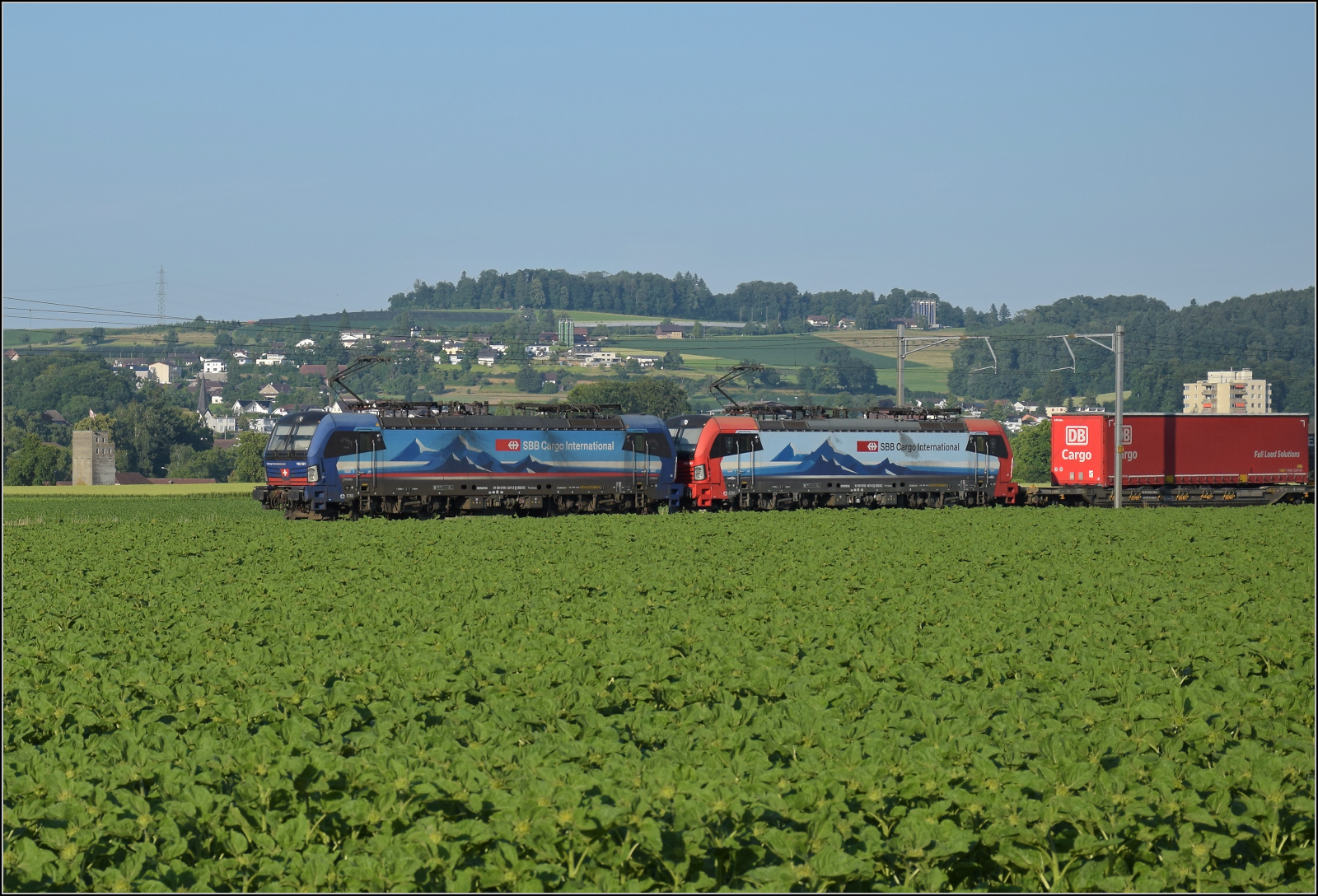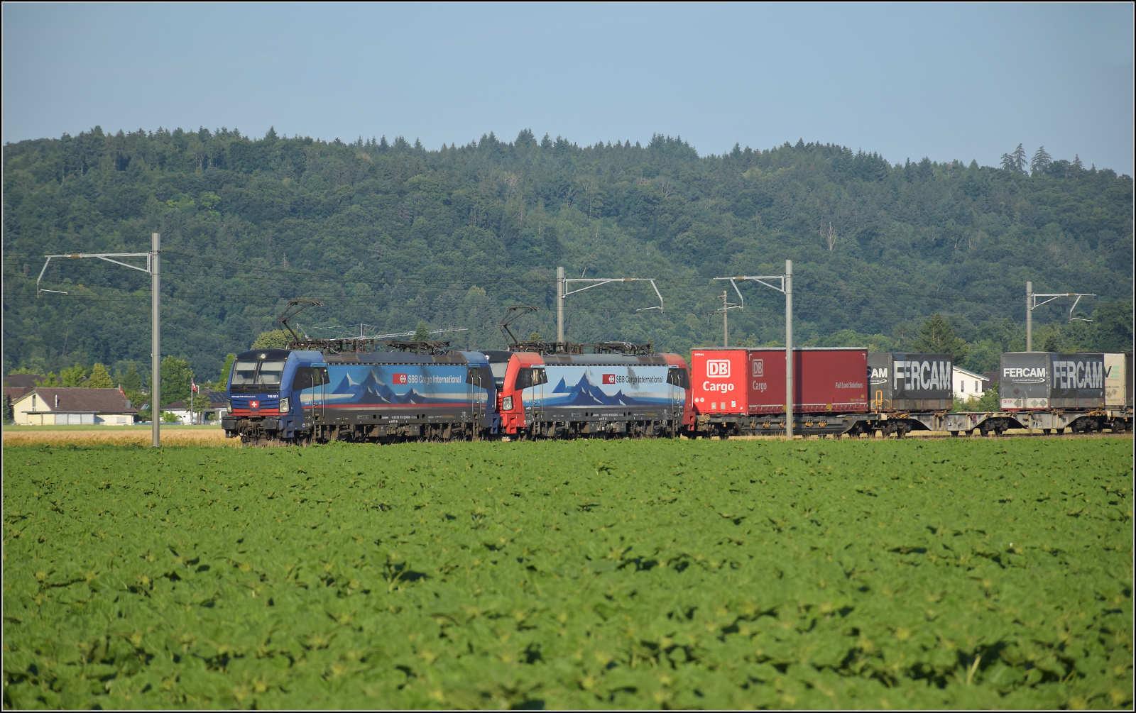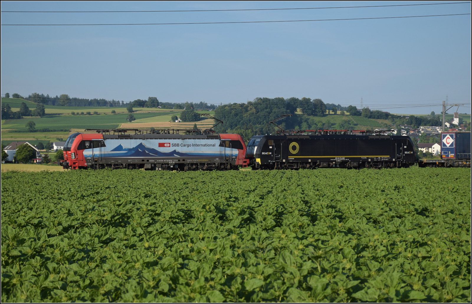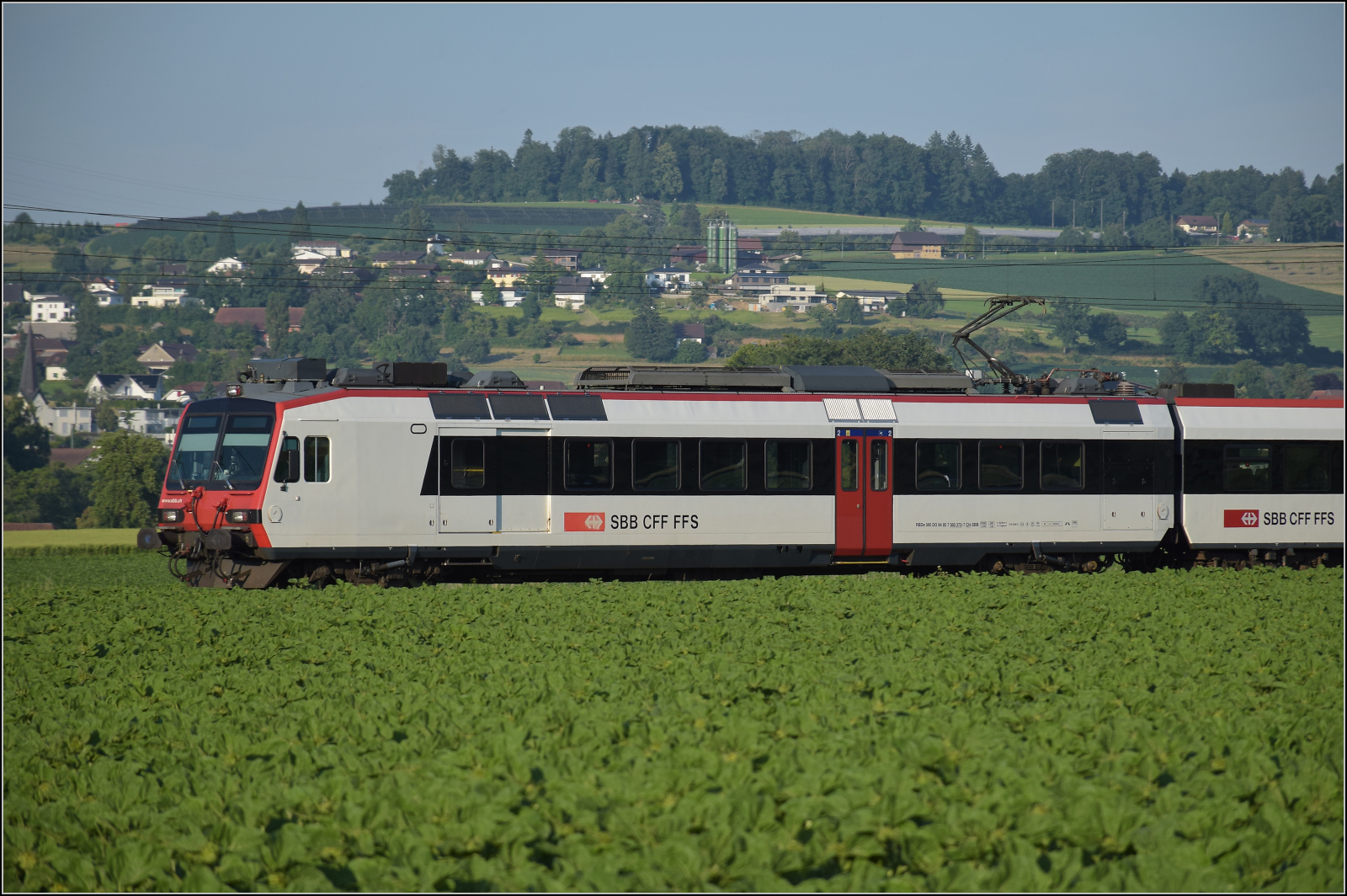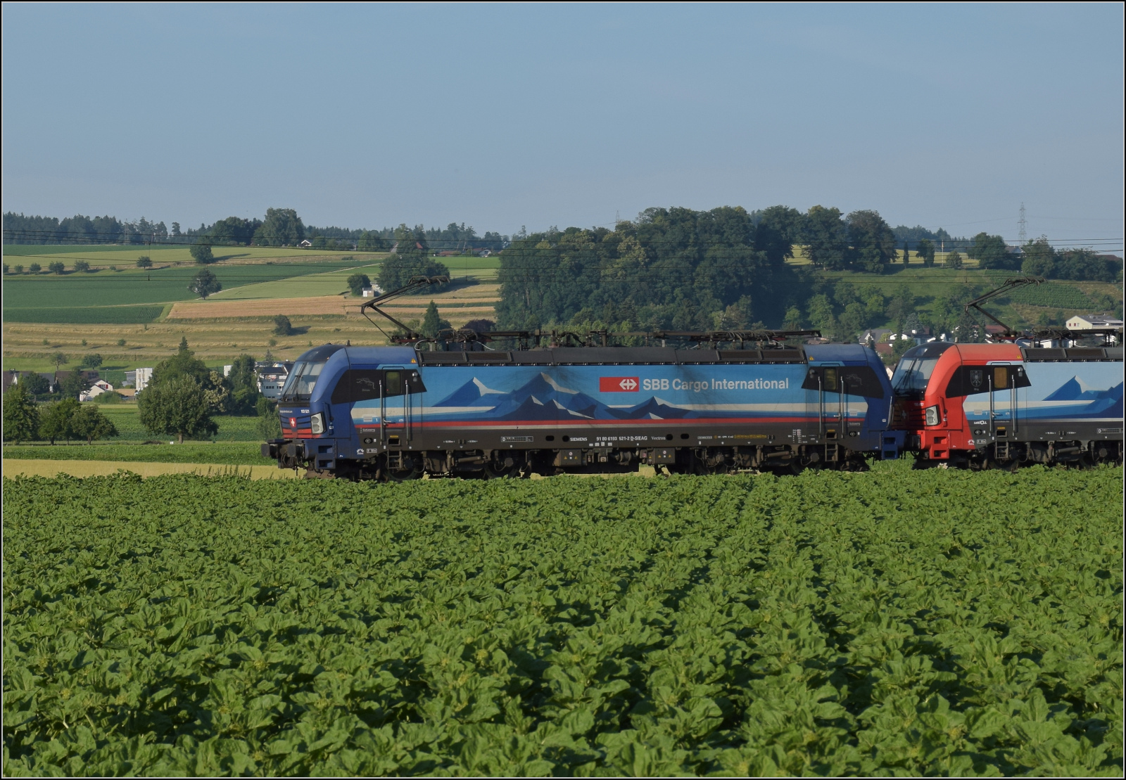 Für Abwechslung bei Hendschiken sorgt ein umgeleiteter Fernverkehrszug mit RABe 501 025 'Geneve' und RABe 501 020 'Luzern'. Juni 2025
