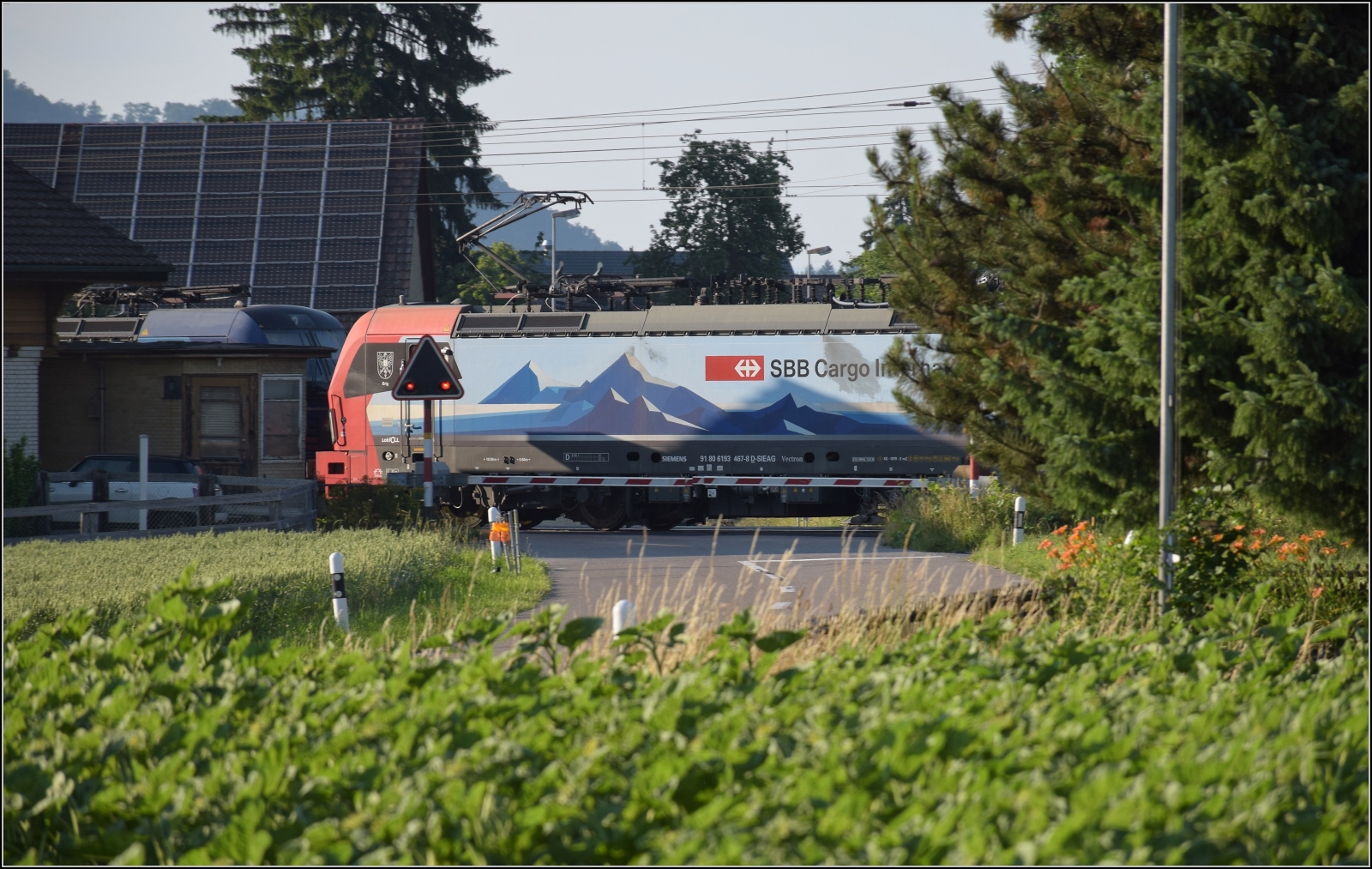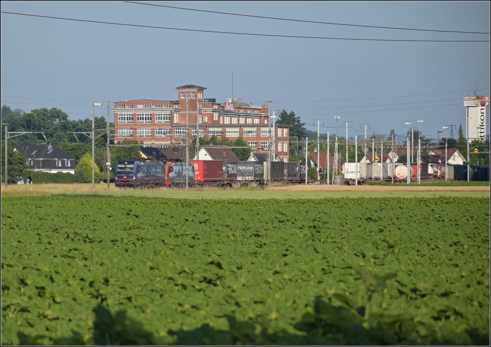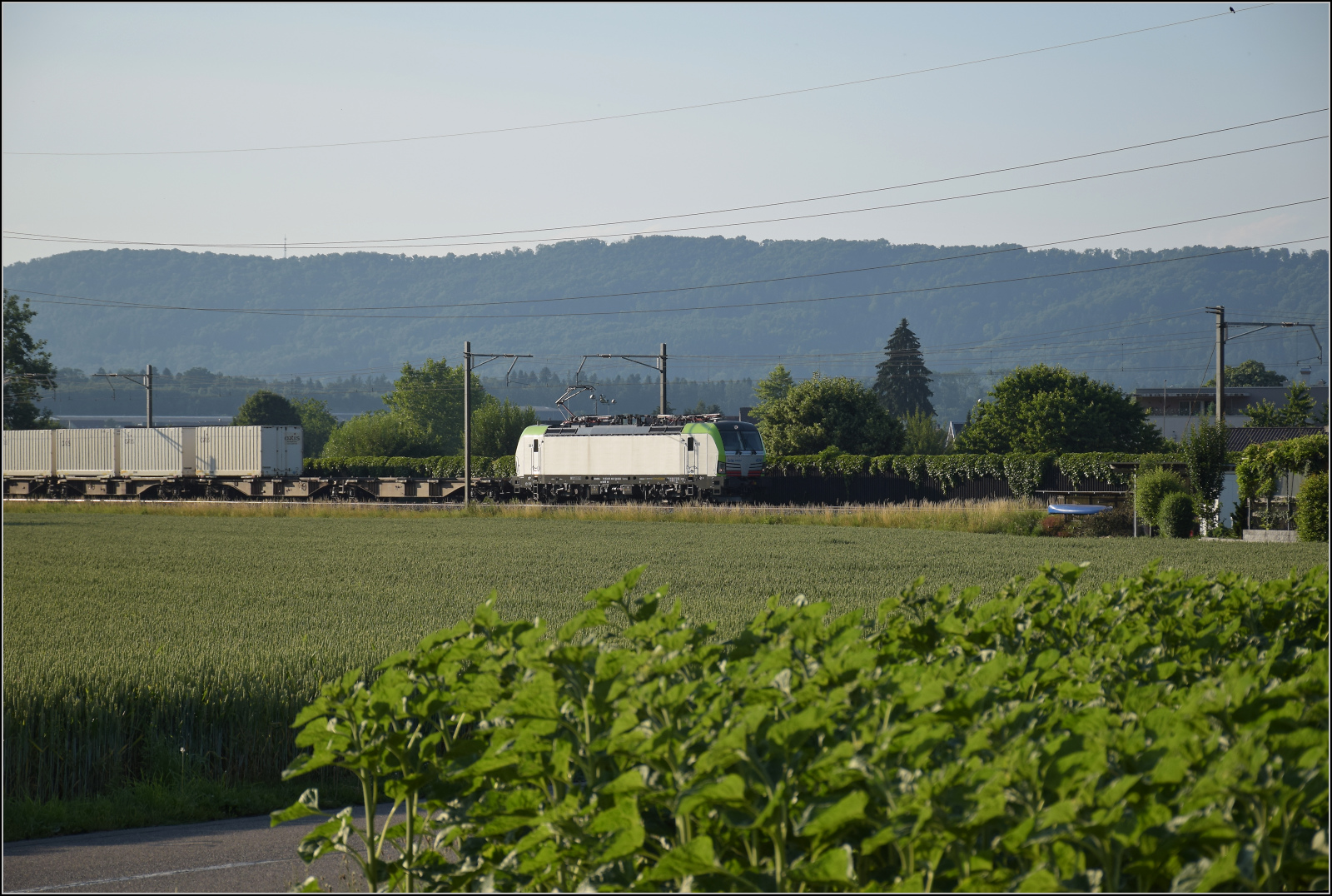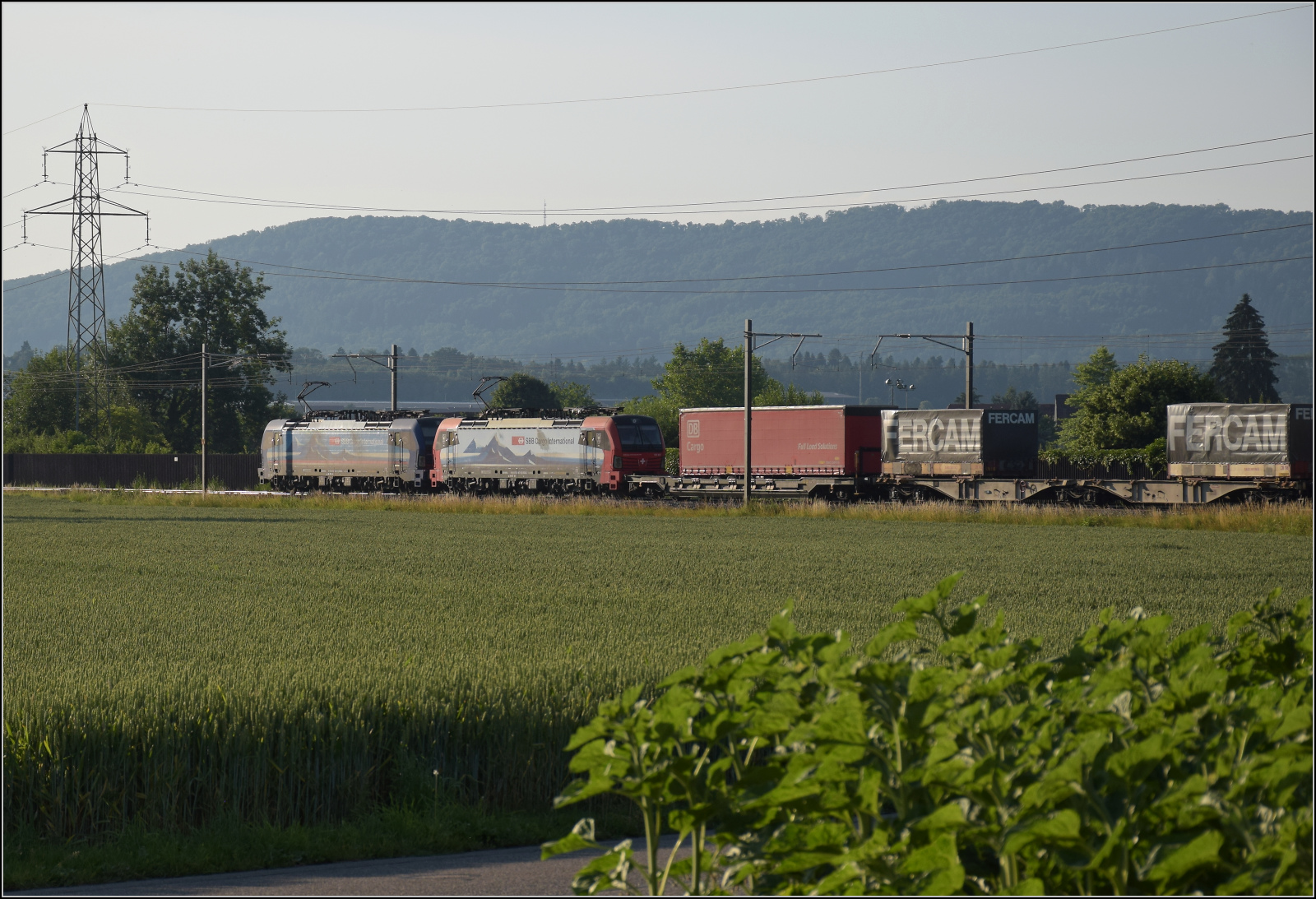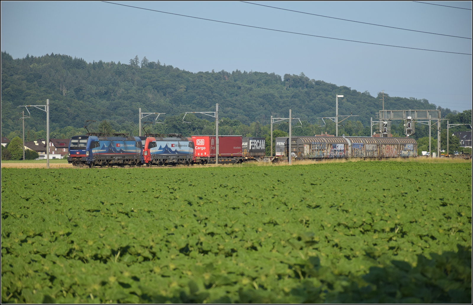 Für Abwechslung bei Hendschiken sorgt ein umgeleiteter Fernverkehrszug mit RABe 501 025 'Geneve' und RABe 501 020 'Luzern'. Juni 2025