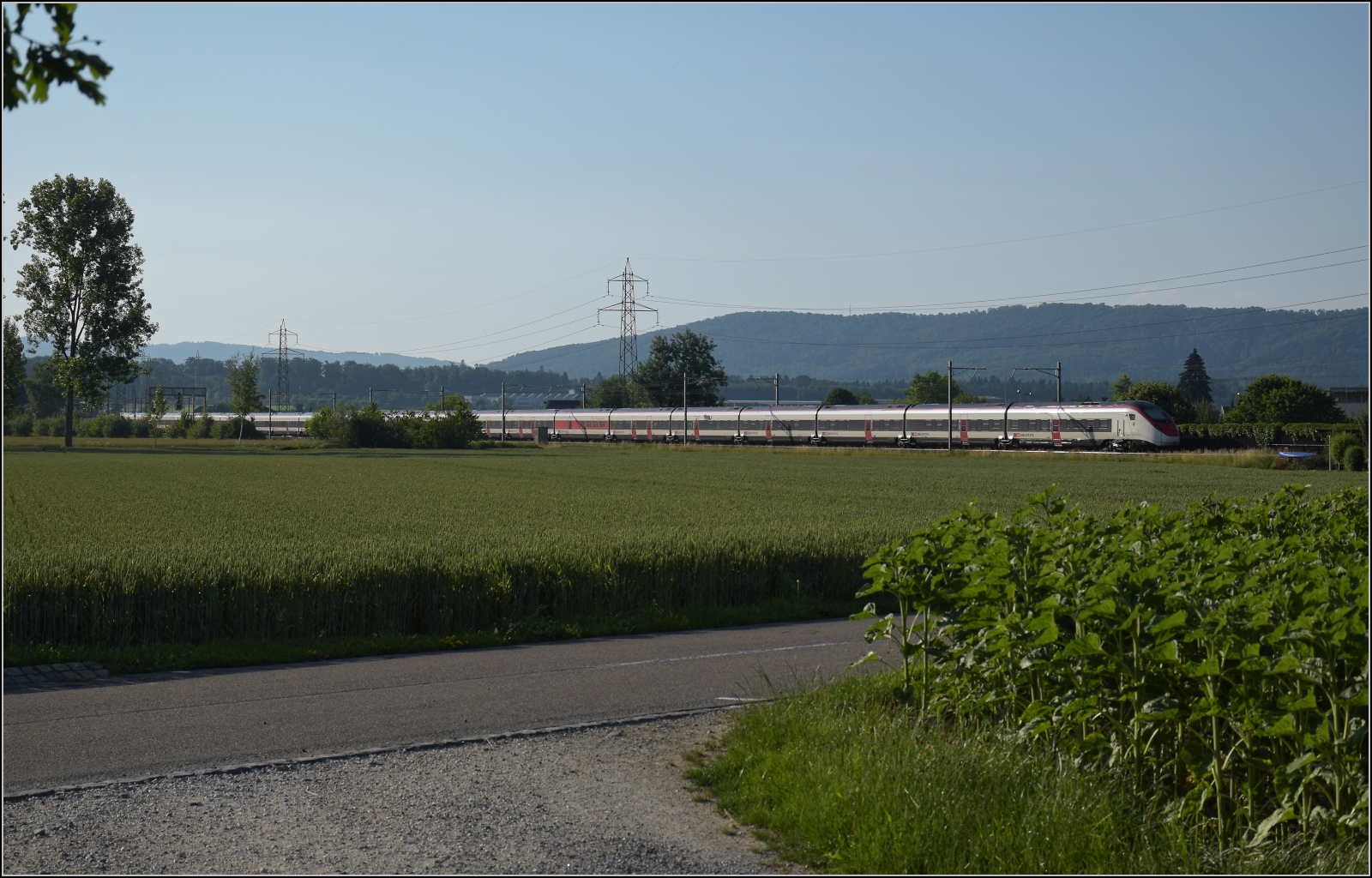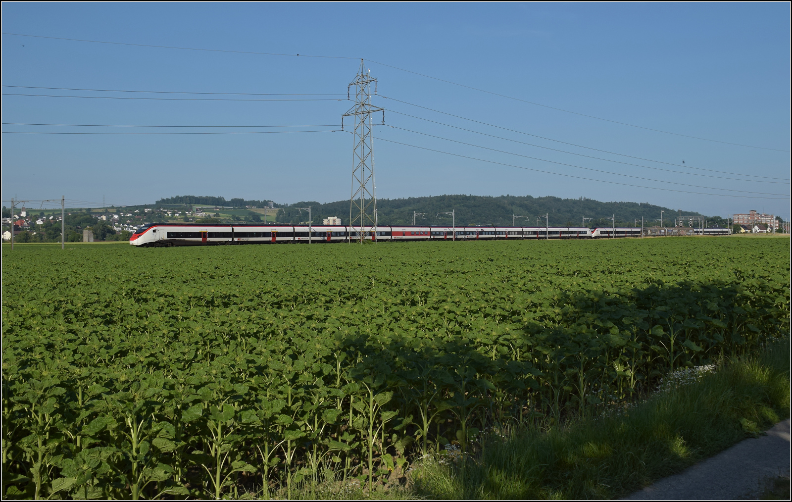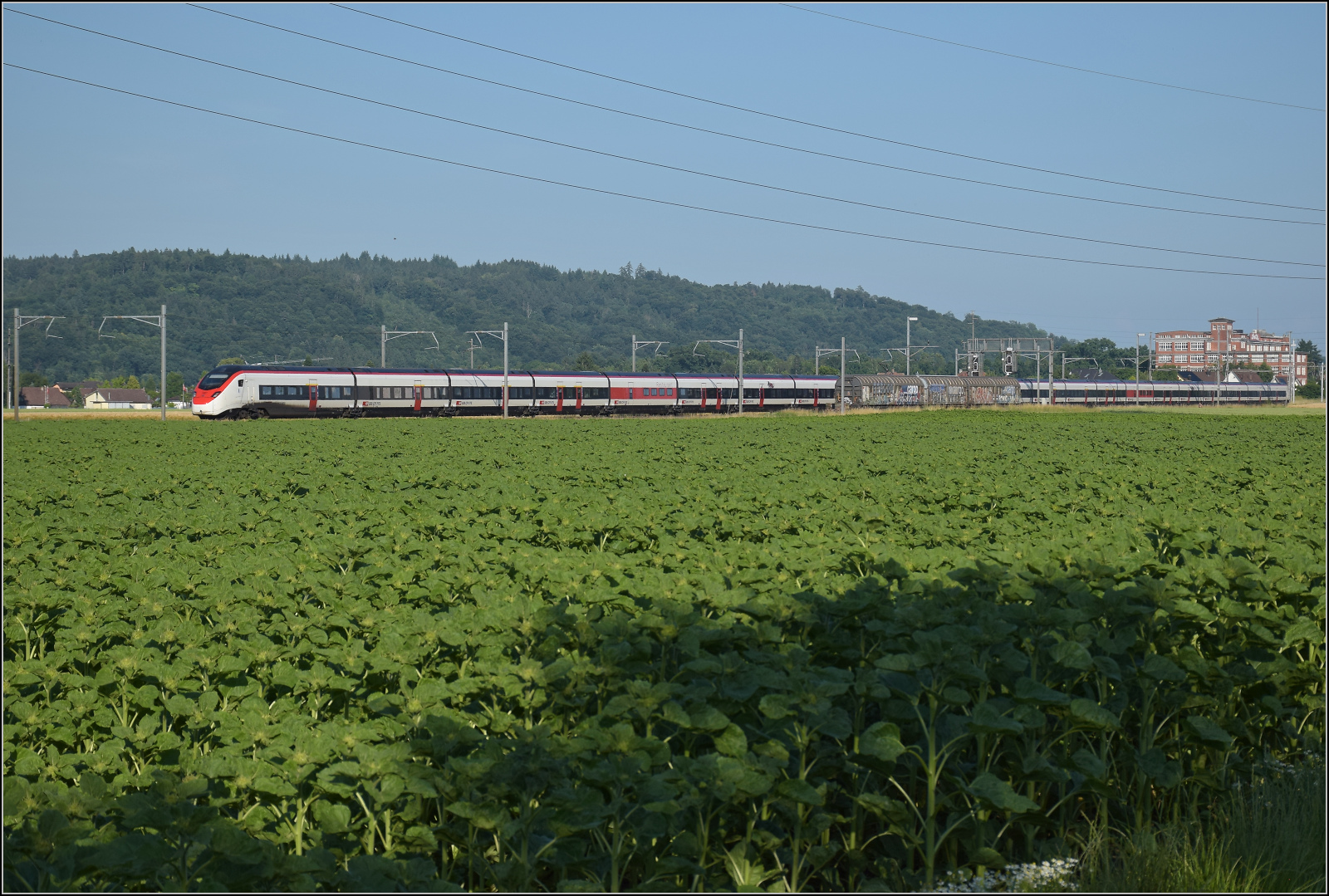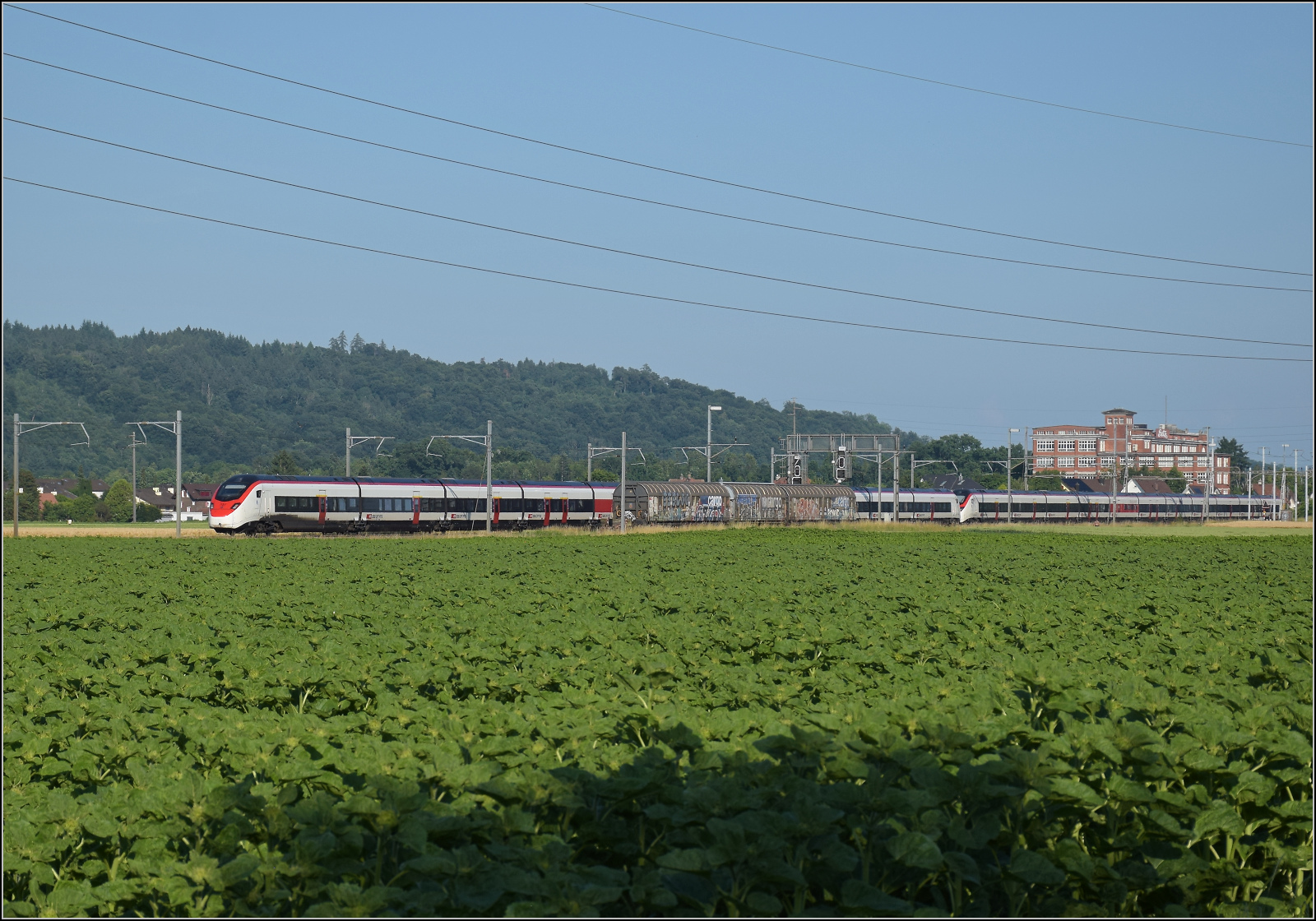 Für Abwechslung bei Hendschiken sorgt ein umgeleiteter Fernverkehrszug mit RABe 501 020 'Luzern' und RABe 501 025 'Geneve'. Juni 2025