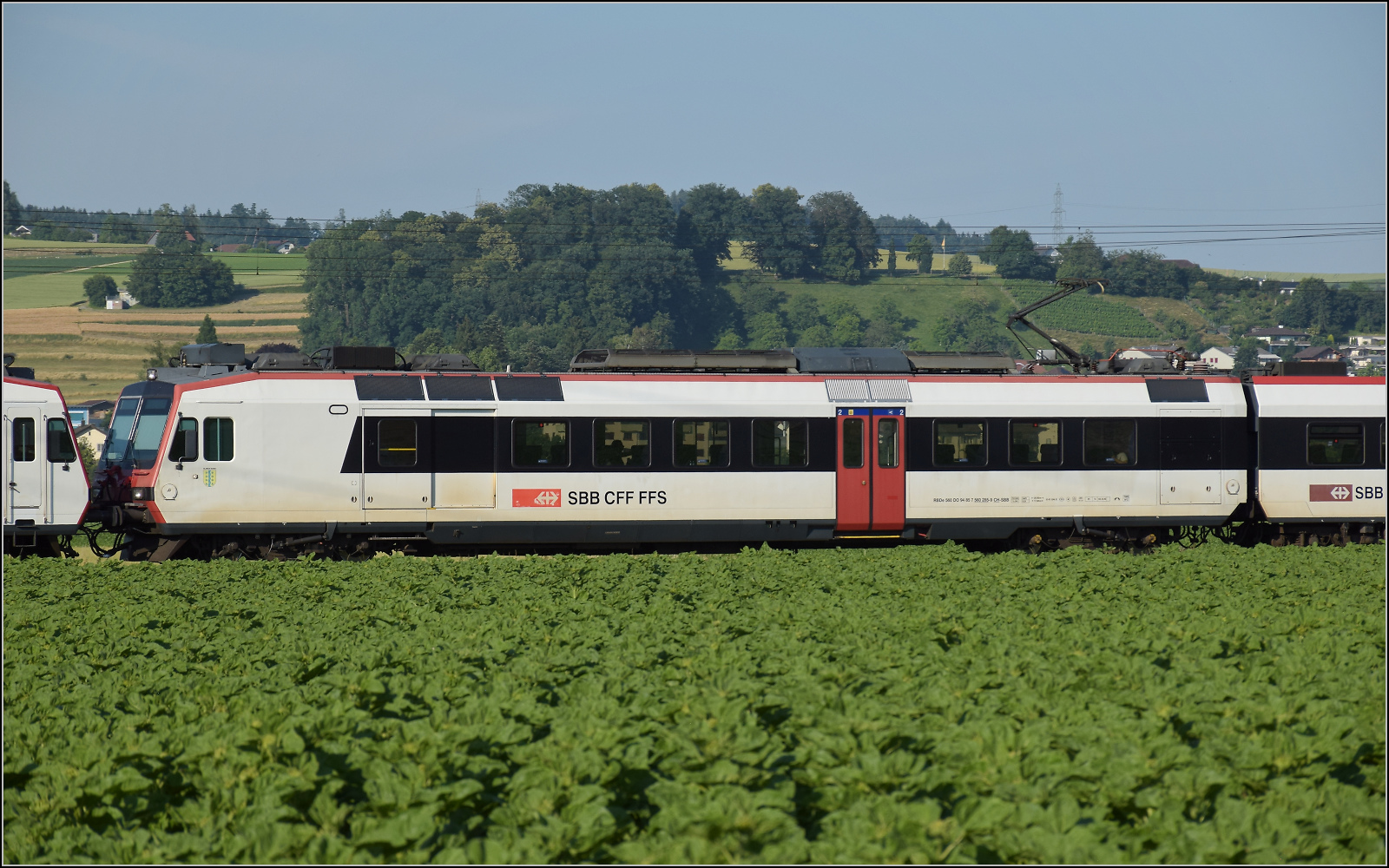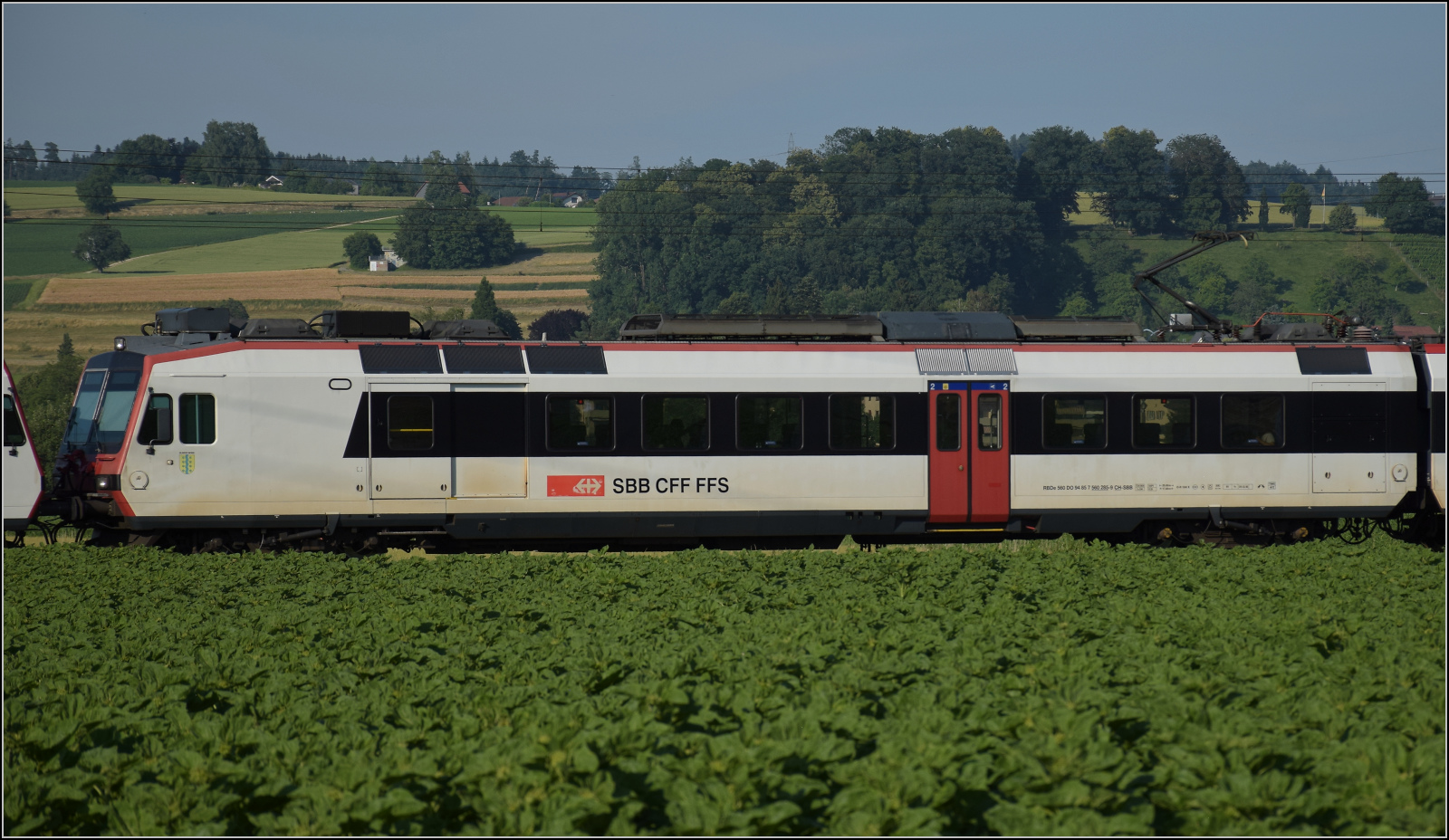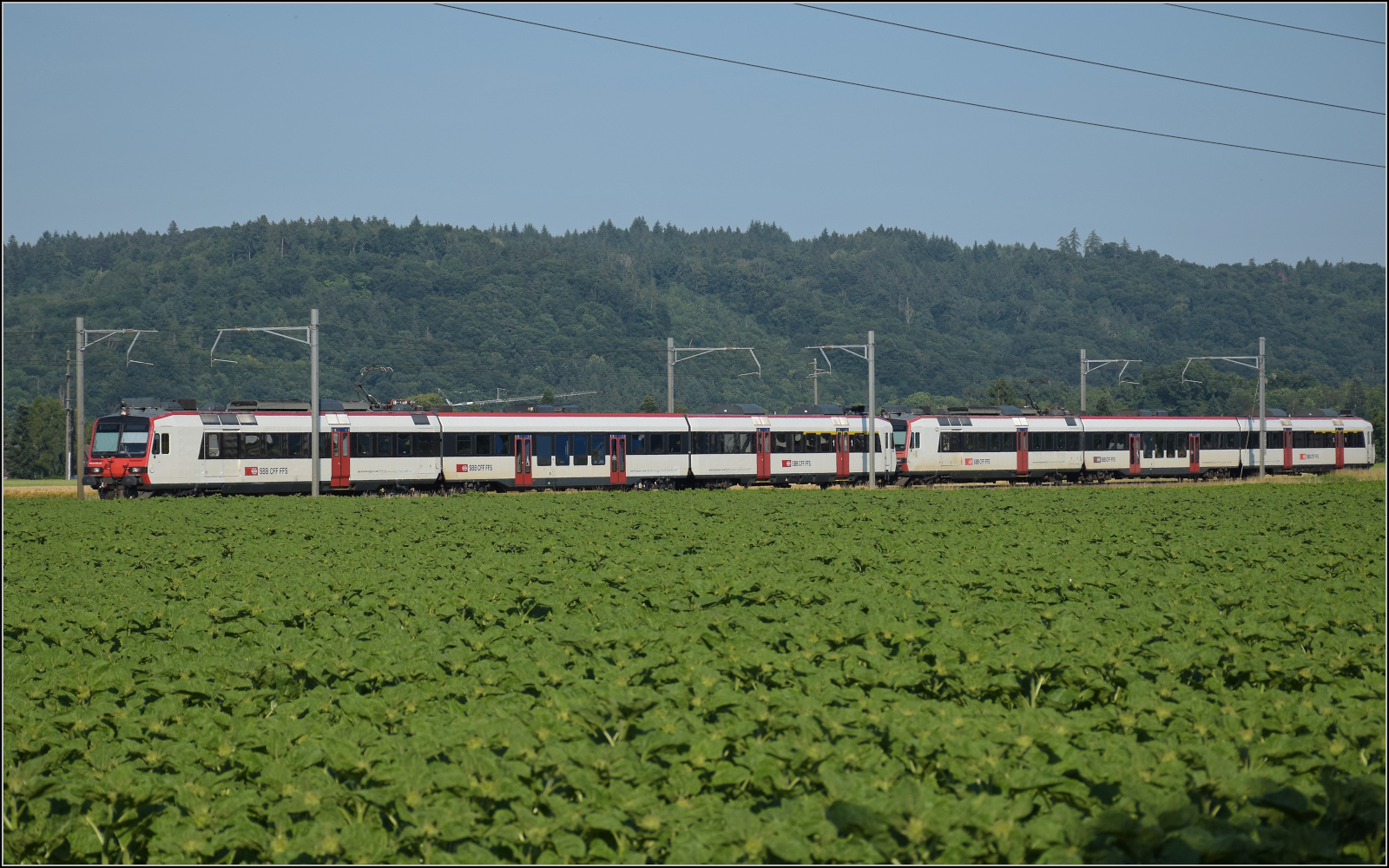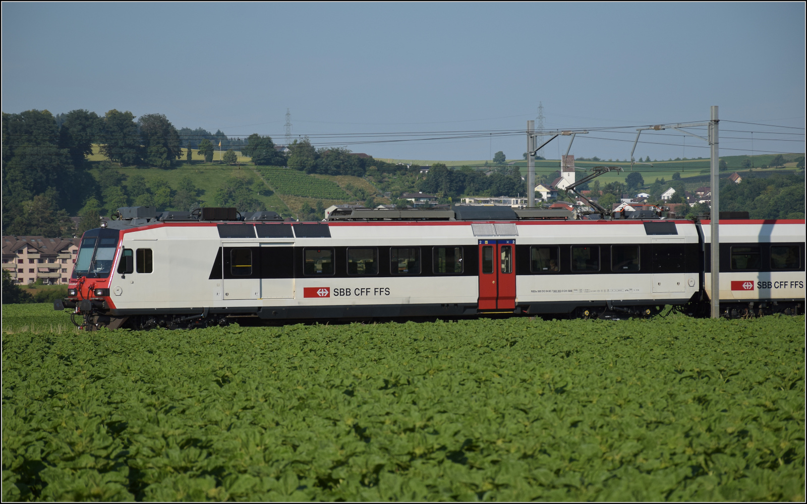 Für Abwechslung bei Hendschiken sorgt ein umgeleiteter Fernverkehrszug mit RABe 501 020 'Luzern' und RABe 501 025 'Geneve'. Juni 2025