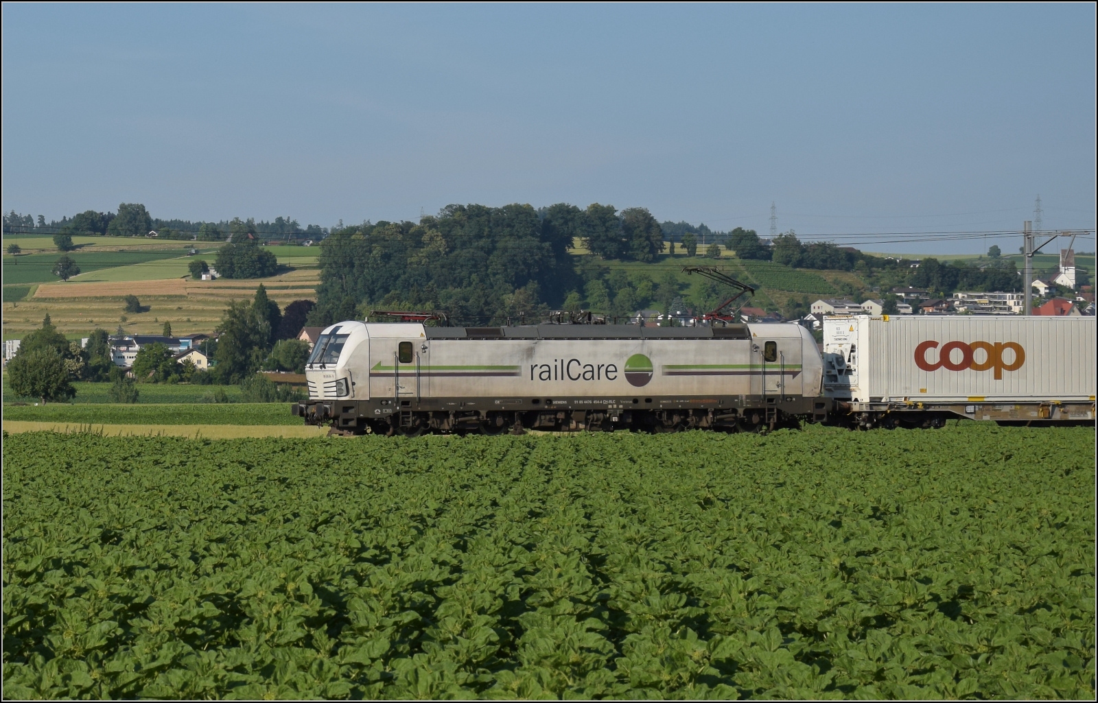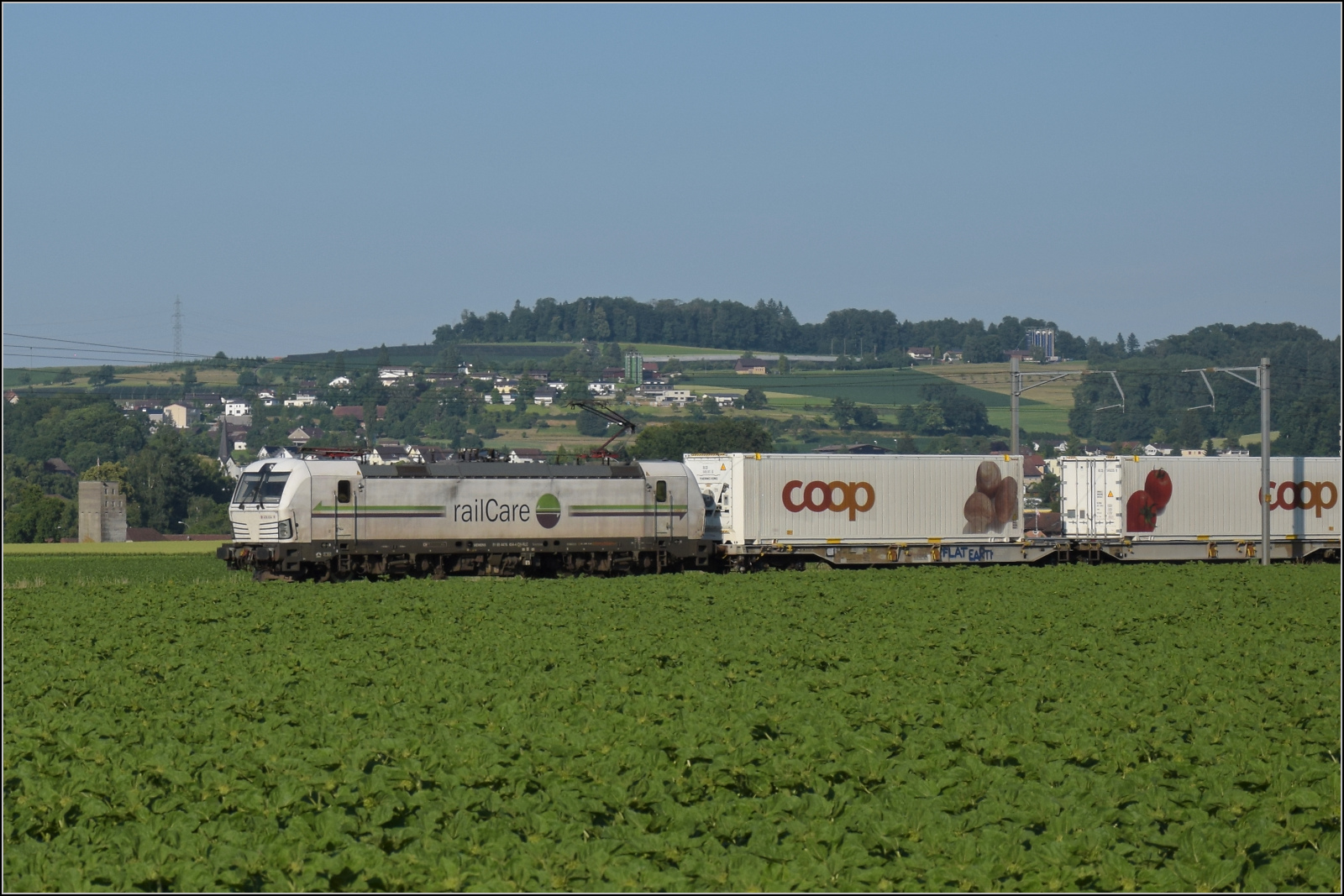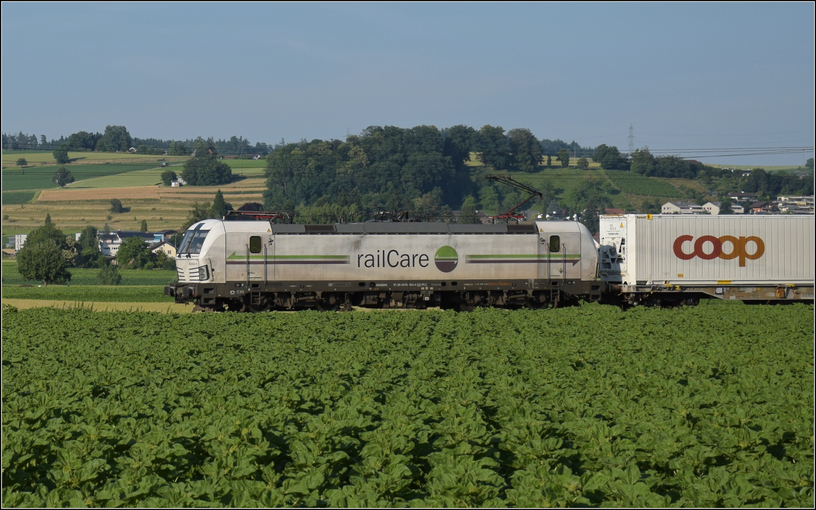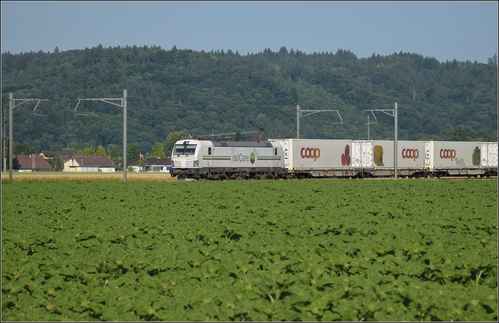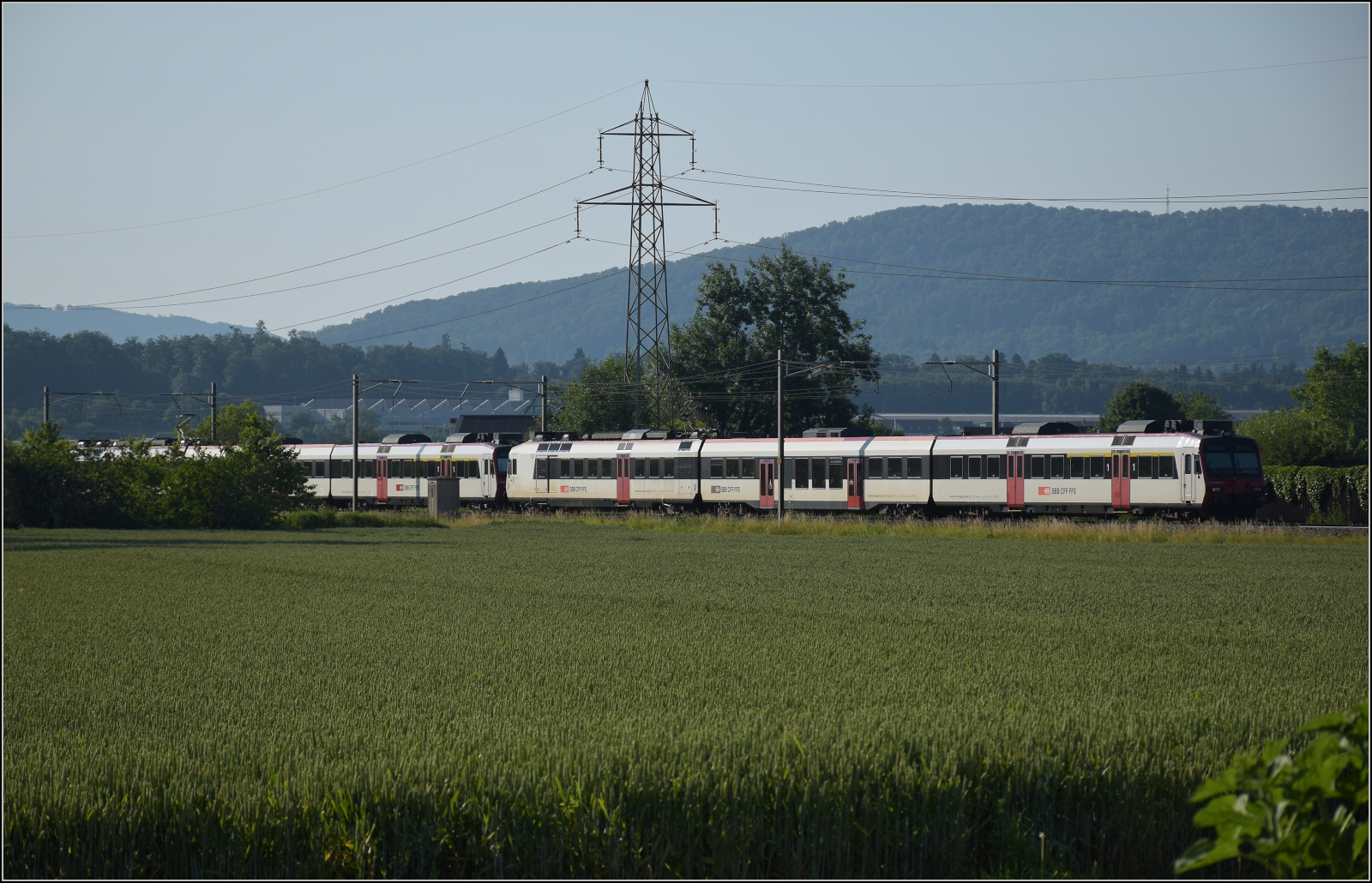Für Abwechslung bei Hendschiken sorgt ein umgeleiteter Fernverkehrszug mit RABe 501 020 'Luzern' und RABe 501 025 'Geneve'. Juni 2025