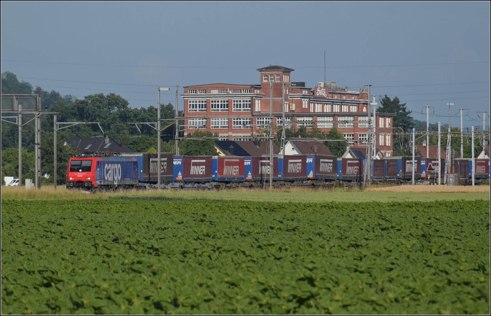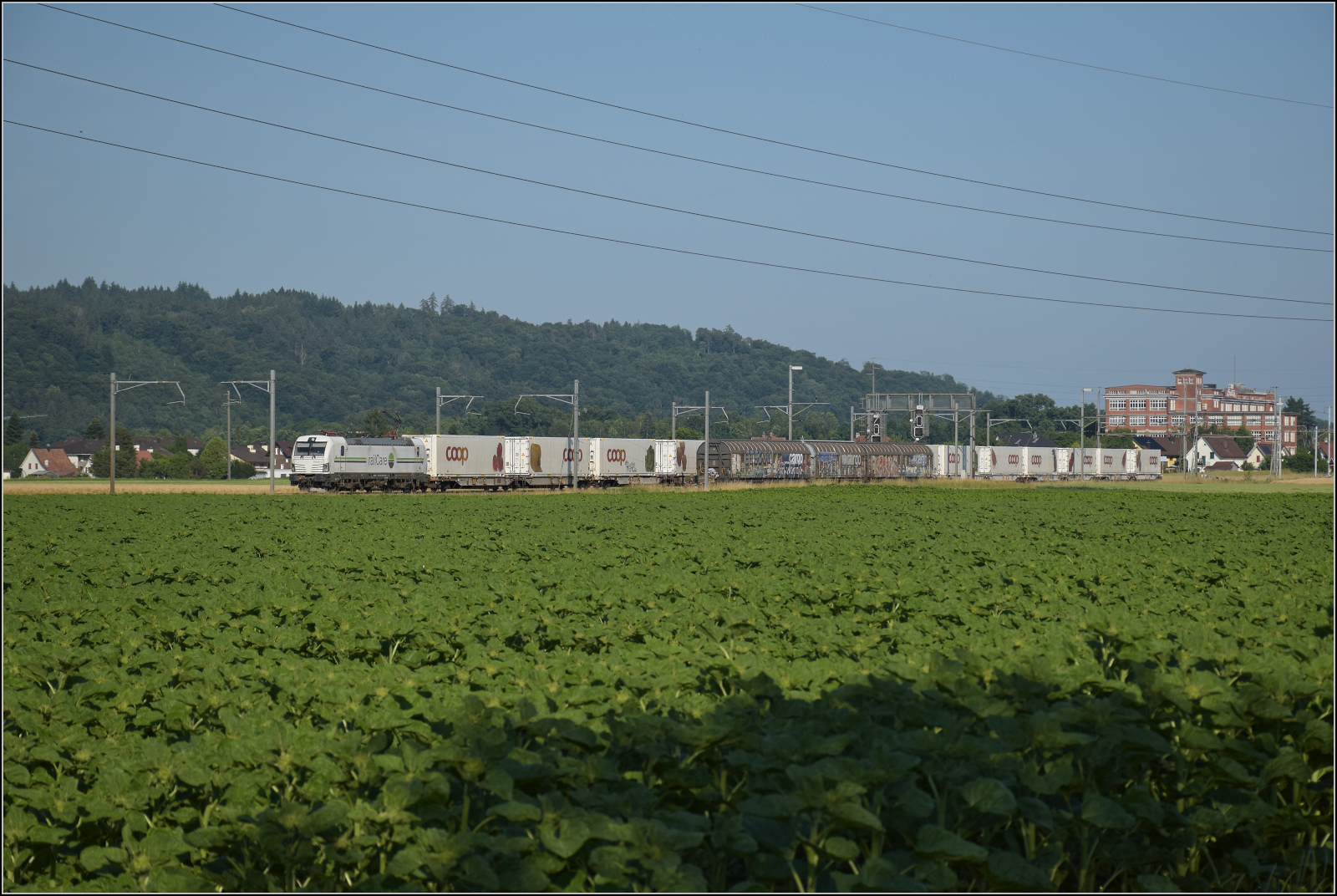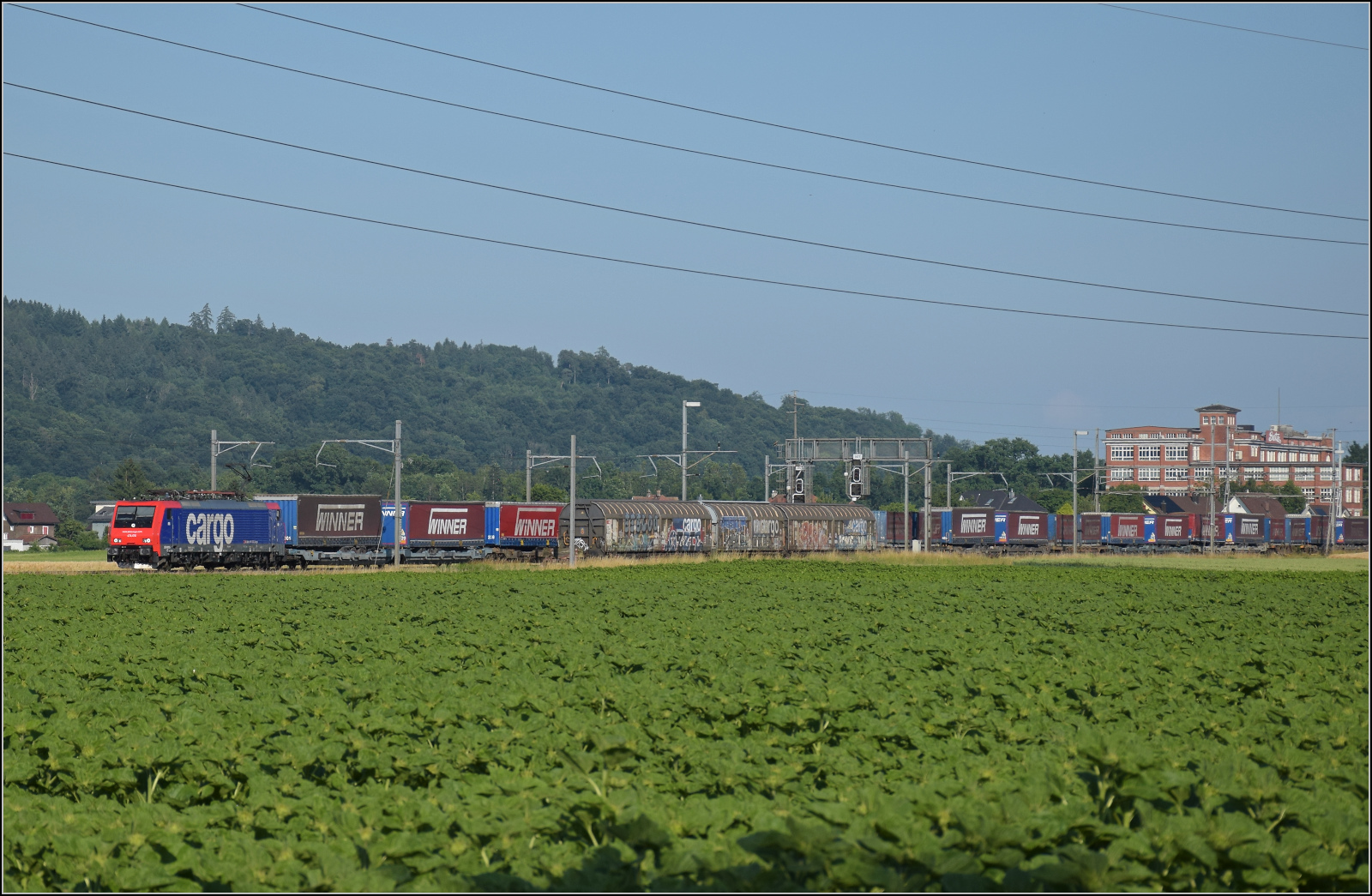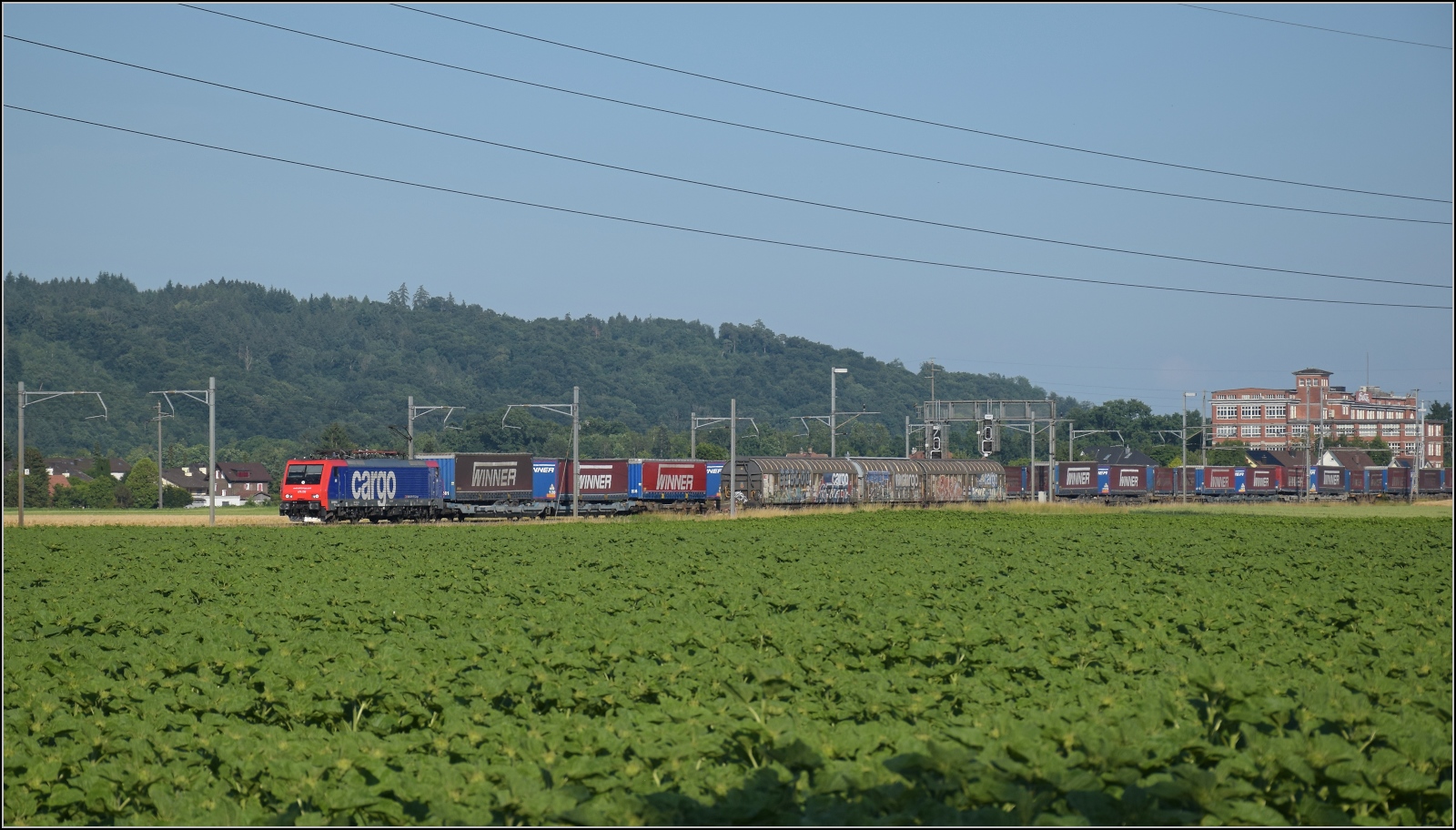 Für Abwechslung bei Hendschiken sorgt ein umgeleiteter Fernverkehrszug mit RABe 501 020 'Luzern' und RABe 501 025 'Geneve'. Juni 2025