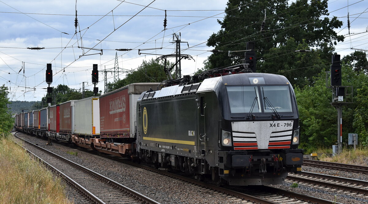 LTE Logistik- und Transport GmbH, Graz [A] mit der geleasten BRCE Vectron "X4 E - 796" [NVR-Nummer: 91 80 6193 796-0 D-DISPO] und einem KLV-Zug Richtung Frankfurt/Oder weiter nach Polen am 09.07.25 Höhe Bahnhof Saarmund. Lothar Stöckmann