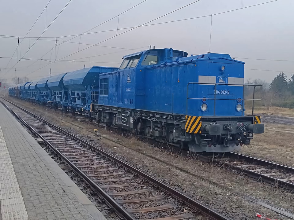 Drehgestell-Oberbaustoffwagen der Fa. H. F. Wiebe GmbH & Co. KG mit der Nr. 37 RIV 80 D-HFW 3842 143-6 Rlps mit Beton-Gleisschwellen beladen in einem Ganzzug am 10.07.25 Höhe Bahnhof Magdeburg Hbf. Lothar Stöckmann