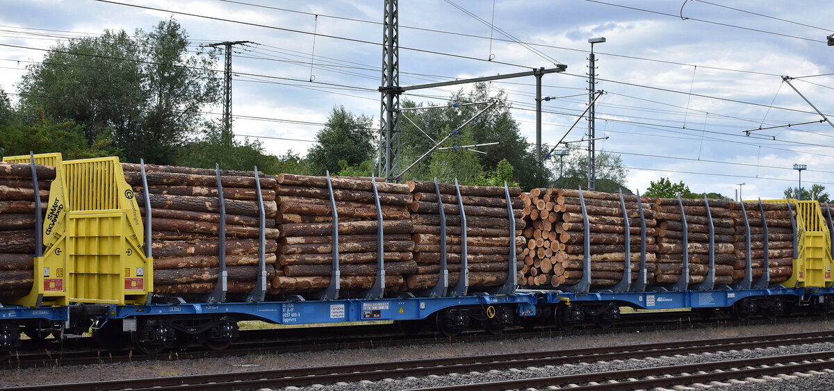Das Transportsystem Smart GigaWood von Innofreigt in Österreich mit der Drehstell-Transportwageneinheit mit den hohen Rungen beladen mit Stammholz, im Bild der Wagen mit der Nr. 35 TEN 81 A-IF 4657 605-5 Sggmrrs in einem Ganzzug am 10.07.25 Höhe Bahnhof Magdeburg Hbf. Lothar Stöckmann