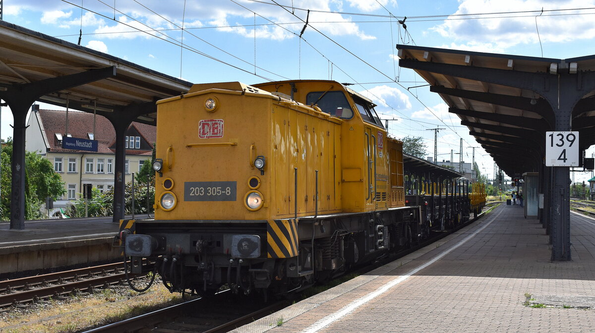 DB InfraGO AG, Frankfurt (Main)/DB Netz Instandhaltung mit ihrer "203 305-8" [NVR-Nummer: 92 80 1203 305-8 D-DBMP] und zwei Drehgestell-Flachwagen am 10.07.25 Durchfahrt Bahnhof Magdeburg-Neustadt. Lothar Stöckmann
