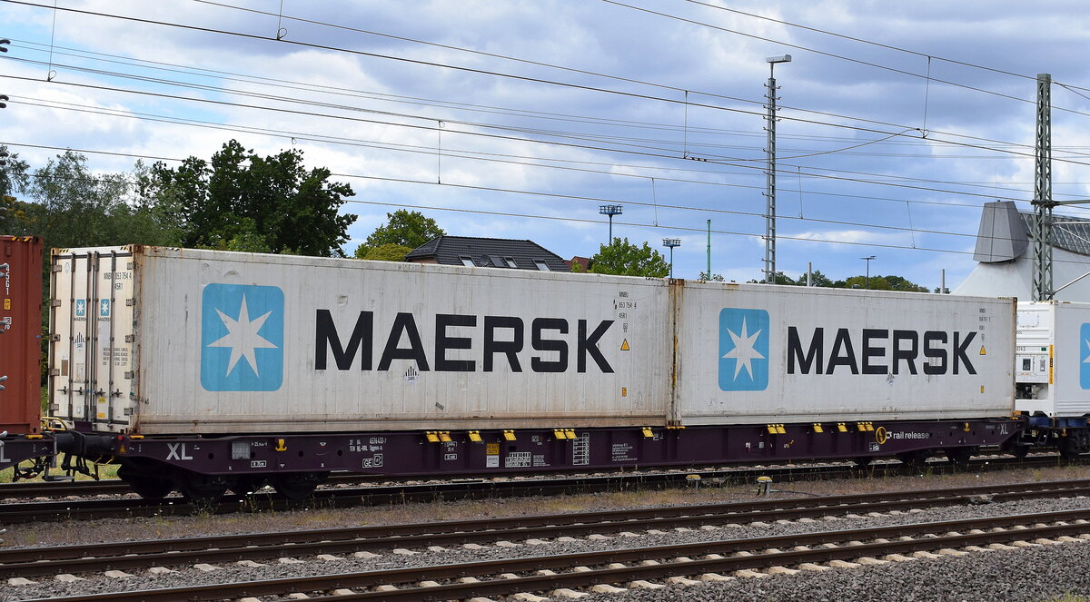 Drehgestell-Containertragewagen vom Einsteller RailReLease B.V. mit der Nr. 37 TEN 84 NL-RRL 4576 432-7 Sggnss-XL beladen mit Kühlcontainern in einem Ganzzug am 10.07.25 Höhe Bahnhof Magdeburg Hbf. Lothar Stöckmann