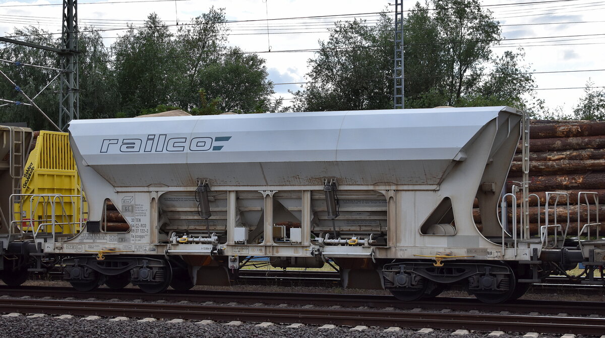 Drehgestell-Schüttgutwagen mit dosierbarer Schwerkraftentladung vom Einsteller Railco a.s. aus Tschechien für Captrain im Einsatz mit der Nr. 33 TEN 54 CZ-RCO 6937 122-3 Faccnpps 442.1 leladen mit Sand in einem Ganzzug am 10.07.25 Höhe Bahnhof Magdeburg Hbf. Lothar Stöckmann