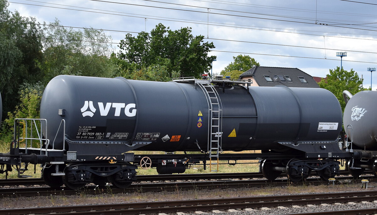 Kesselwagen vom Einsteller VTG mit der Nr. 37 TEN 80 D-VTG 7929 082-1 Zacns (GE) für das Ladegut Salzsäure siehe UN-Nr.: 80/1789 in einem gemischten Güterzug am 10.07.25 Höhe Bahnhof Magdeburg Hbf. Lothar Stöckmann