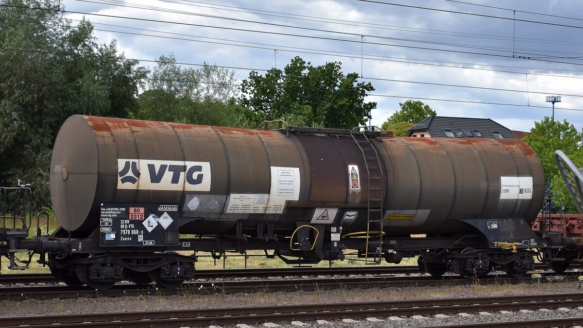 Kesselwagen vom Einsteller VTG mit der Nr. 33 RIV 80 D-VTG 7970 060-9 Zaens für das Ladegut Phenol, geschmolzen siehe UN-Nr.: 60/2312 in einem gemischten Güterzug am 10.07.25 Höhe Bahnhof Magdeburg Hbf. Lothar Stöckmann