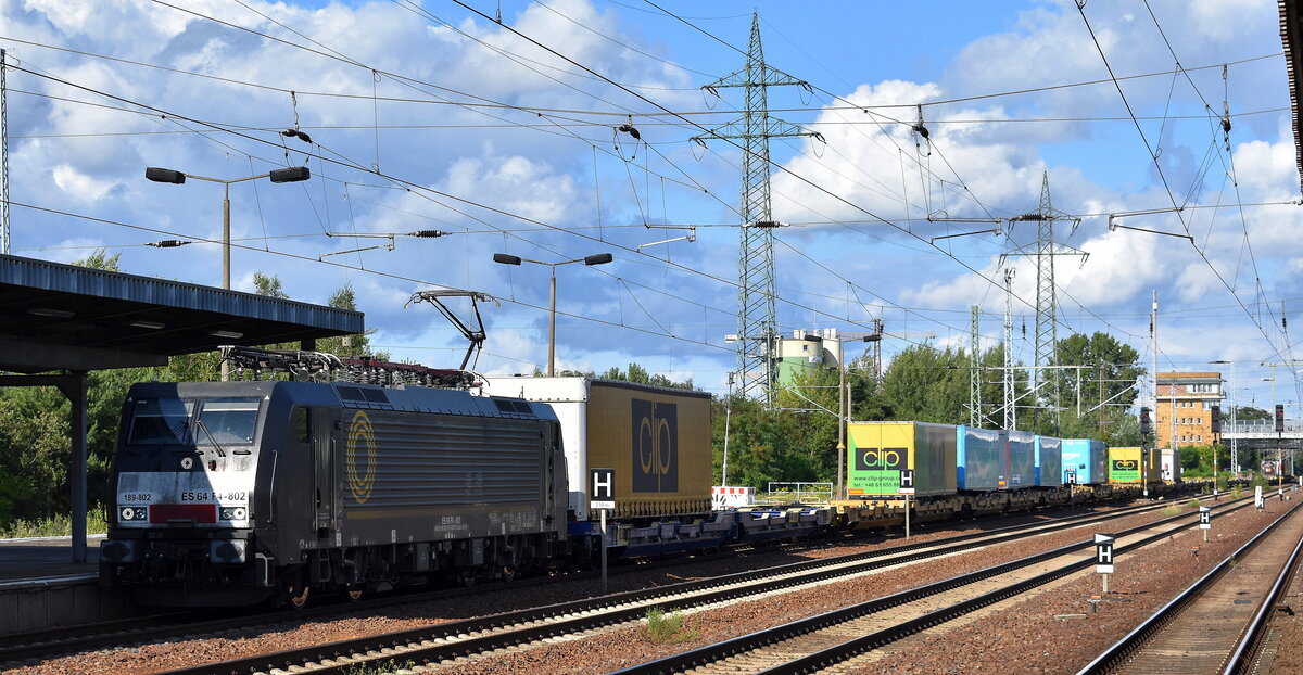 LTE Polska Sp. z o.o., Gdynia [D] mit der geleastewn BRCE Dispo Lok "ES 64 F4-802" [NVR-Nummer: 91 80 6189 802-2 D-DISPO] und einem KLV-Zug am 04.08.25 Durchfahrt Bahnhof Schönefeld bei Berlin. Lothar Stöckmann