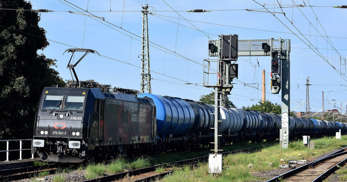 Lotos Kolej Sp. z o.o. mit der geleasten CARGOUNIT Lok "370 041-3/ E 186 929" [NVR-Nummer: 91 51 5370 041-3 PL-ID] und einem Kesselwagenzug am 11.08.25 Höhe Bahnhof Magdeburg-Neustadt. Lothar Stöckmann