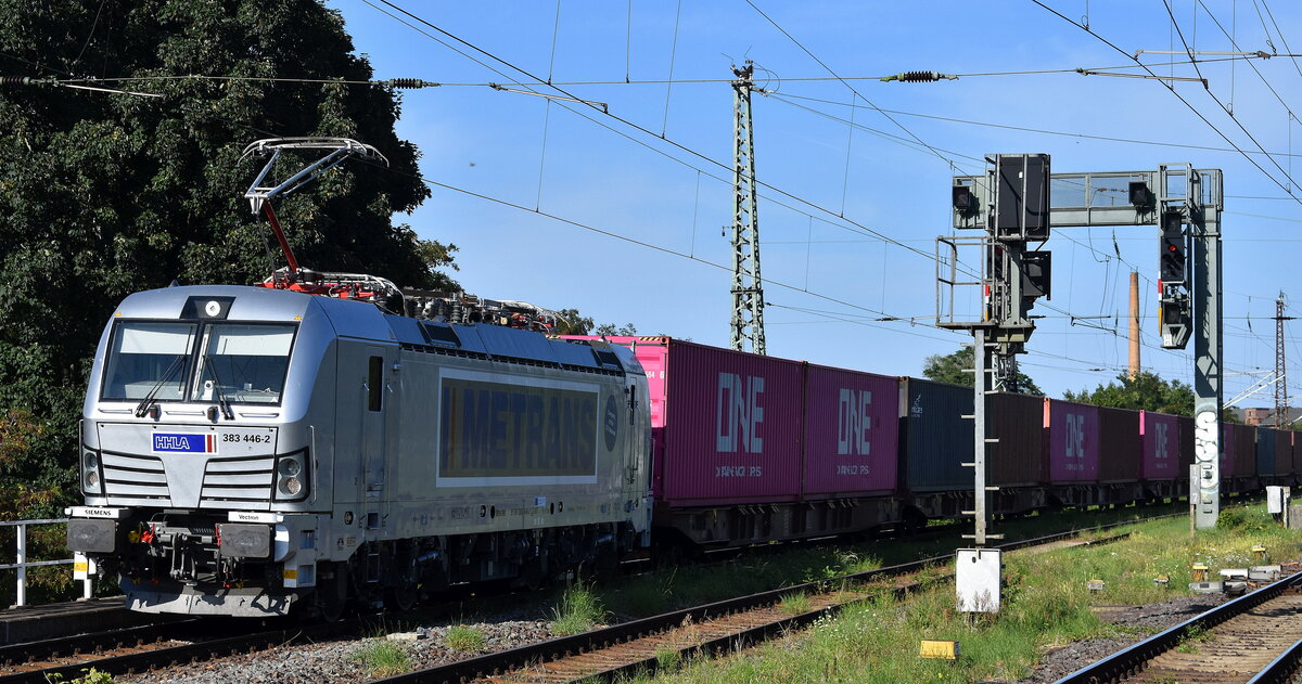 METRANS a.s., Praha [CZ] mit ihrer neuen Vectron "383 446-2" [NVR-Nummer: 91 54 7383 446-2 CZ-MTR] und einem Containerzug am 11.08.25 Höhe Bahnhof Magdeburg-Neustadt.