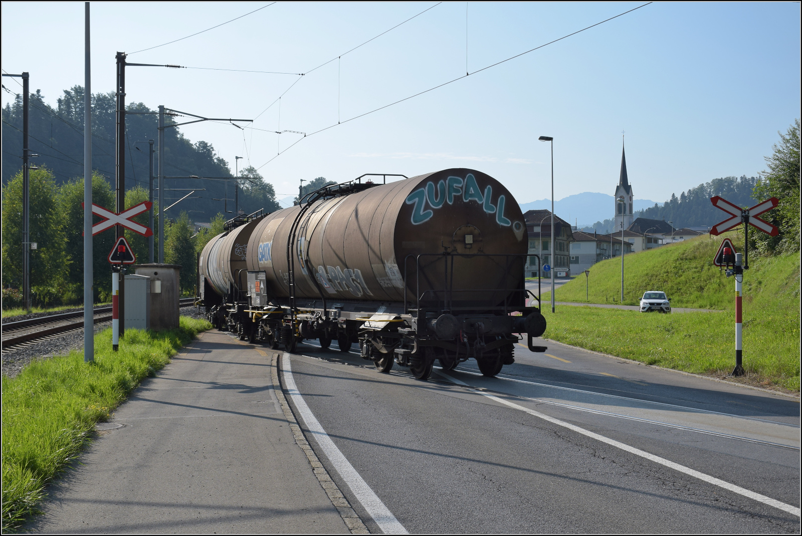 Nachdem der Scheitelpunkt der Strecke überschritten war, gab es wegen Bahnübergangsstörung in Weier einen Zwangsstopp. Ein Schrankenbaum wollte nicht schließen. Eine Demonstration, dass nicht nur im Nachbarland die Bahn an ihren Vorschriften erstickt. Man könnte meinen, mit einer roten Flagge sollte der Fall erledigt sein, die Autofahrer hatten ohnehin ganz brav alle angehalten. Nachdem sich im dritten Anlauf kein Erfolg eingestellt hatte, wurde der fehlbare Schrankenbaum von einem mittlerweile eingetroffenen grösserem Trupp Museumsbahner von Hand heruntergekurbelt. Es gibt offenbar viele Möglichkeiten, einen Bahnübergang zu bedienen. Die naheliegendste scheint aber nicht erlaubt, dem müssen sich auch die Museumsbahner beugen... Weier i.E., Mai 2025. Olli