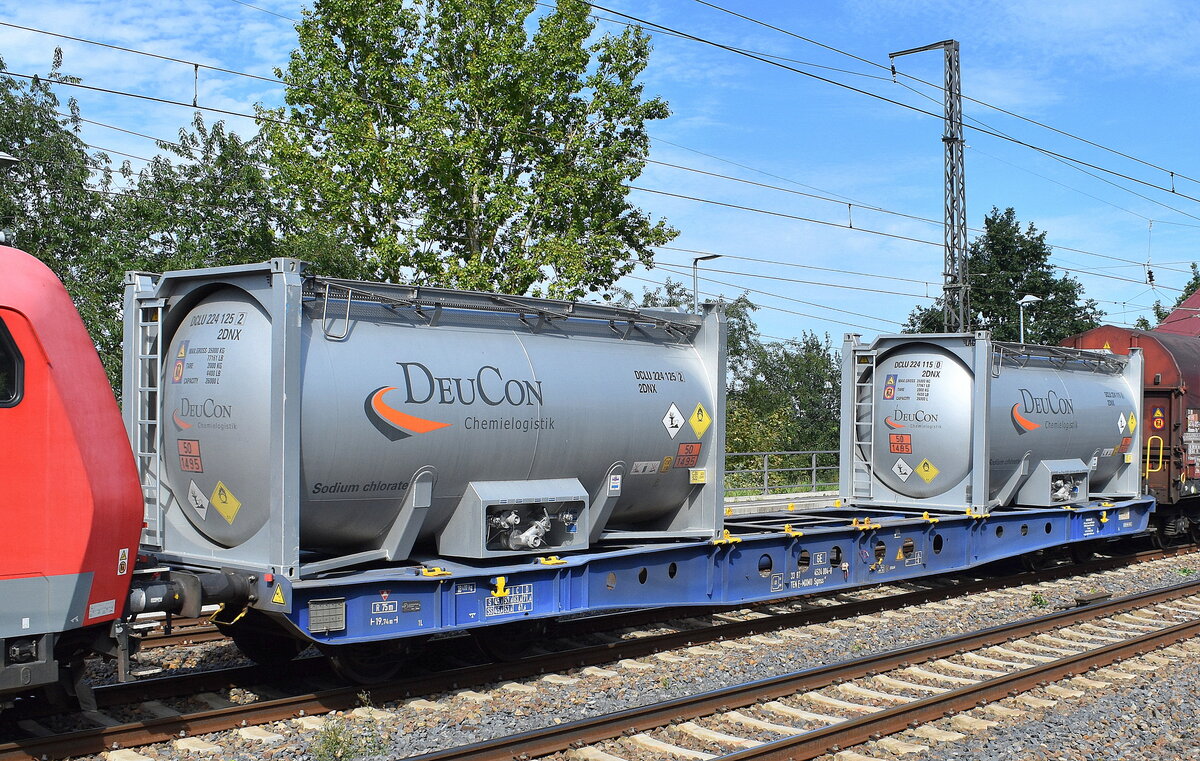 Französischer Drehgestell-Containertragwagen vom Einsteller Modalis SAS mit der Nr. 33 TEN 87 F-MXMU 4524 004-8 Sgnss in einem gemischten Güterzug am 12.08.25 Höhe Bahnhof Saarmund. Lothar Stöckmann