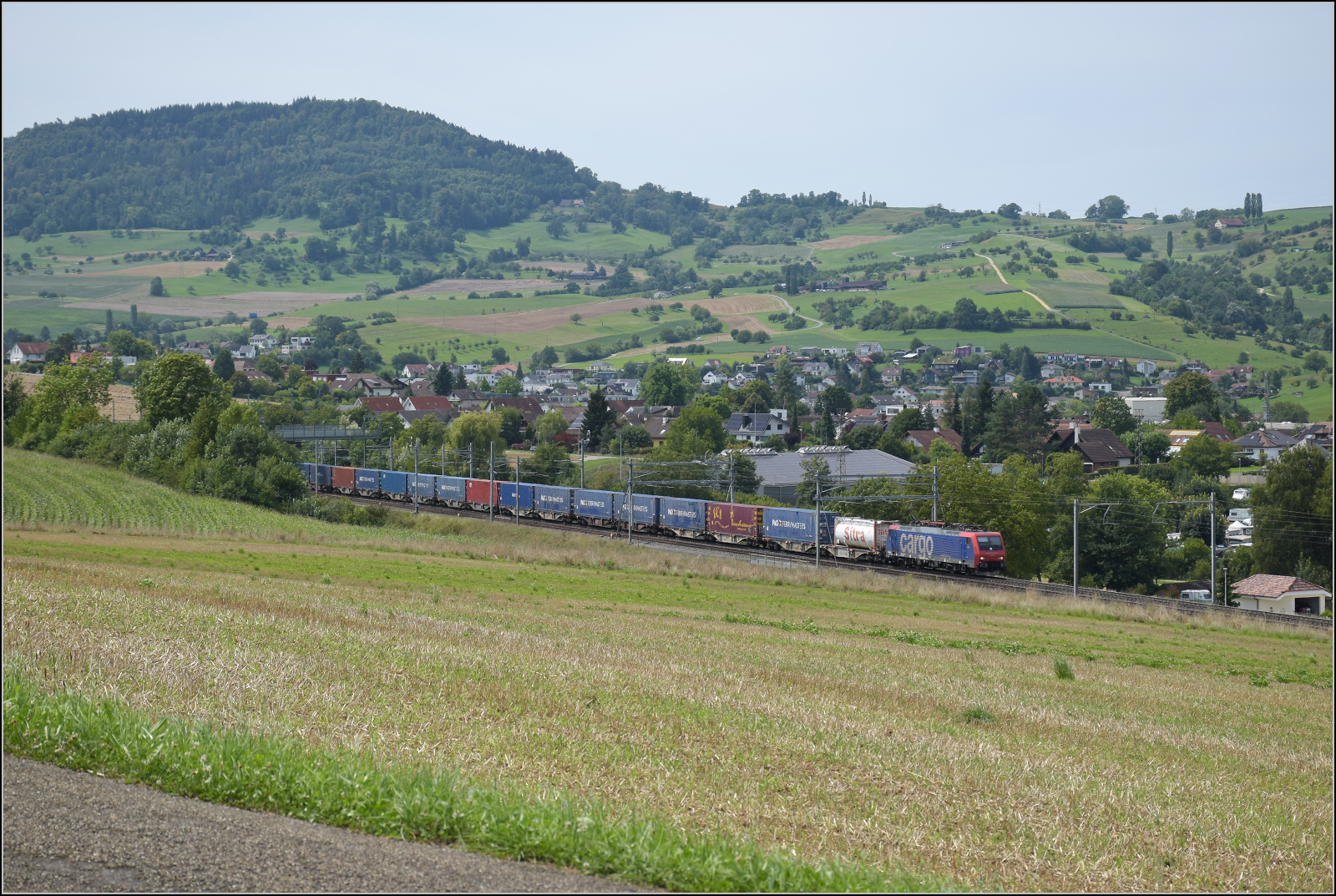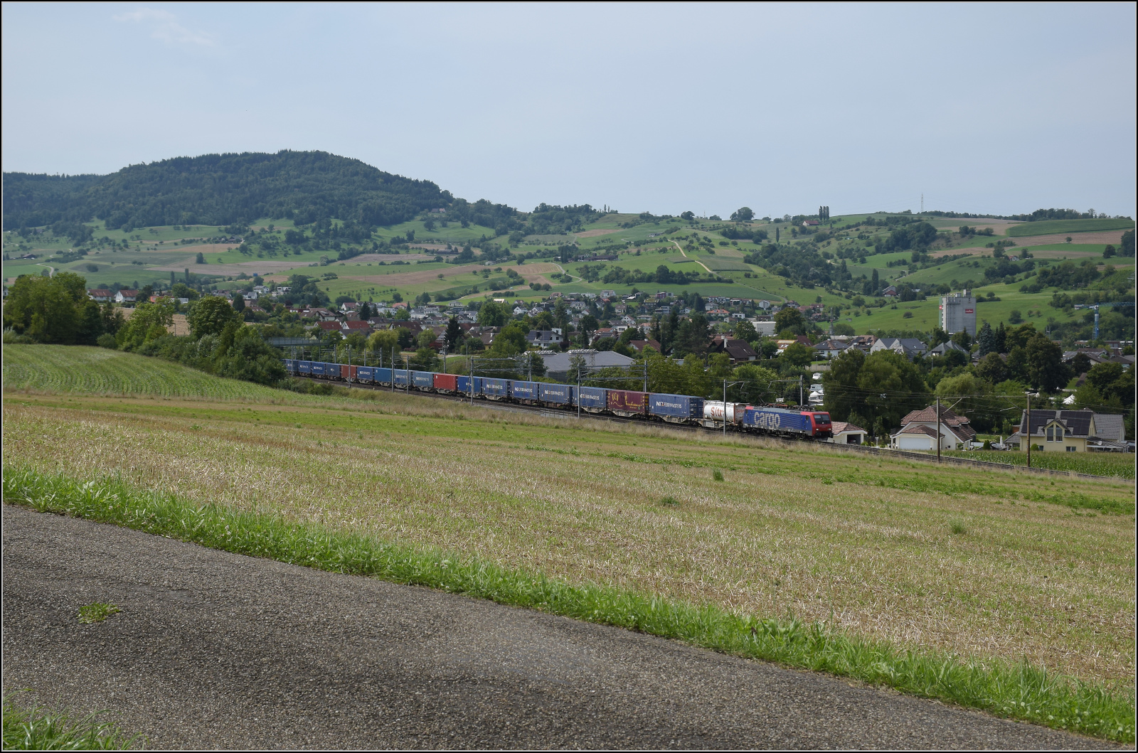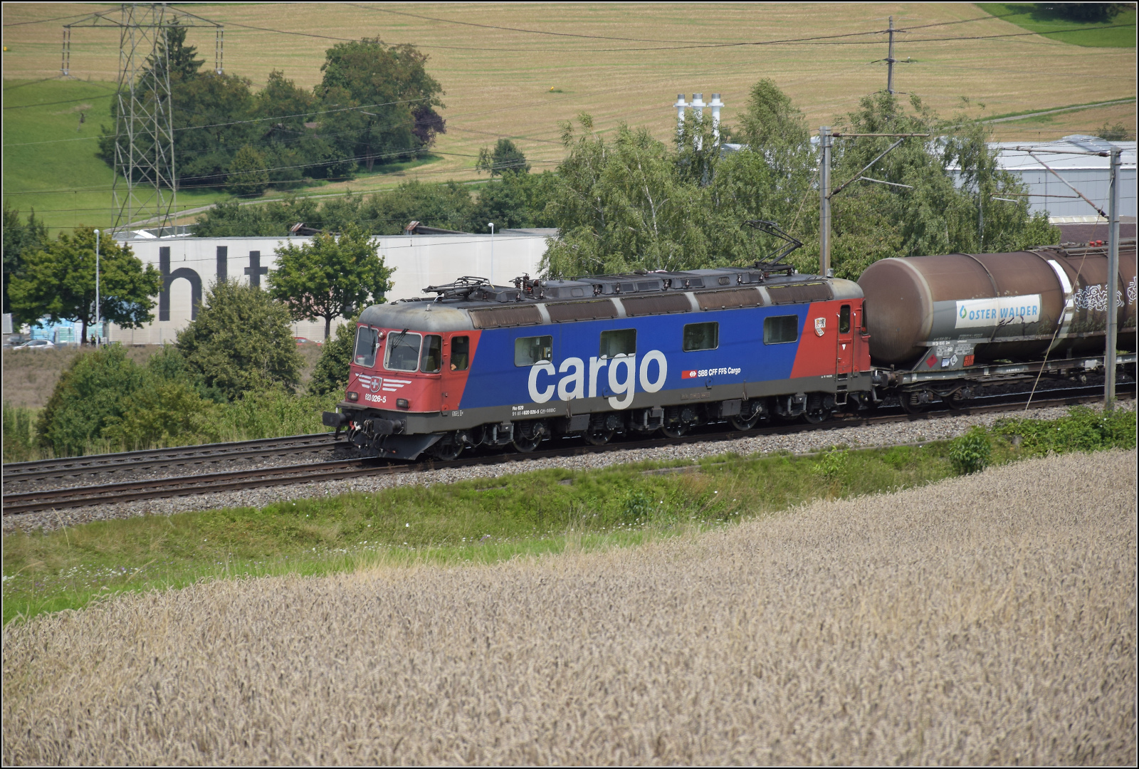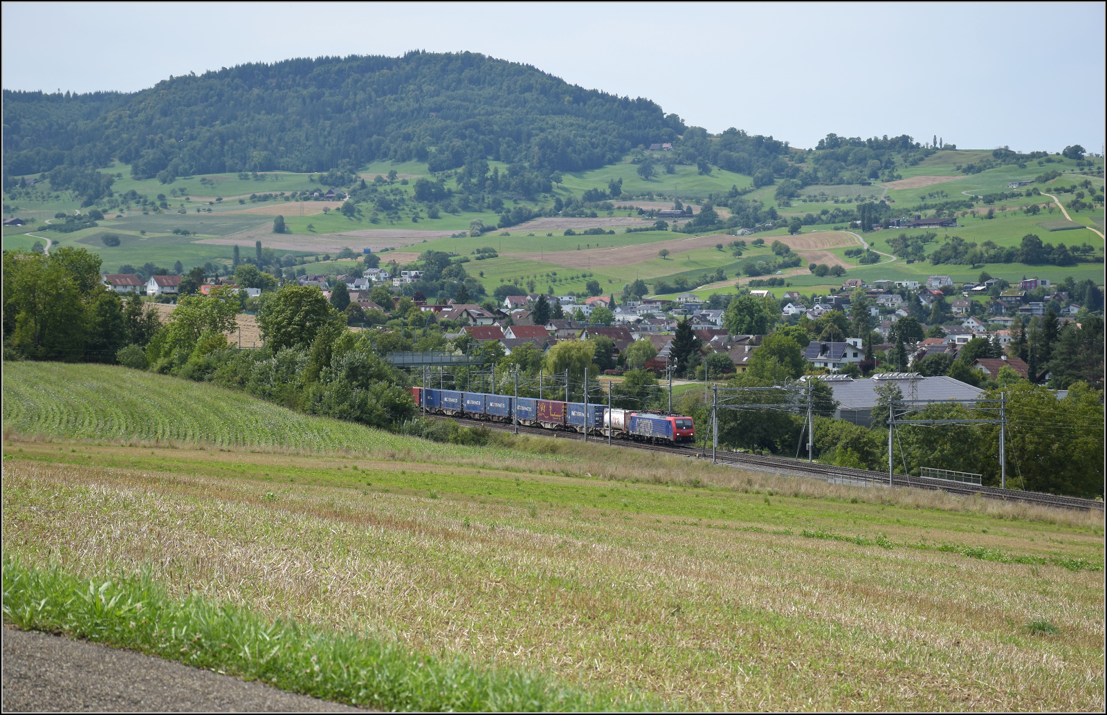 DB Cargo AG, Mainz [D] mit ihrer Vectron "193 562" [NVR-Nummer: 91 80 6193 562-6 D-DB] und einem gemischten Güterzug am 12.08.25 Höhe Bahnhof Saarmund. Lothar Stöckmann