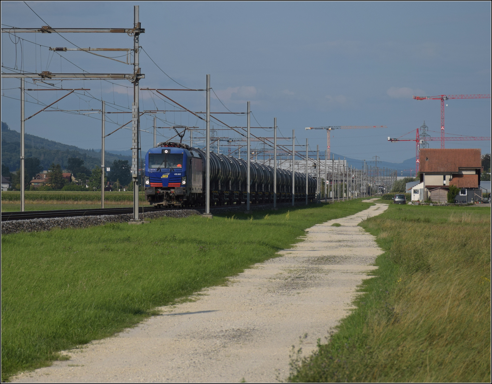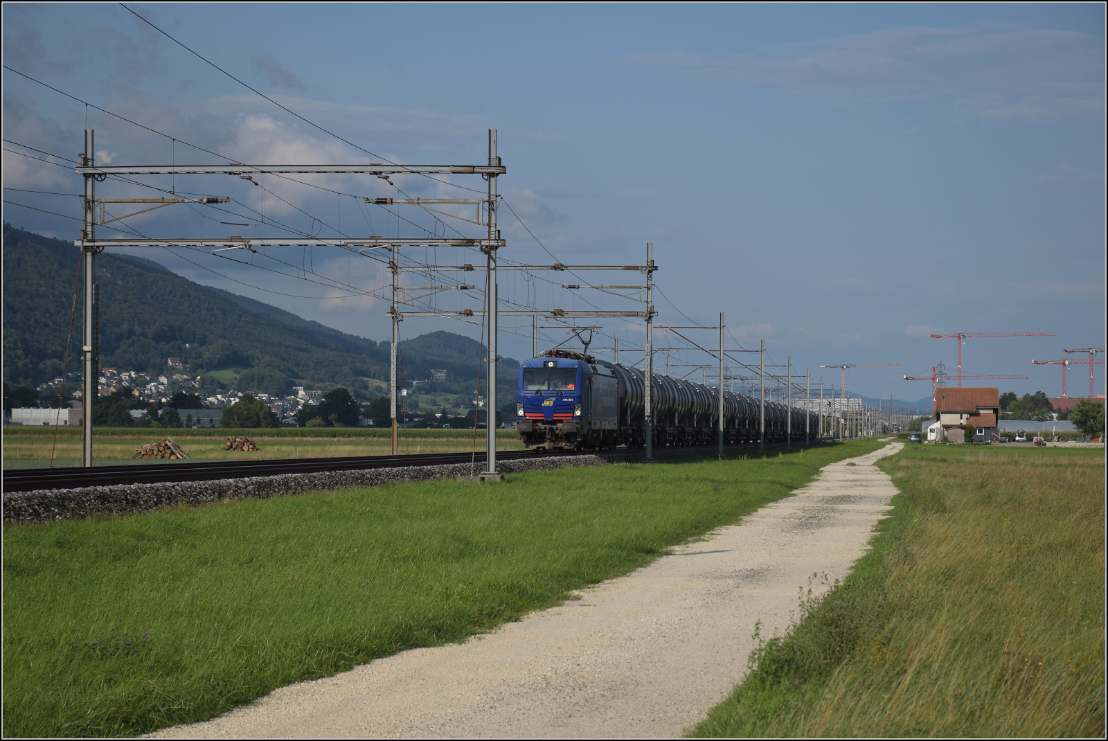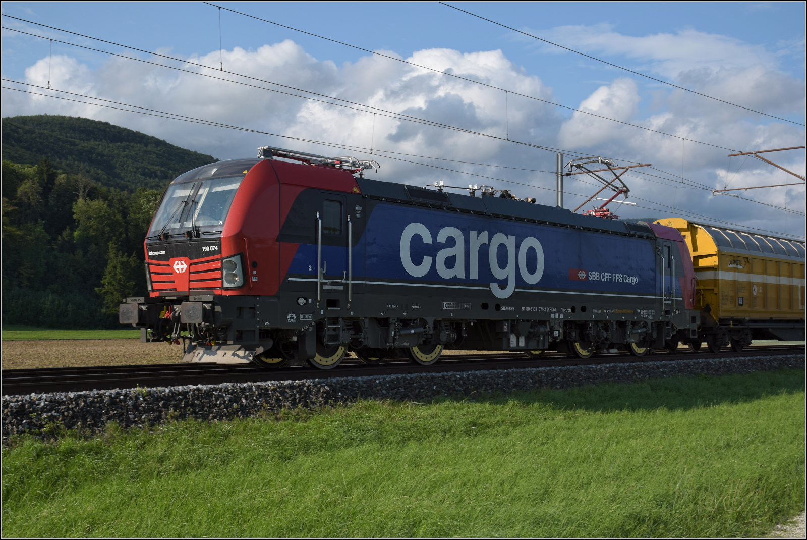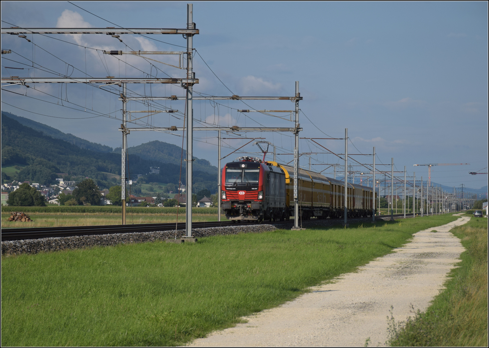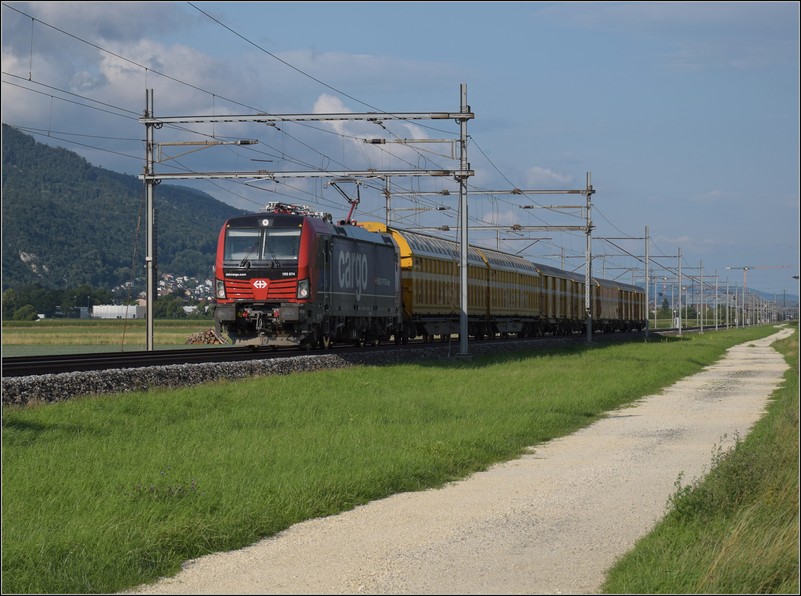 Feindliche Übernahme der Postzüge durch die neuen geleasten Vectronen. 193 074 der SBB Cargo mit dem Postzug bei Neumatten, Oberbuchsiten. August 2025. km0