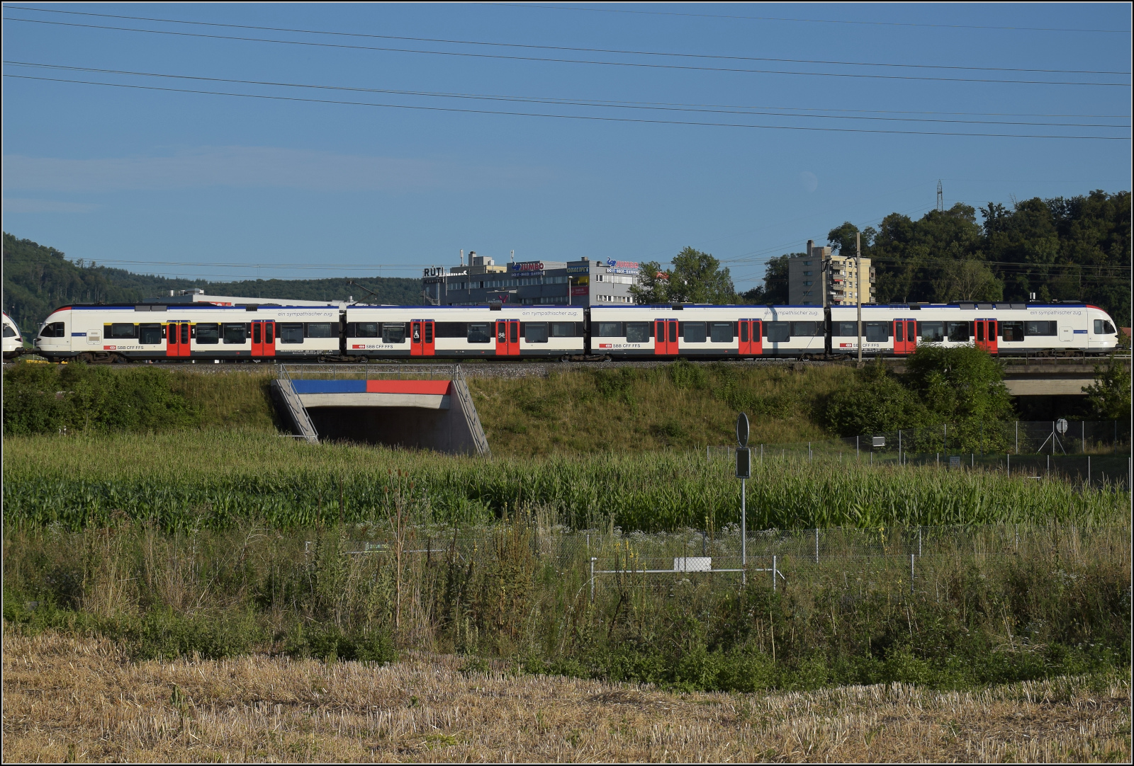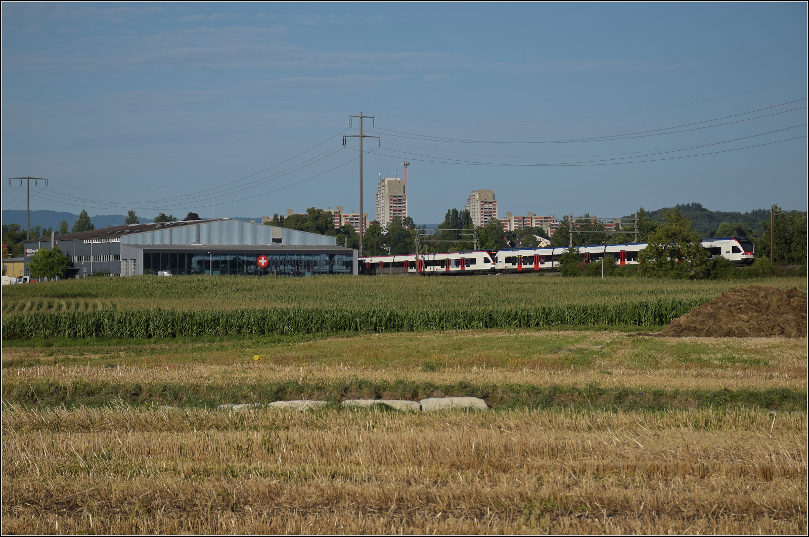Sozusagen ein Sixpack: Gleich zwei Dreifachtraktionen RABe 523 008 (im Bild), RABe 521 024 und RABe 521 027 'Gilberte de Courgenay' und RABe 523 067, RABe 523 063 und RABe 523 007 (im Bild) treffen sich in Salina Raurica. August 2025. km0