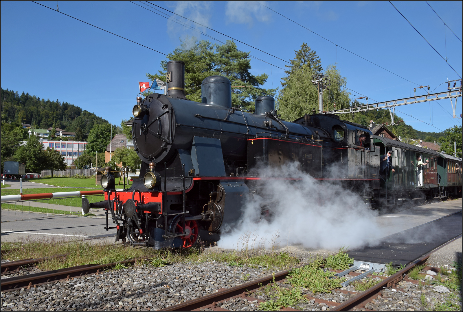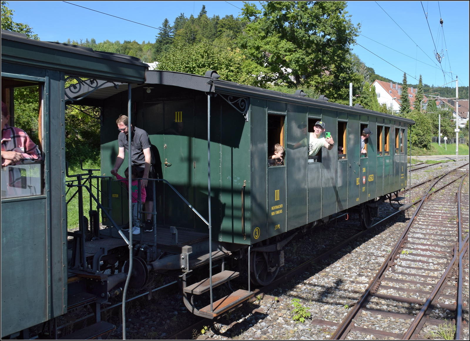 Der ehemalige Sihltalbahnwagen C 106 und war von der Sihlthalbahn als C 27 beschafft worden. Er wurde 1898 von der SIG in Neuhausen gebaut. Er fährt am Jubliäum der Tösstalbahn im Zug mit Eb 3/5 9 mit. Bäretswil, September 2025. km0