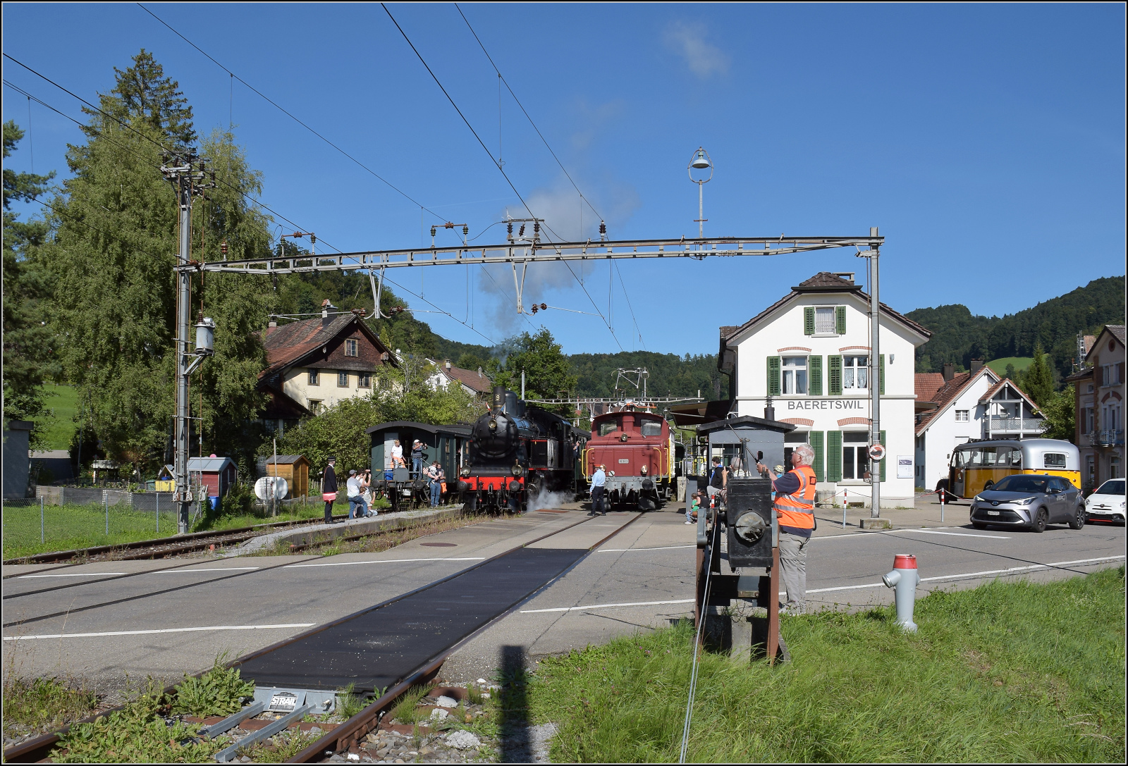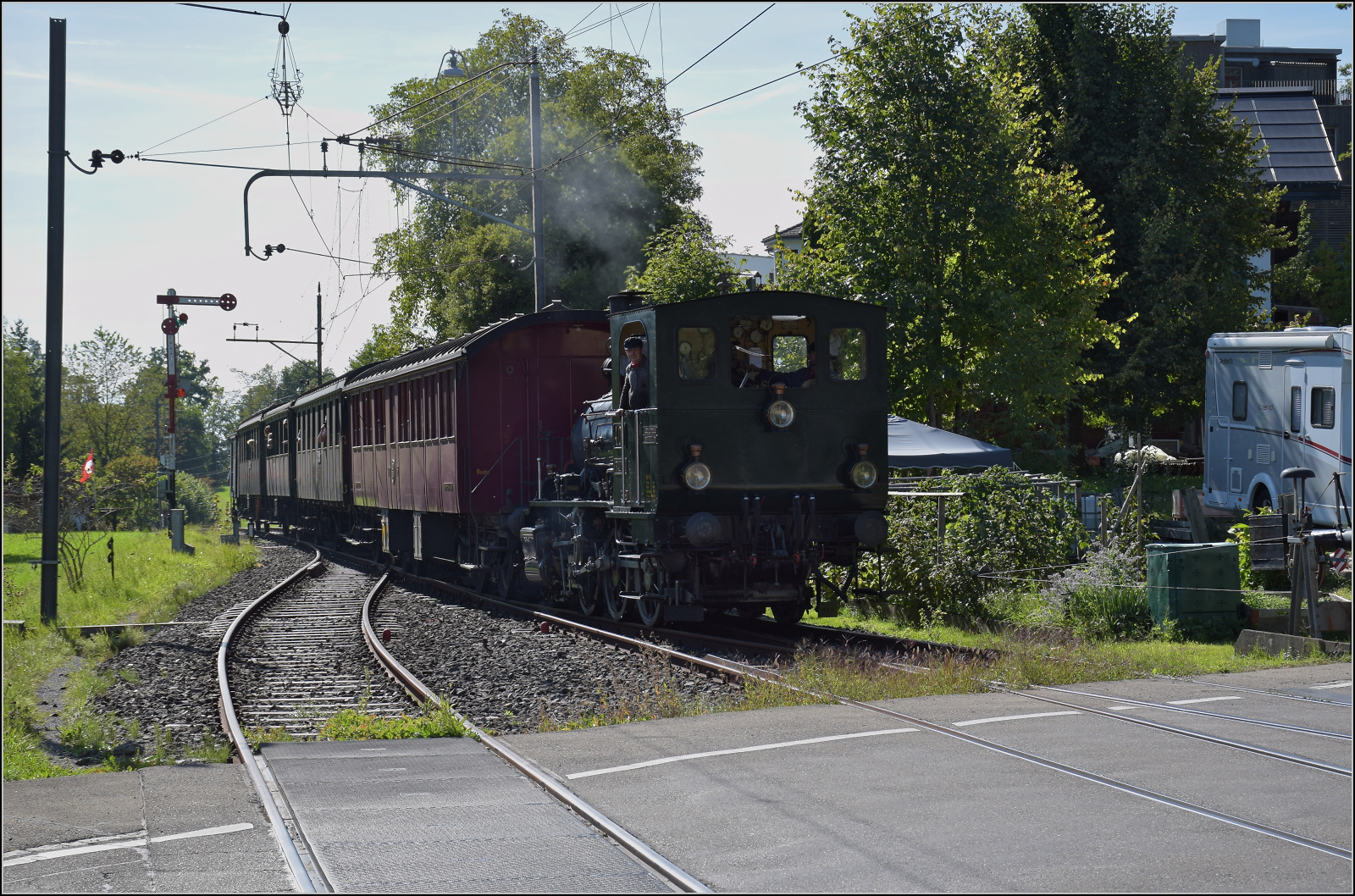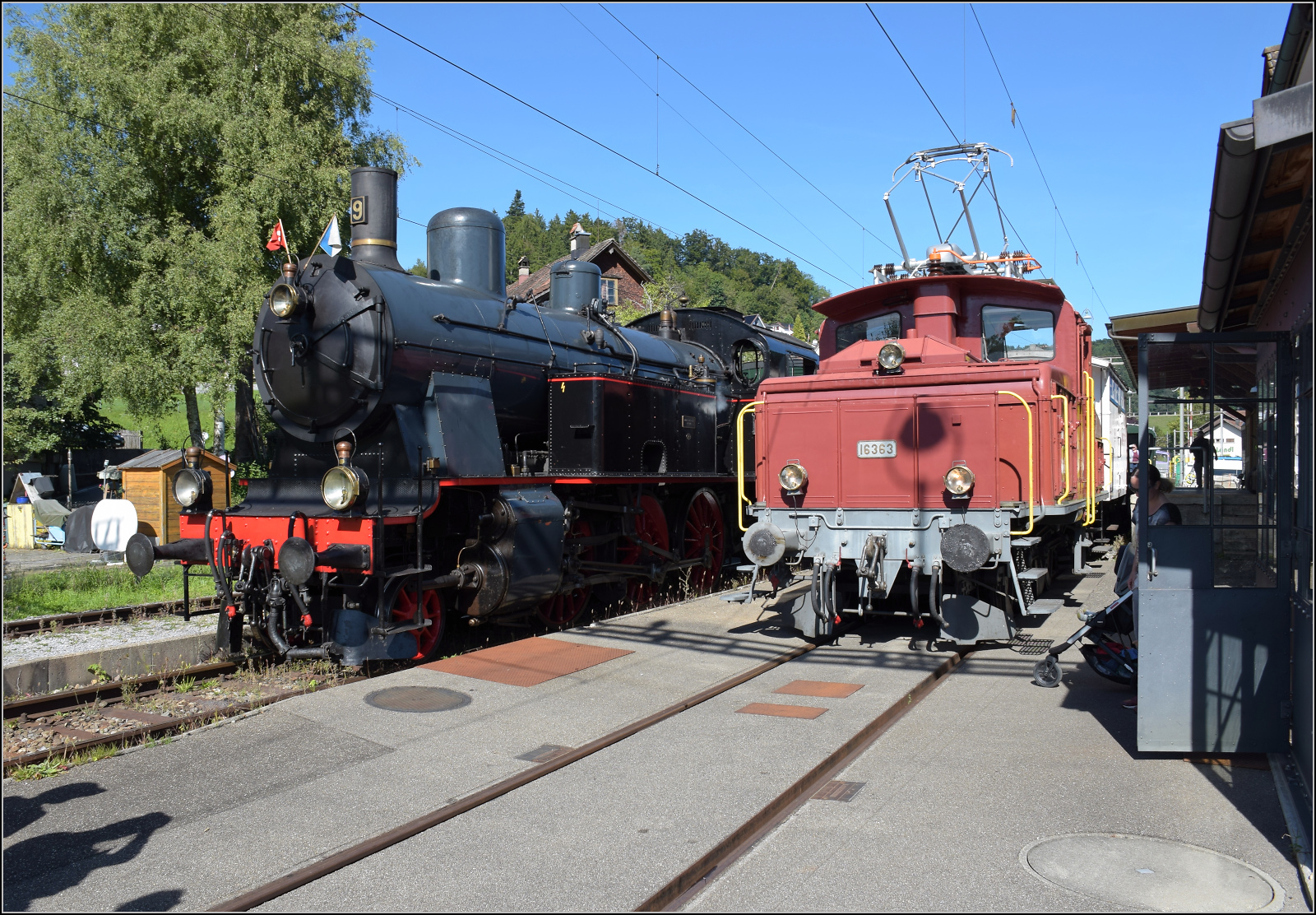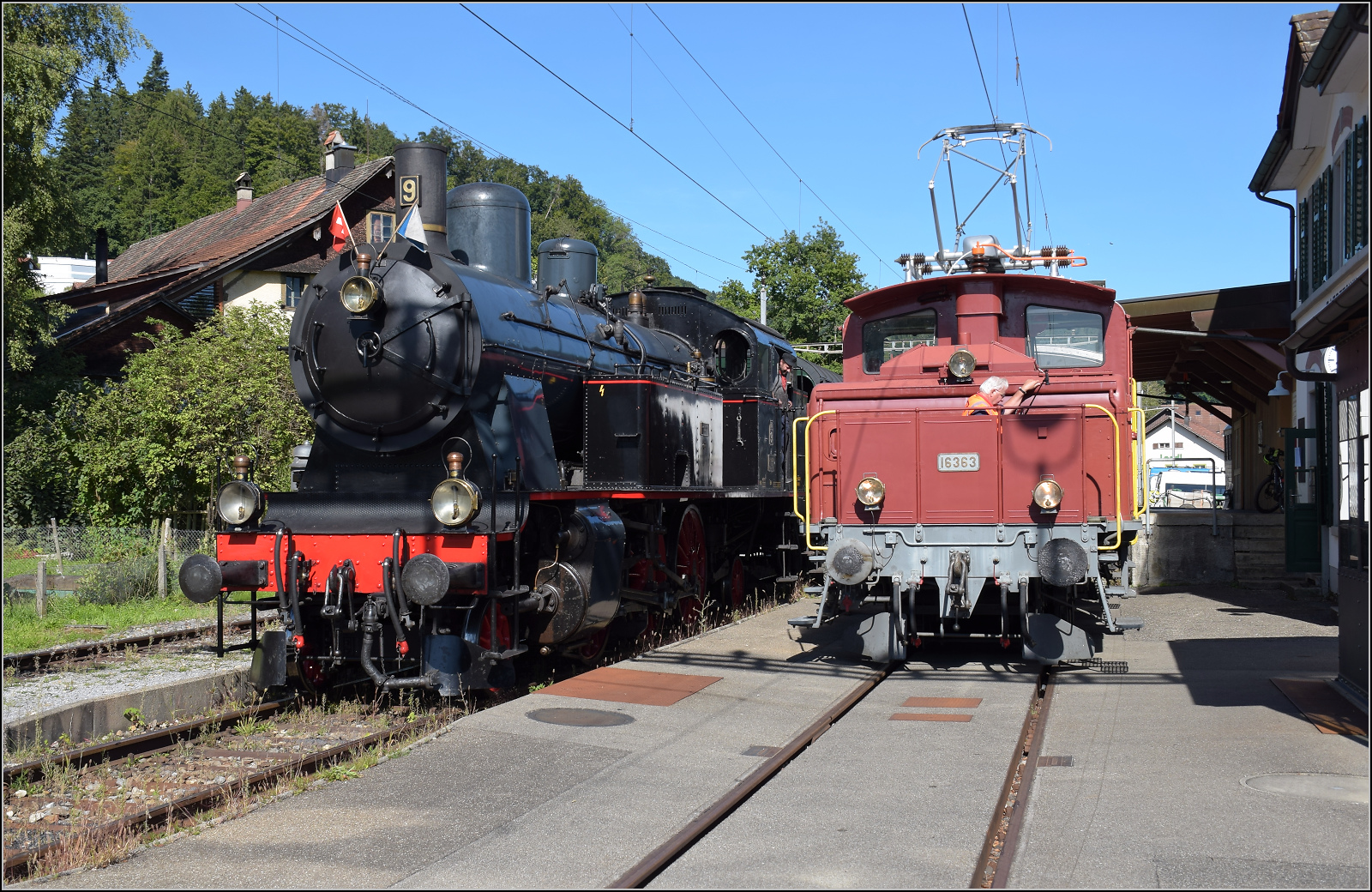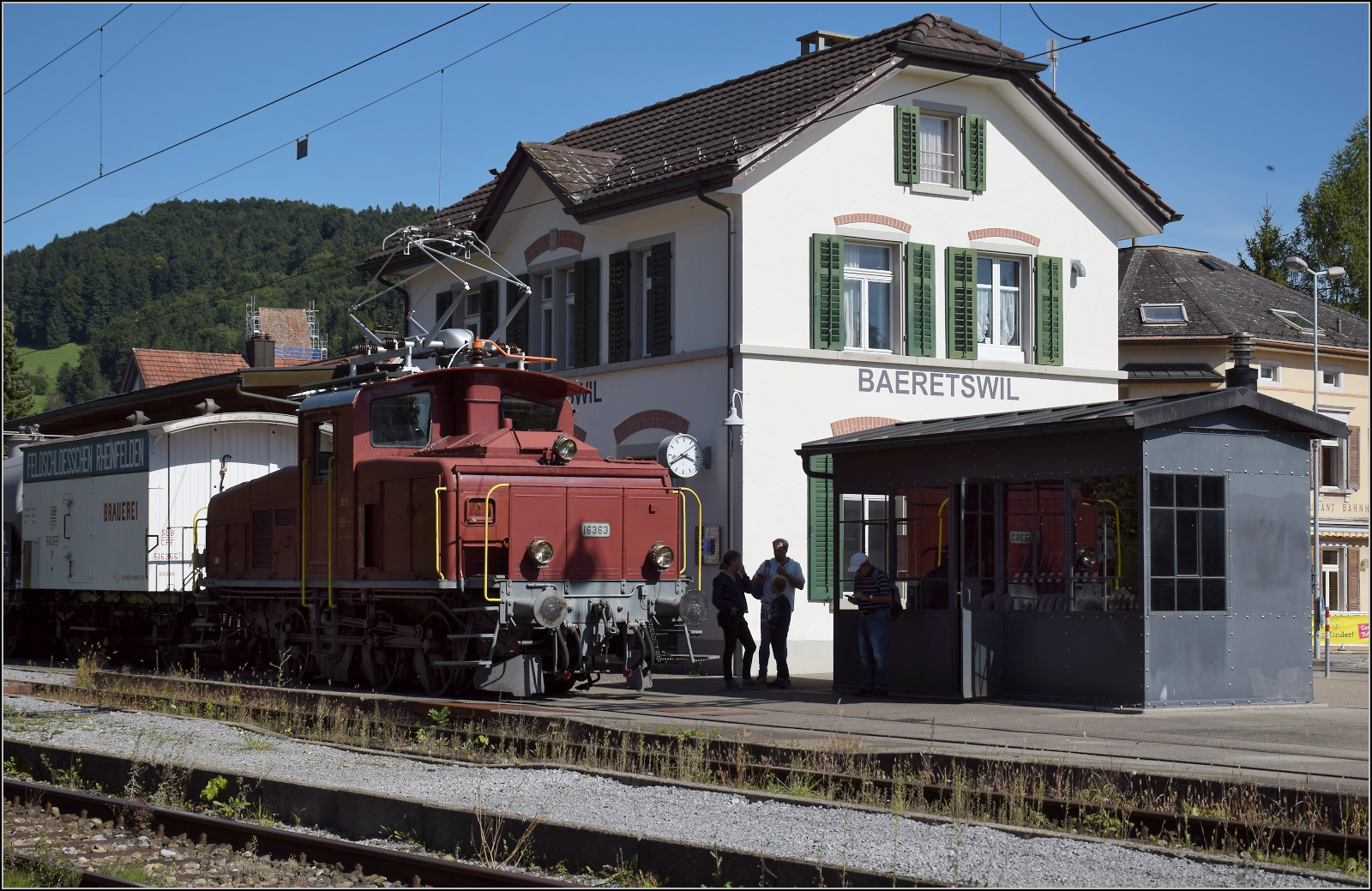 Kleine Szene vor drei Zügen in Bäretswil Ee 3/3 16363 und Eb 3/5 9 im Bild und dem Gegenzug mit Ed 3/3 401 in Bäretswil. September 2025. km0
