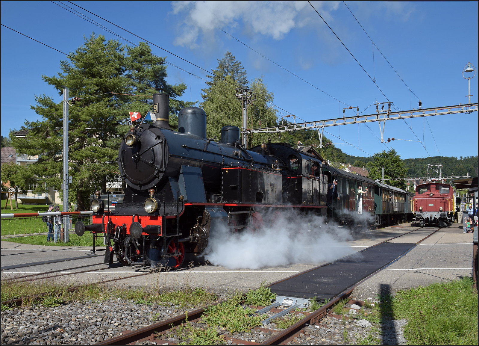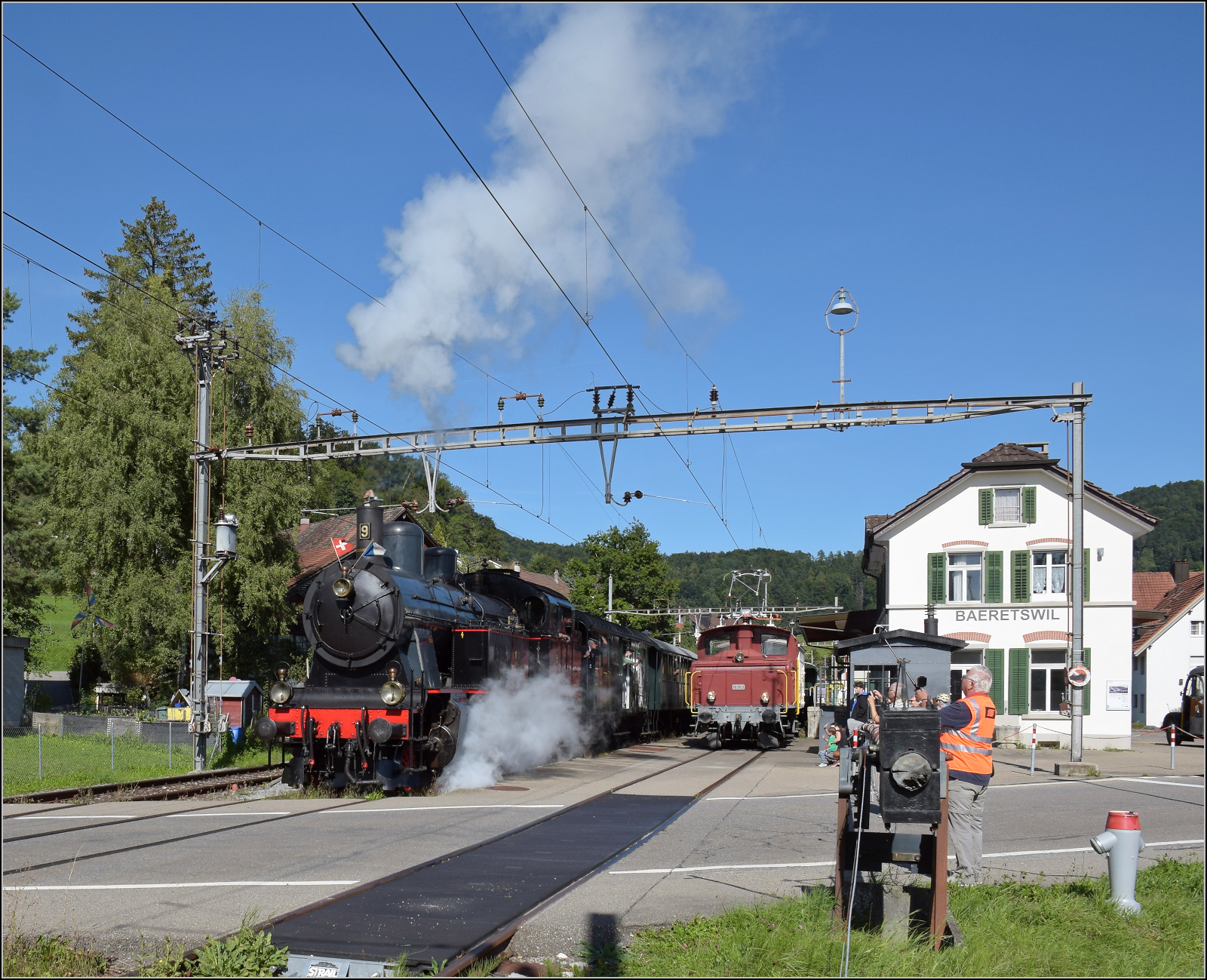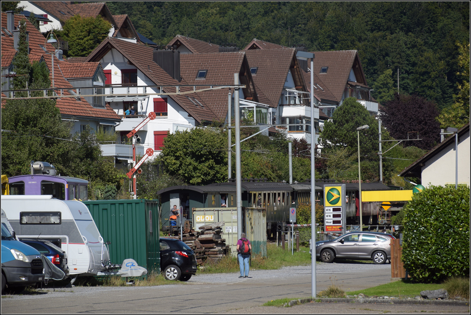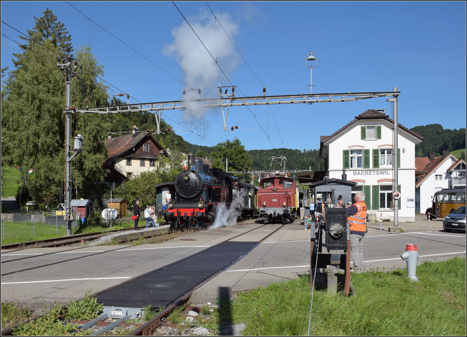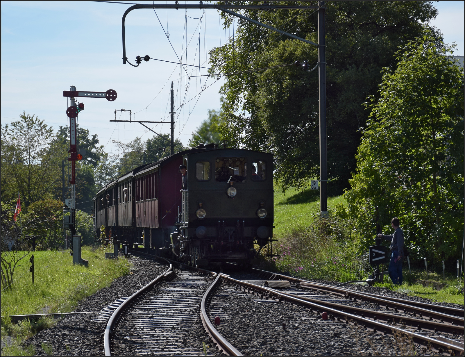 Kleine Szene vor drei Zügen in Bäretswil Ee 3/3 16363 und Eb 3/5 9 im Bild und dem Gegenzug mit Ed 3/3 401 in Bäretswil. September 2025. km0