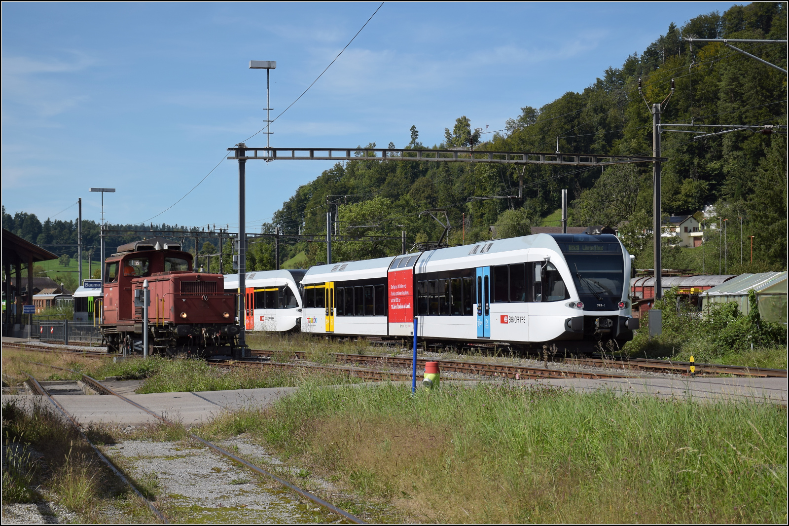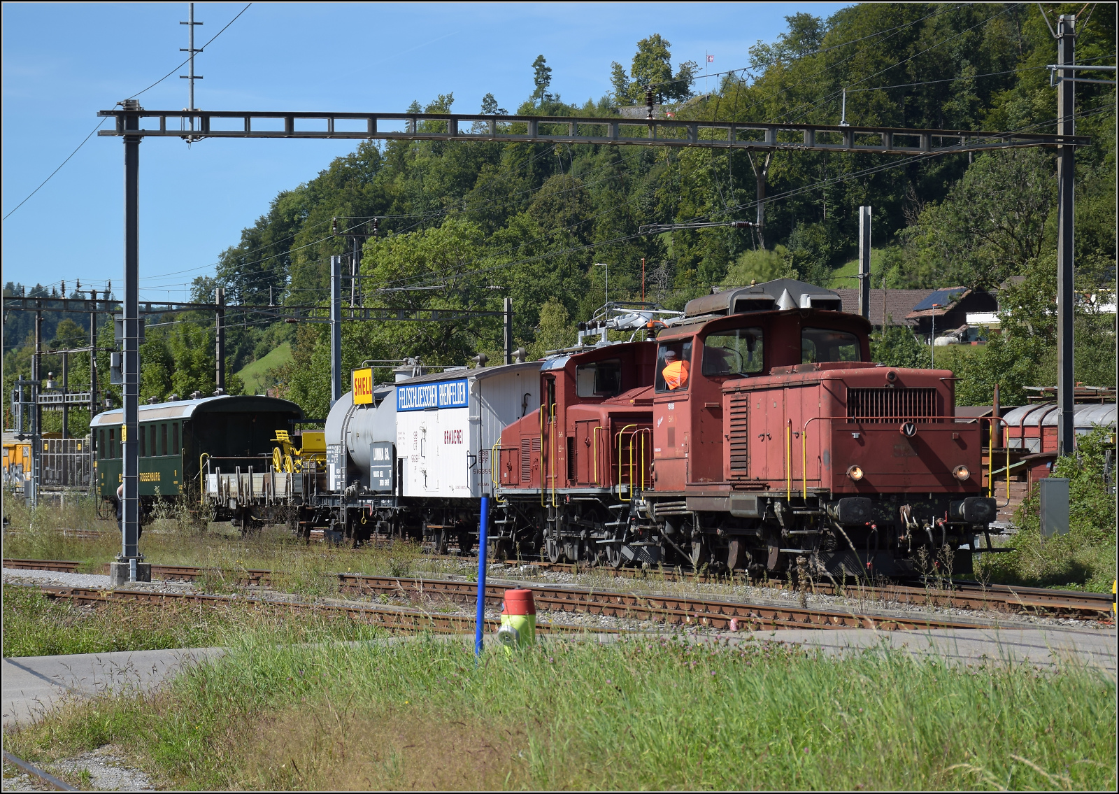 Ee 3/3 16363 in Bauma. Auf den letzten Metern ohne Fahrdraht in Bauma benötigt sie den Escort Service von Em 3/3 18815 'Sara'. September 2025. km0